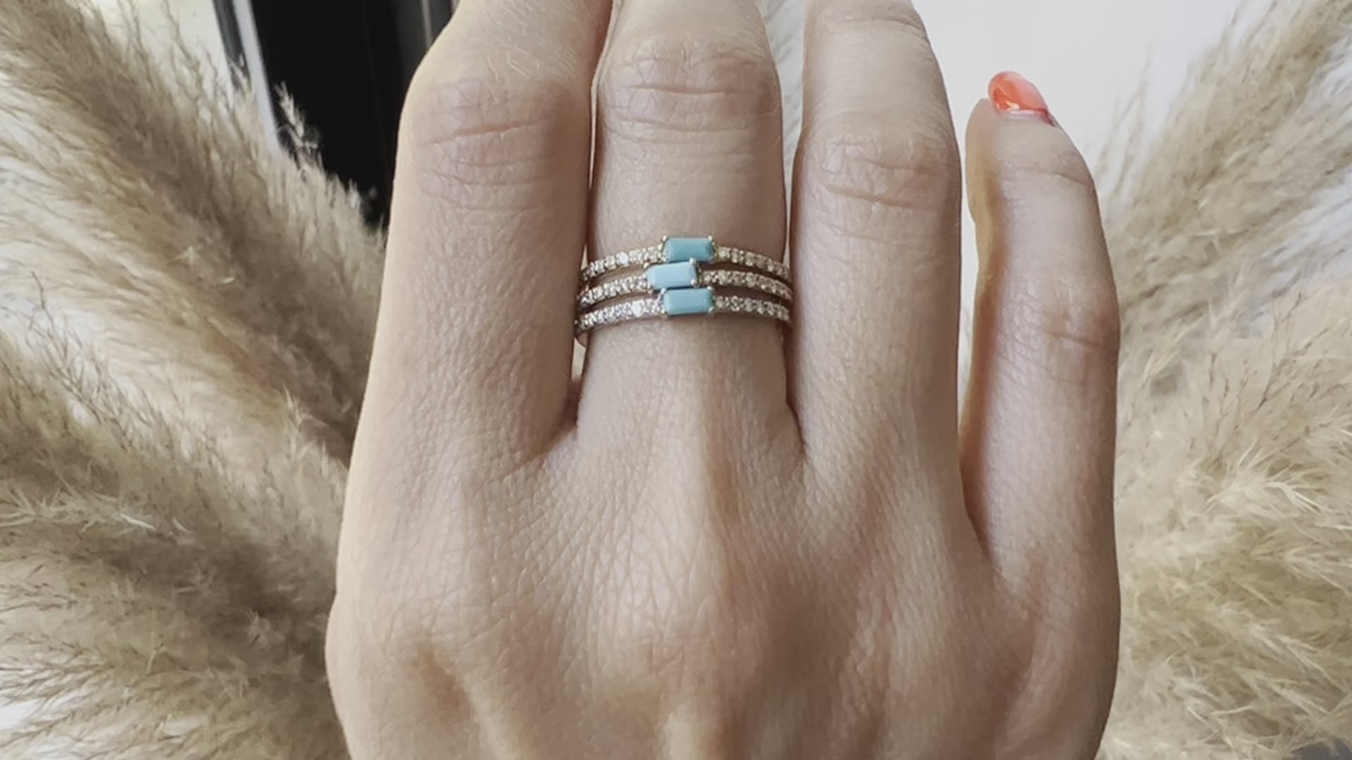 Handcrafted from 14K gold, this exquisite ring features a striking centerpiece adorned with genuine baguette-shaped turquoise, evoking a sense of timeless elegance. The captivating turquoise is complemented by shimmering round diamonds on either side, adding a touch of brilliance and sophistication to the design. Whether worn alone as a statement piece or stacked with your favorite rings, this piece effortlessly exudes style and charm, making it a versatile addition to any jewelry collection.