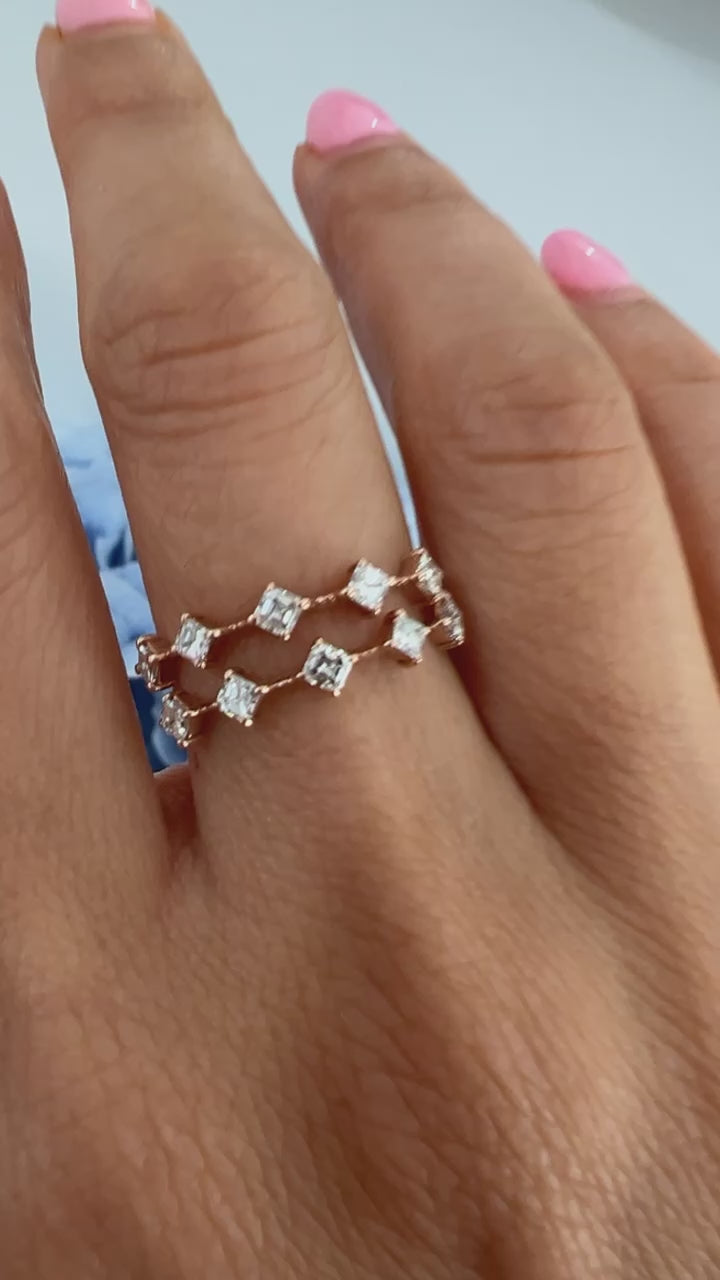 Crafted in 14K gold, our exquisite halfway eternity wedding band showcases mesmerizing Asscher-cut lab-grown diamonds, each elegantly set within a bezel setting. The sleek design exudes modern sophistication, while the timeless Asscher cut adds a touch of classic elegance. Whether worn alone as a symbol of everlasting love or paired with our enchanting engagement rings, this band epitomizes enduring beauty and grace.