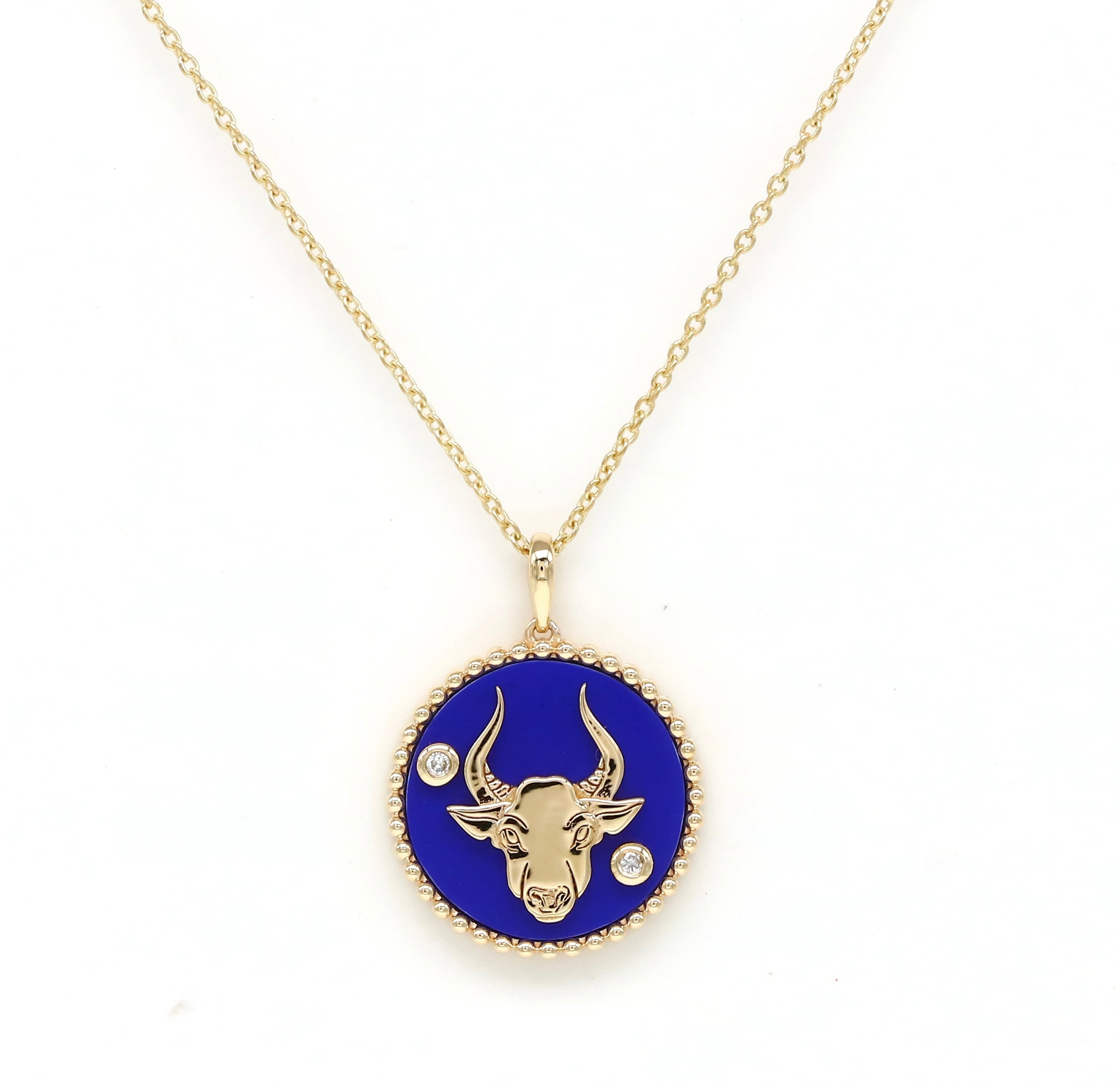 This trendy medallion is a subtle yet stylish way to showcase a personalized touch. It is ideal for wearing alone or layering with other pieces. Featuring the Taurus Horoscope symbol for those born between April 20 and May 20, its chic and streamlined design makes it a standout choice. The bold and sparkling Horoscope charm is beautifully crafted in 14K gold with a Lapis surface and adorned with two round glistening diamonds on the facade and beaded detailing on the edge. This stunning piece serves as the perfect centerpiece to enhance your layered look.