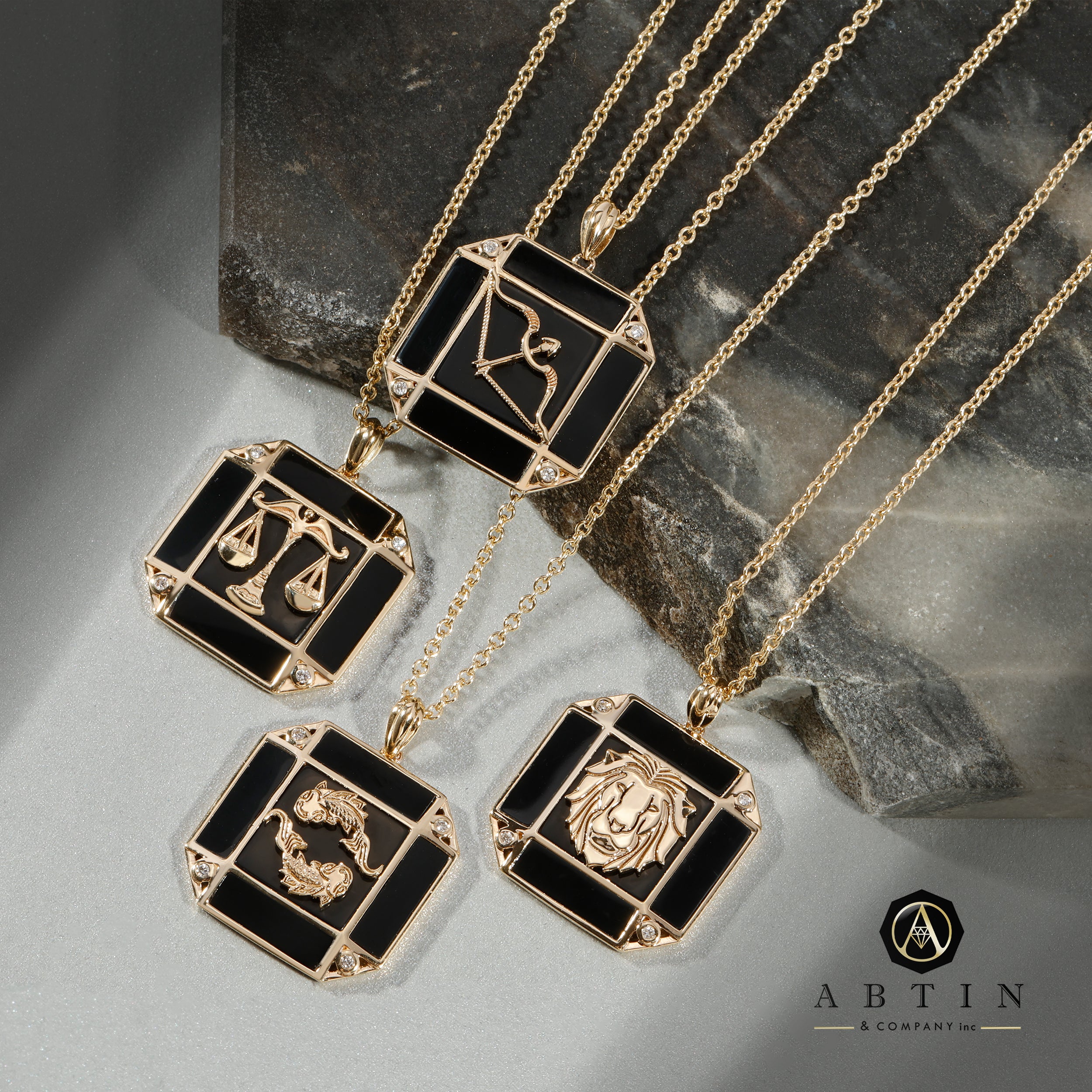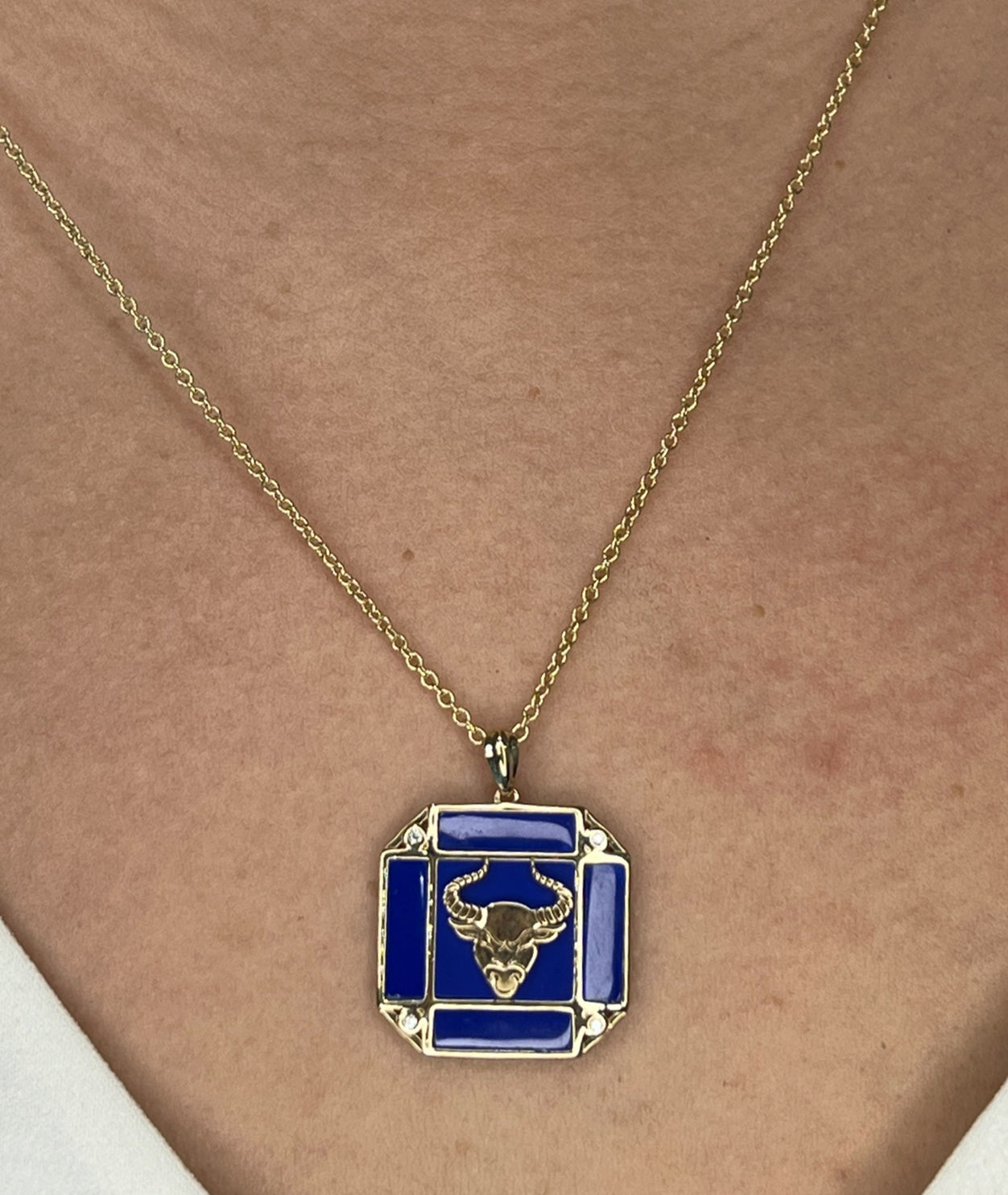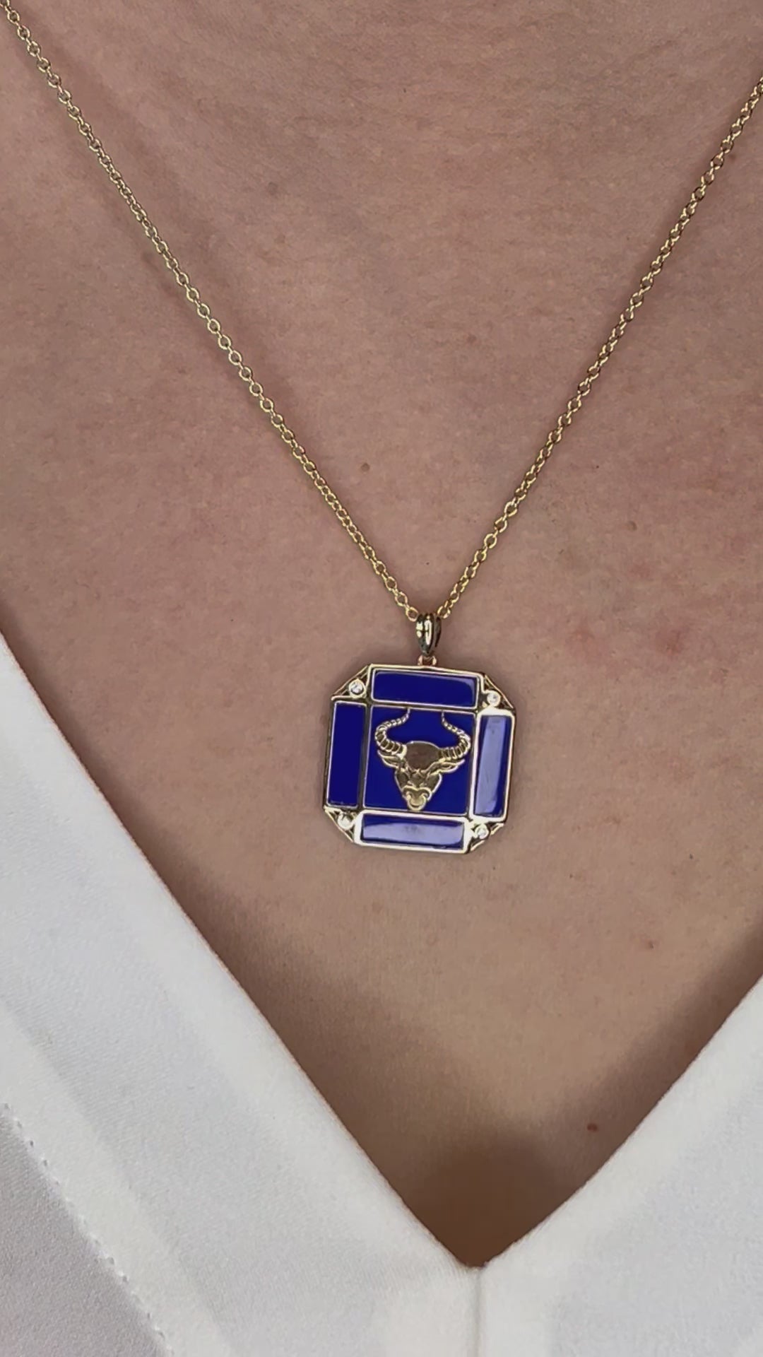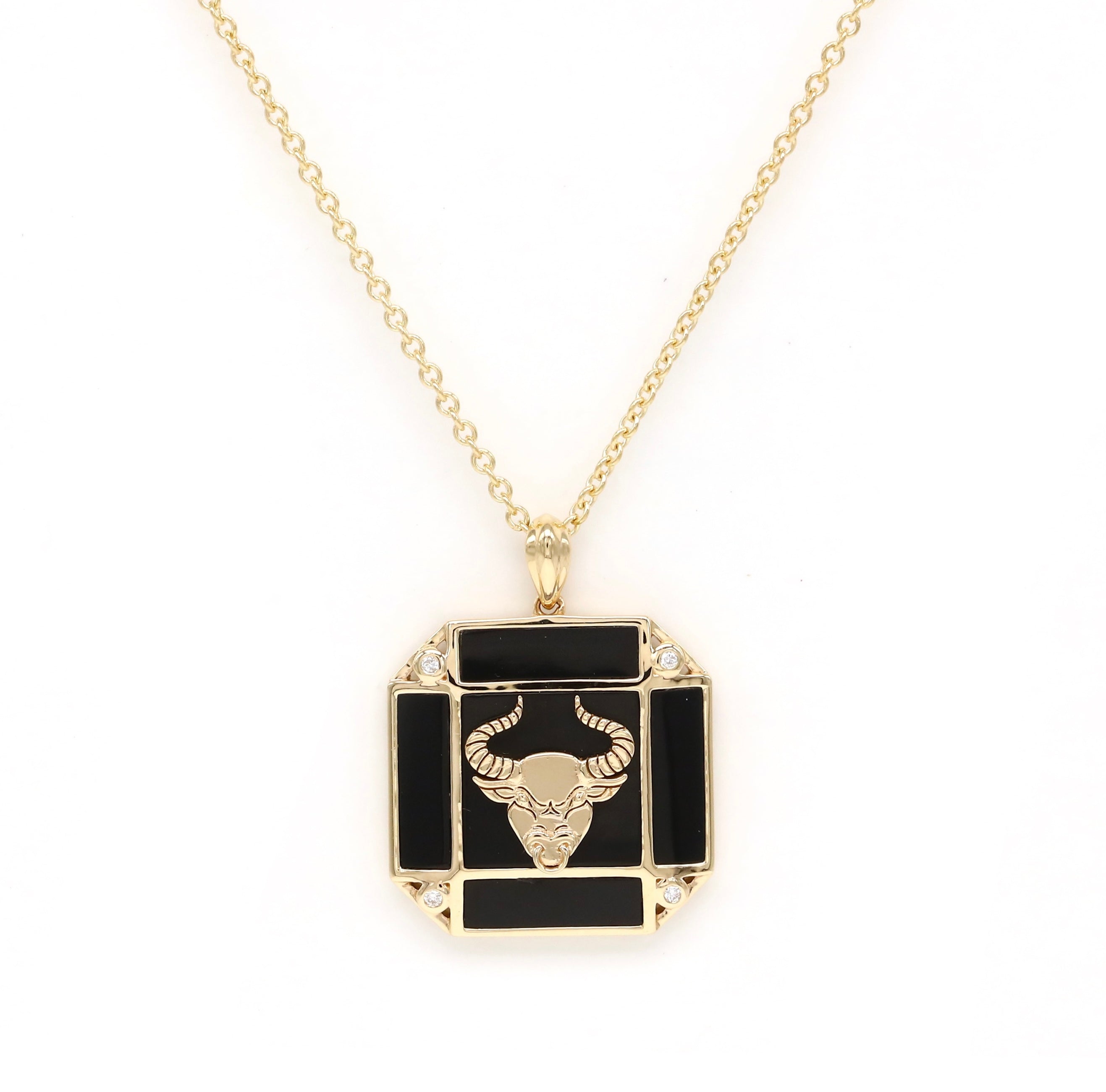 This trendy square pendant is a subtle yet stylish way to showcase a personalized touch. It is ideal for wearing alone or layering with other pieces. Featuring the Taurus Horoscope symbol for those born between December 22 and January 19, its chic and streamlined design makes it a standout choice. The bold and sparkling Horoscope charm is beautifully crafted in 14K yellow gold with an Onyx surface adorned with four round glistening diamonds on the corners. This stunning piece serves as the perfect centerpiece to enhance your layered look.