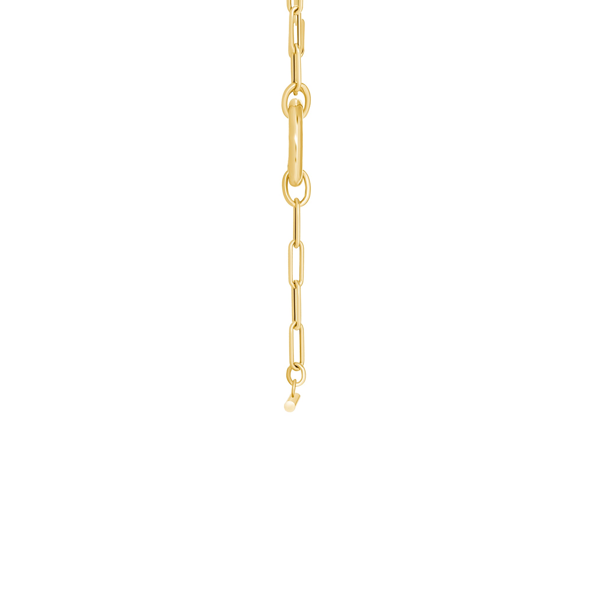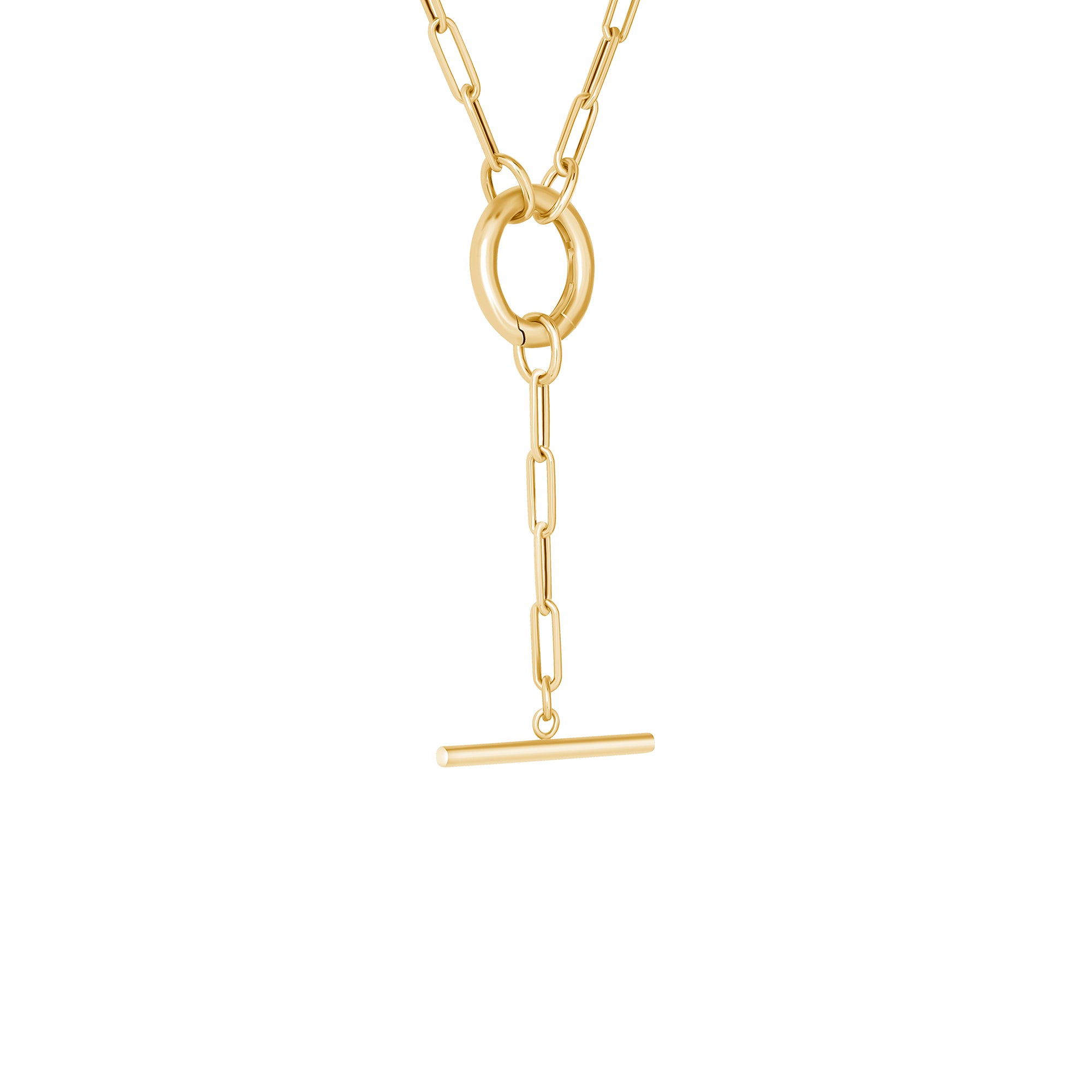 The 14K Gold Chunky Paperclip Toggle Lariat Necklace combines bold design with everyday versatility. Crafted in solid 14K gold, it features a chunky paperclip chain, a polished O-ring toggle, and a removable drop element that creates a modern Y-shaped silhouette. The toggle clasp opens easily, allowing the drop element to be removed and replaced with any charm of your choice, making this necklace fully customizable. Wear it as a statement on its own or personalize it to reflect your style.