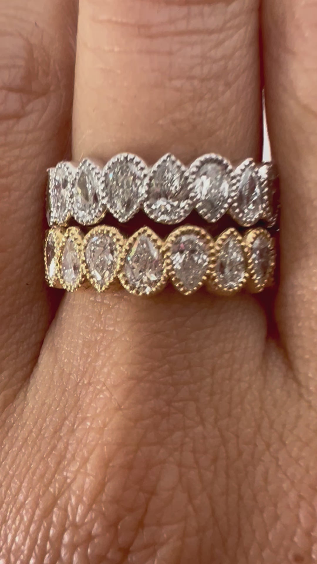 Fashioned as a wedding band in 14K gold, this stunning piece features alternating direction milgrain bezel-set pear-cut diamonds encircling three-quarters of the ring. The meticulous arrangement of diamonds, with their bezel settings alternating in direction, creates a captivating visual effect that adds depth and dimension to the design. Perfect for the discerning bride who appreciates intricate detailing, this ring combines classic elegance with modern sophistication, making it a timeless symbol of enduring love and commitment.