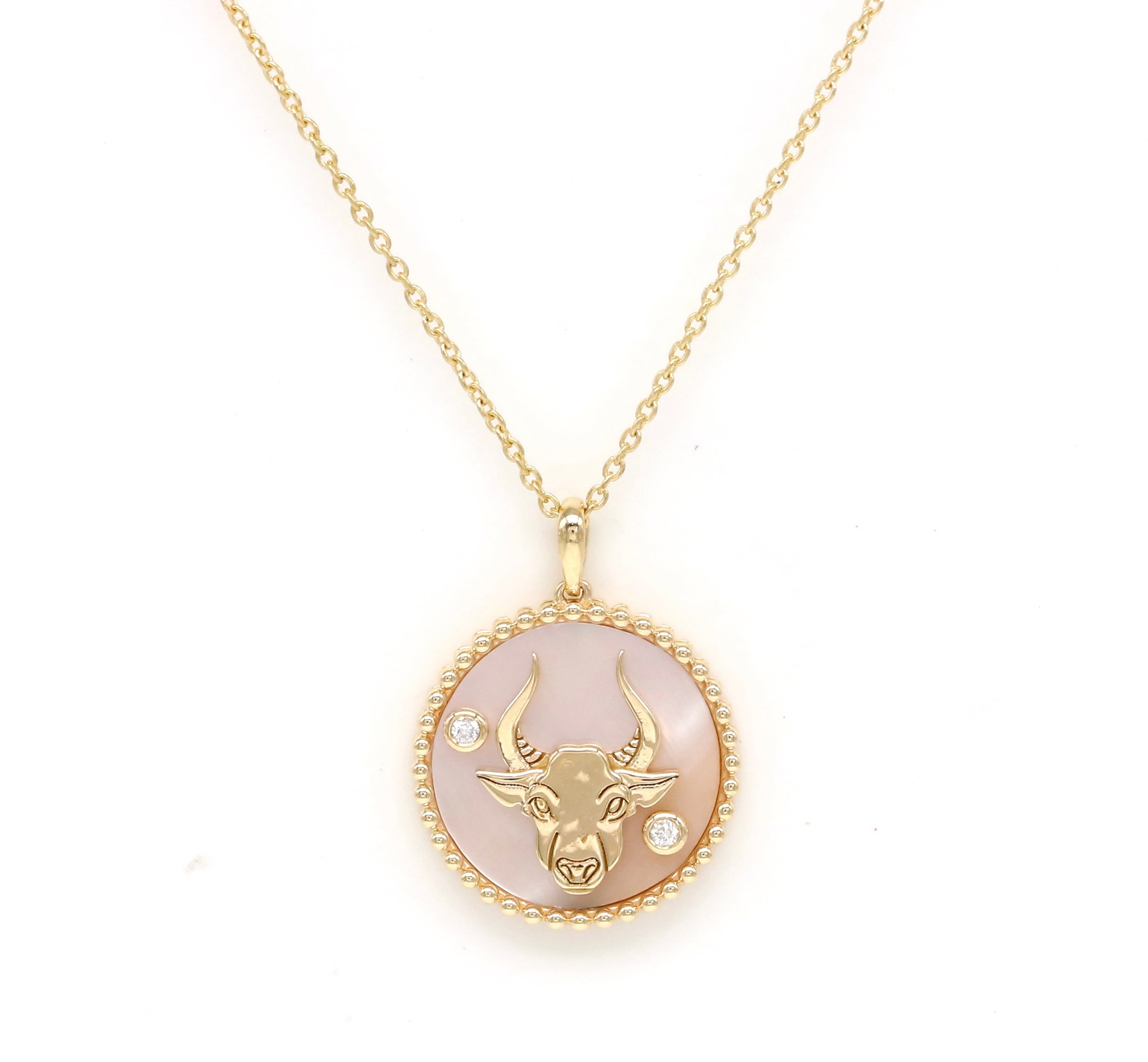 14K Gold Pink Mother of Pearl & Diamond Taurus Horoscope Medallion