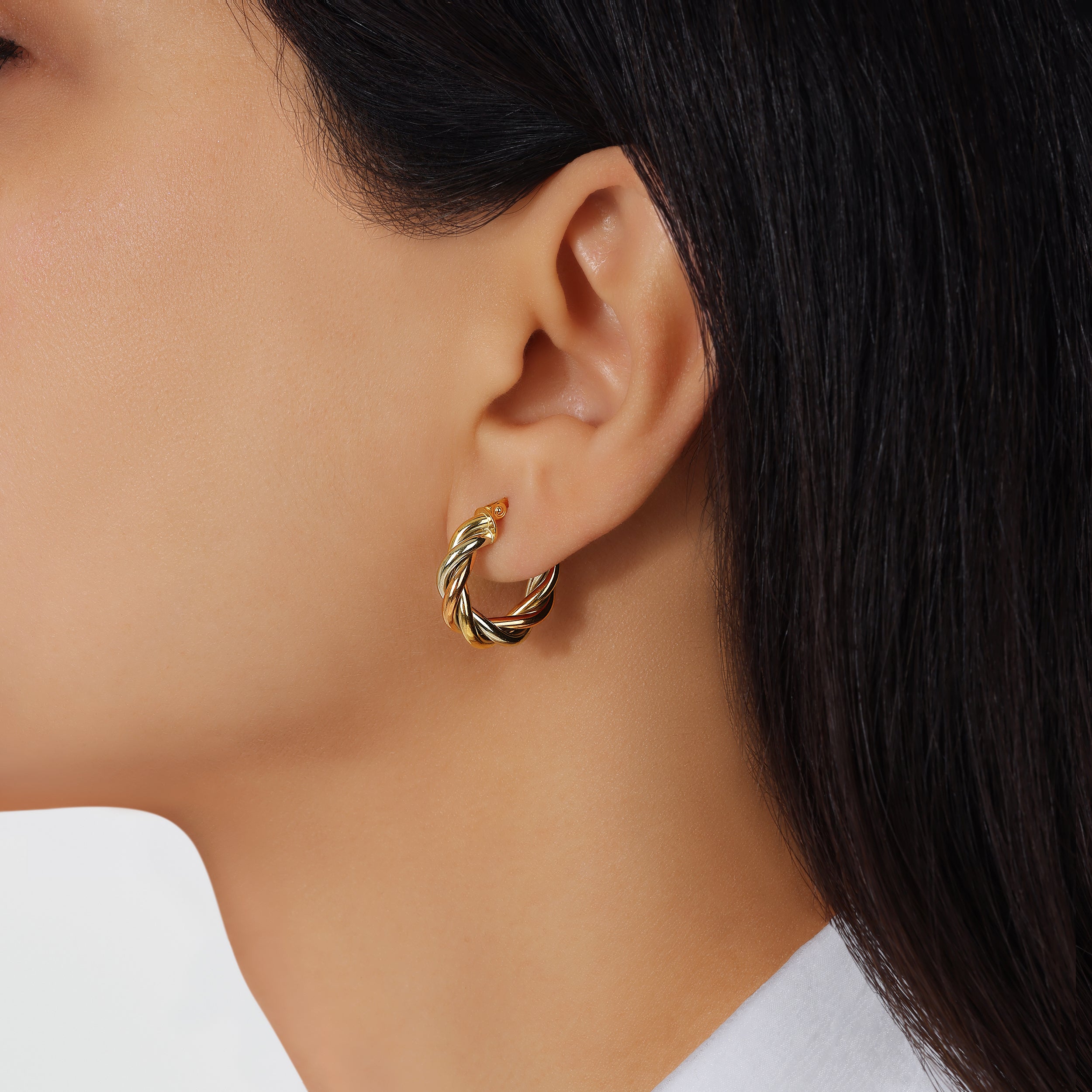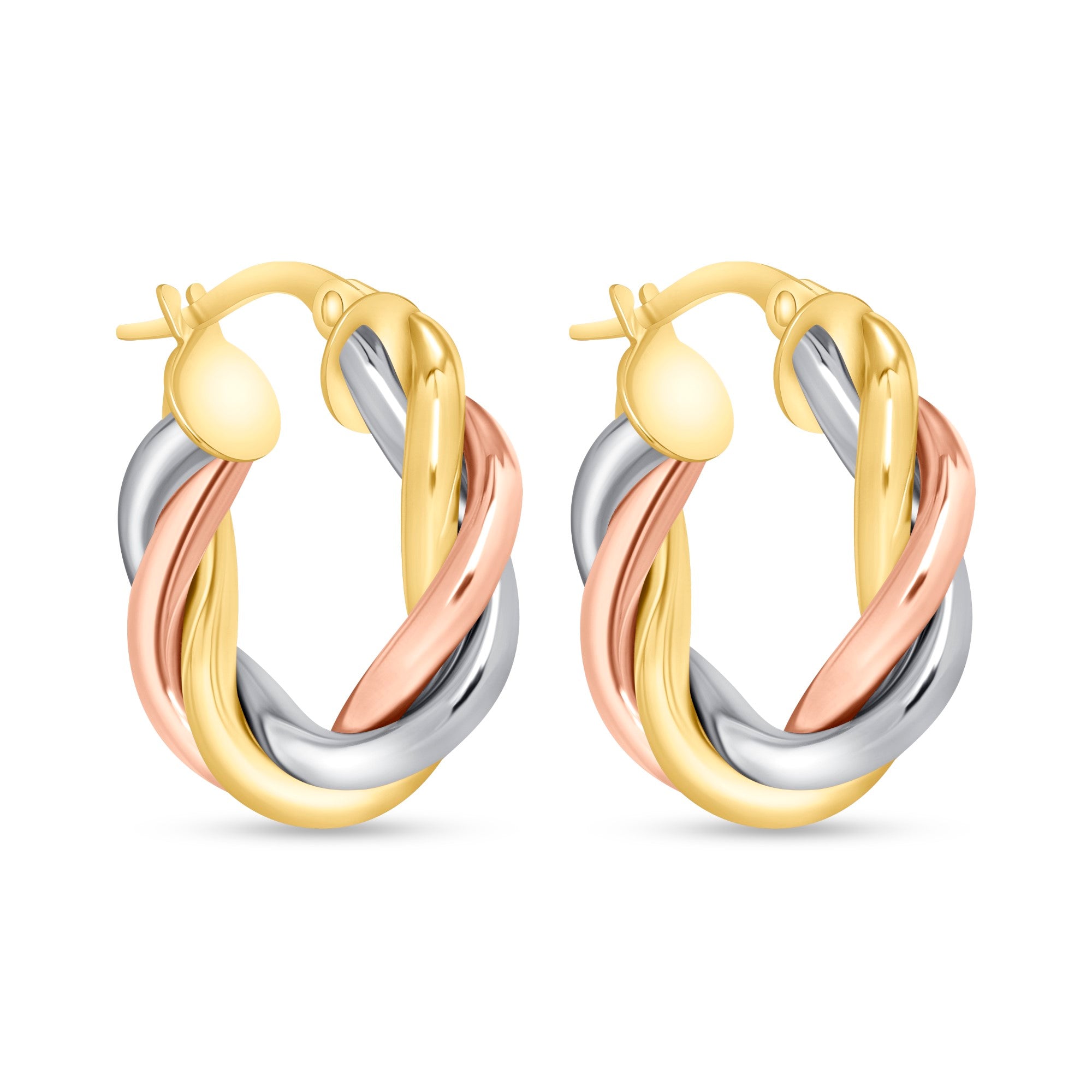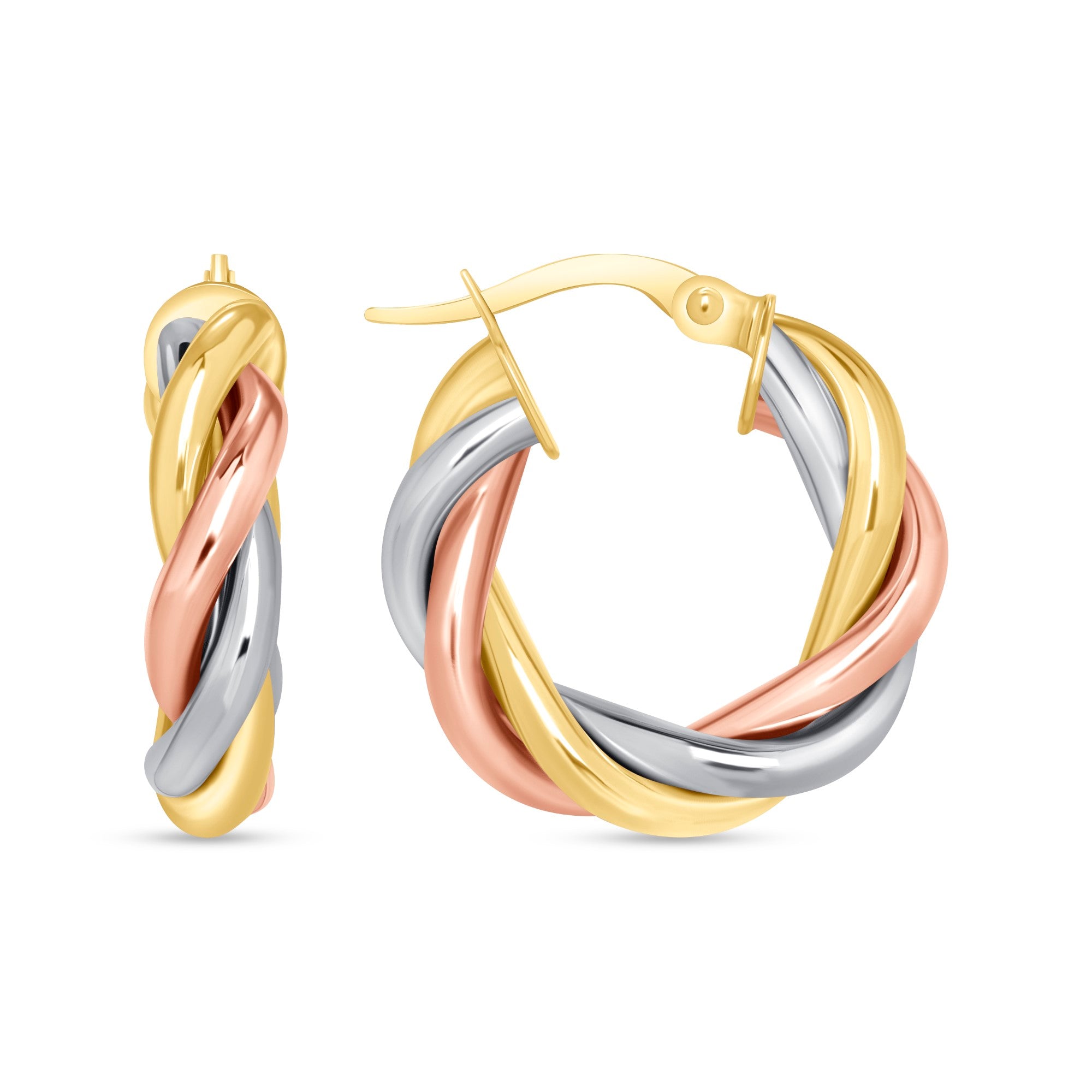 These hoop earrings offer endless versatility! Crafted from 14k yellow, white, and rose gold, they feature a stunning mix of polished and textured finishes, adding a modern twist to the classic hoop design.