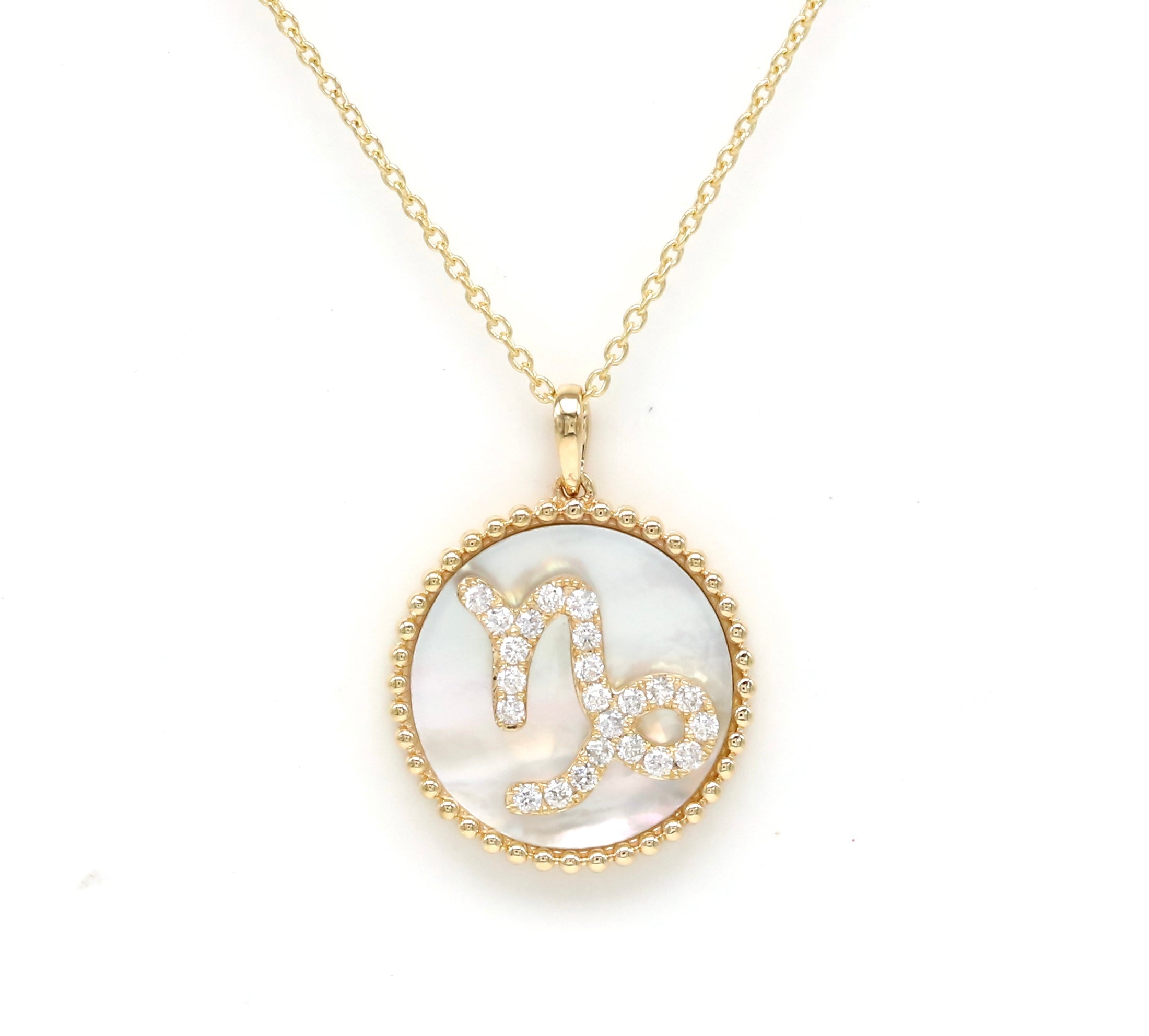 14K Gold White Mother of Pearl & Diamond Capricorn Zodiac Medallion
