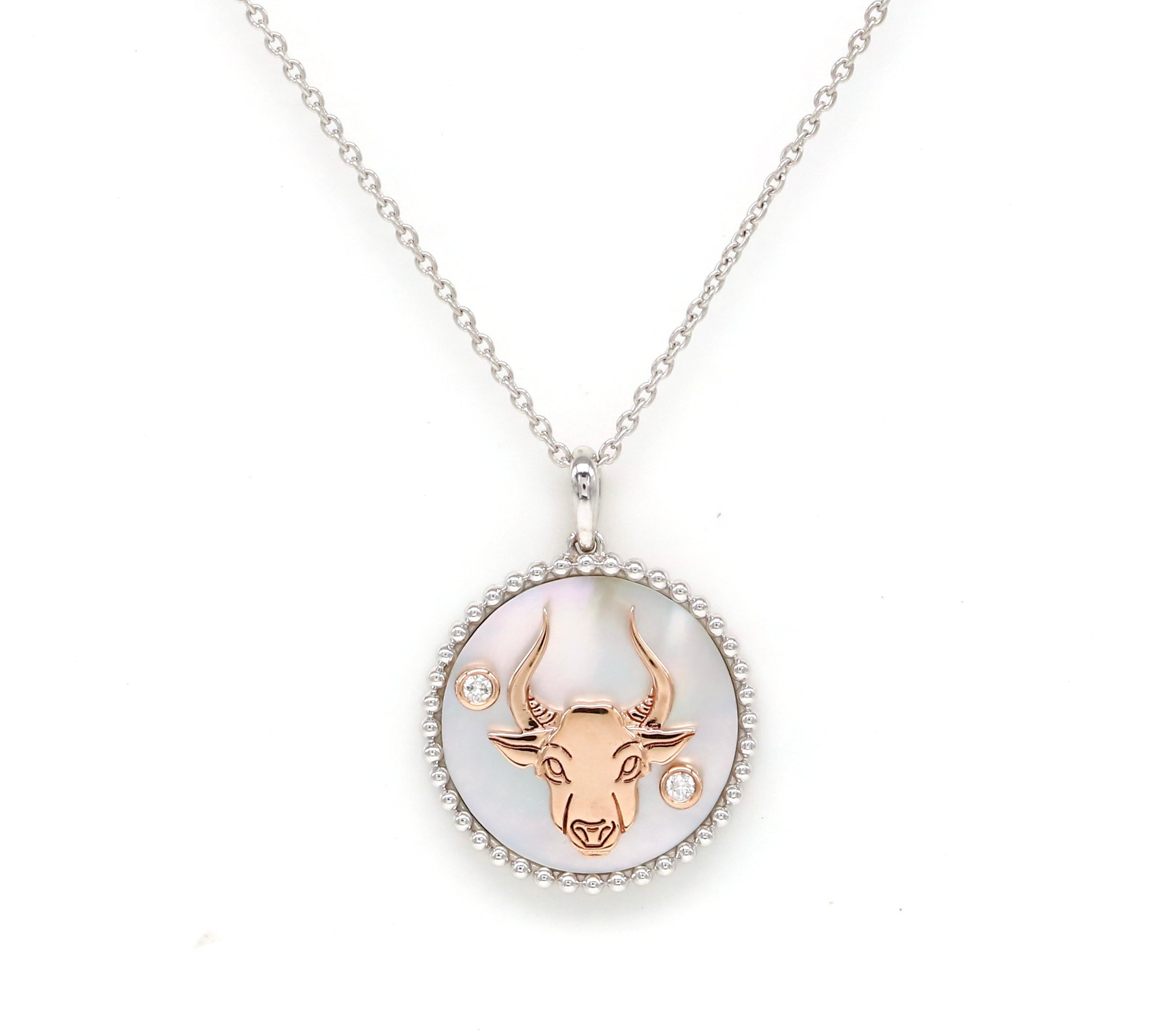 This trendy medallion is a subtle yet stylish way to showcase a personalized touch. It is ideal for wearing alone or layering with other pieces. Featuring the Taurus Horoscope symbol for those born between April 20 and May 20, its chic and streamlined design makes it a standout choice. The bold and sparkling Horoscope charm is beautifully crafted in 14K rose and white gold with a white mother-of-pearl surface and adorned with two round glistening diamonds on the facade and beaded detailing on the edge. This stunning piece serves as the perfect centerpiece to enhance your layered look.