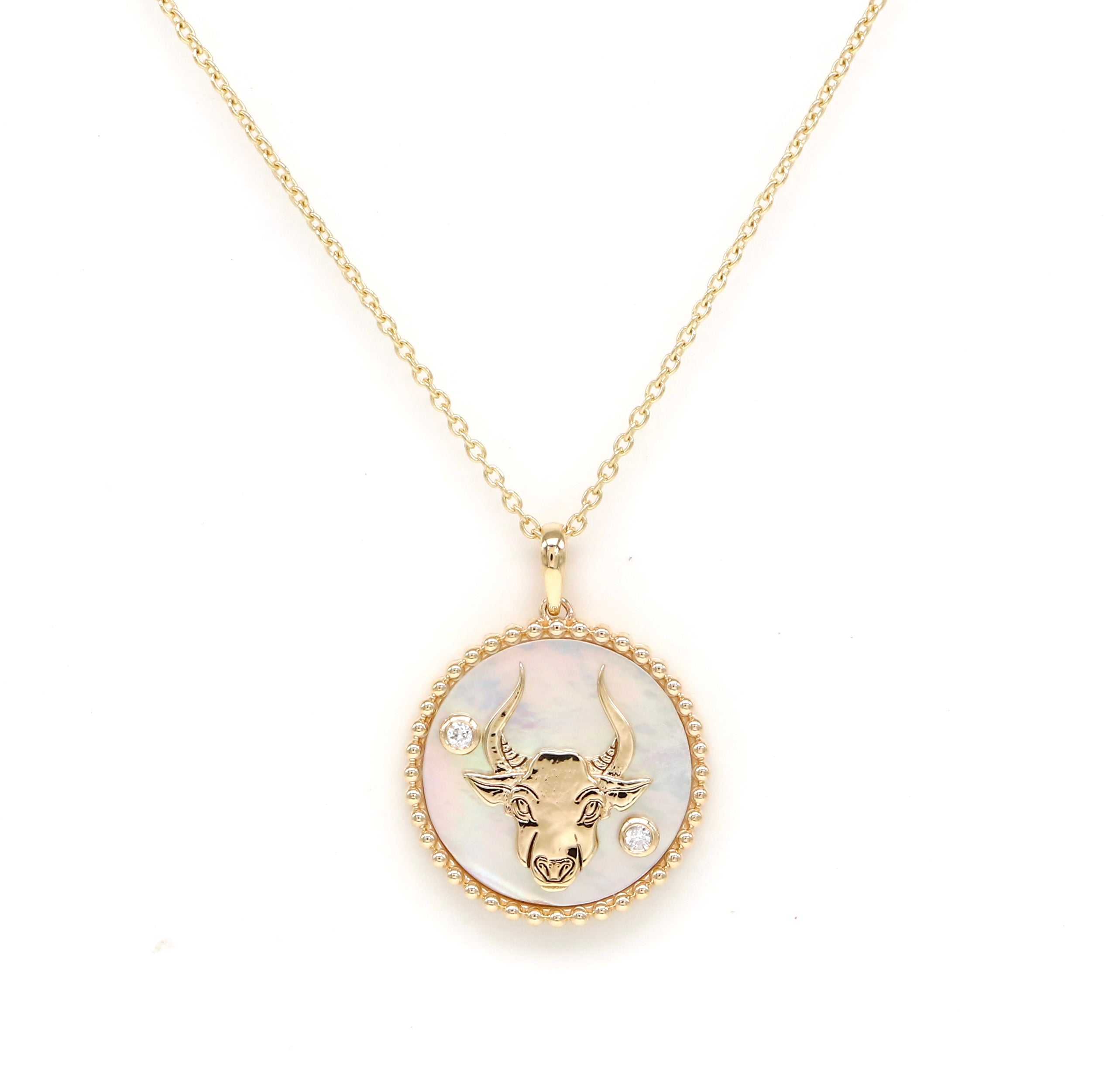 This trendy medallion is a subtle yet stylish way to showcase a personalized touch. It is ideal for wearing alone or layering with other pieces. Featuring the Taurus Horoscope symbol for those born between April 20 and May 20, its chic and streamlined design makes it a standout choice. The bold and sparkling Horoscope charm is beautifully crafted in 14K yellow gold with a white mother-of-pearl surface and adorned with two round glistening diamonds on the facade and beaded detailing on the edge. This stunning piece serves as the perfect centerpiece to enhance your layered look.