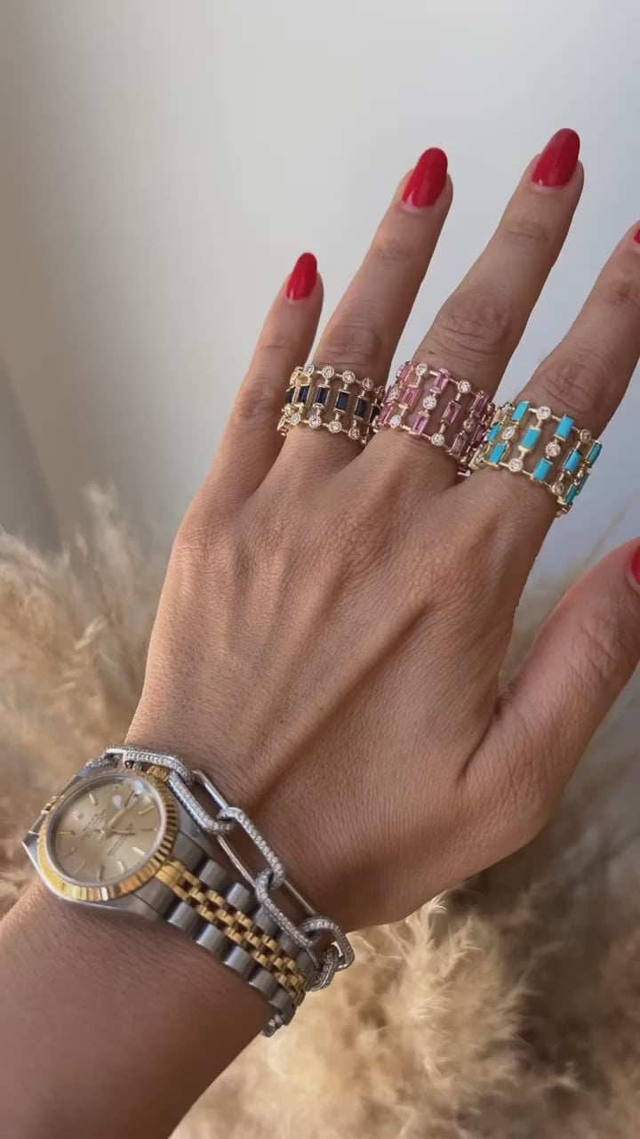 Inspired by the elegance of architectural design, this 14K yellow gold ring exemplifies grace and sophistication. The statement band features a stunning array of alternating round diamonds and baguette turquoise gemstones, each securely set in a bezel setting. This unique open ring radiates brilliance and luxury from every angle, making it a perfect choice for adding a vibrant pop of color to any ensemble. It’s a striking piece that combines modern flair with timeless charm, ideal for those who adore turquoise.