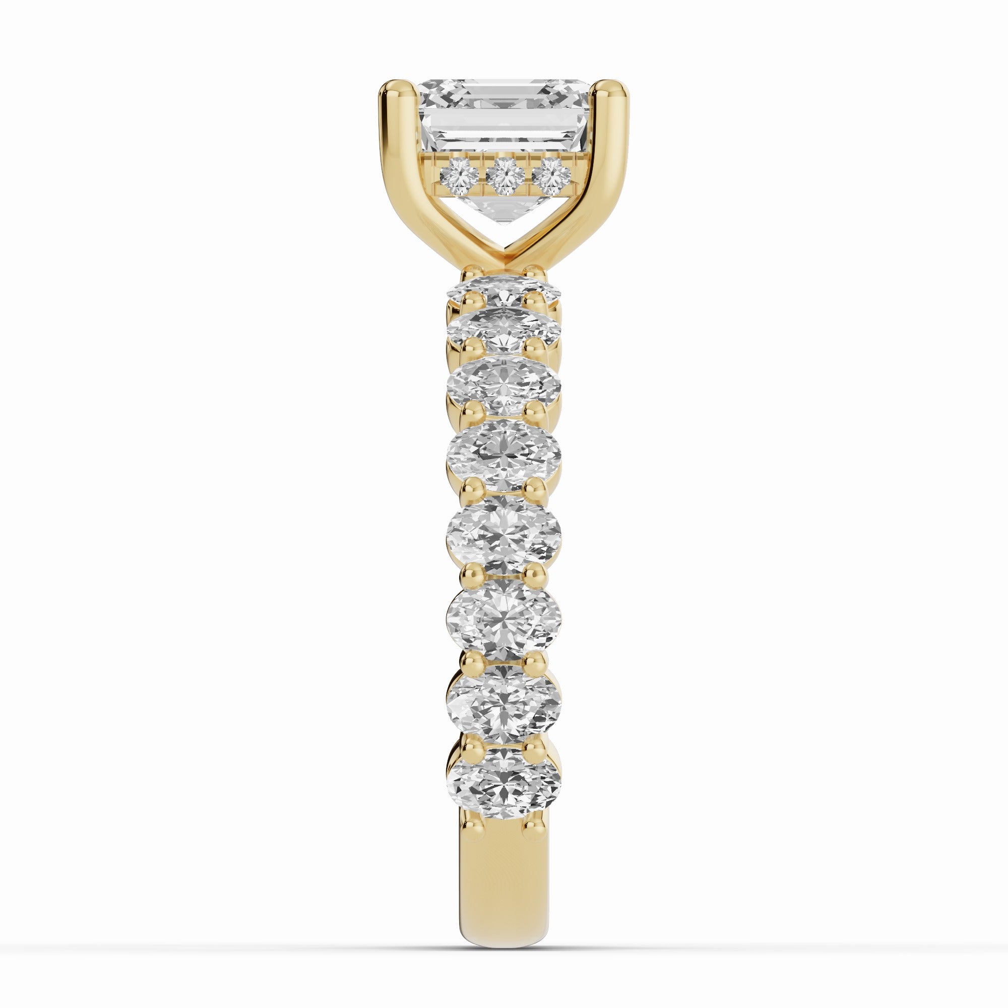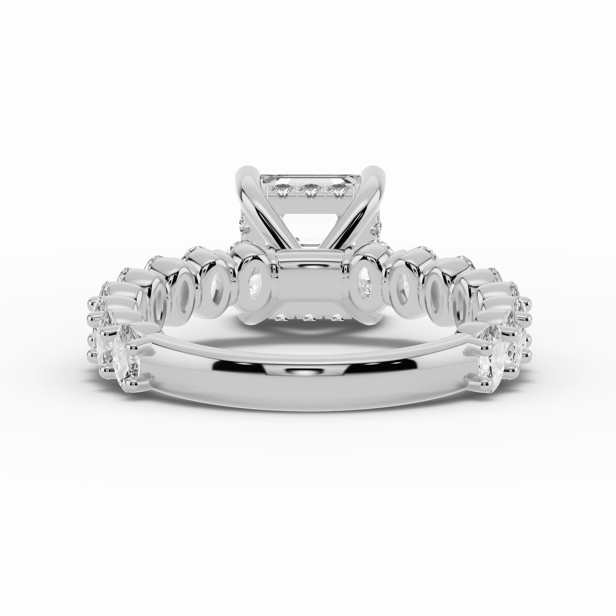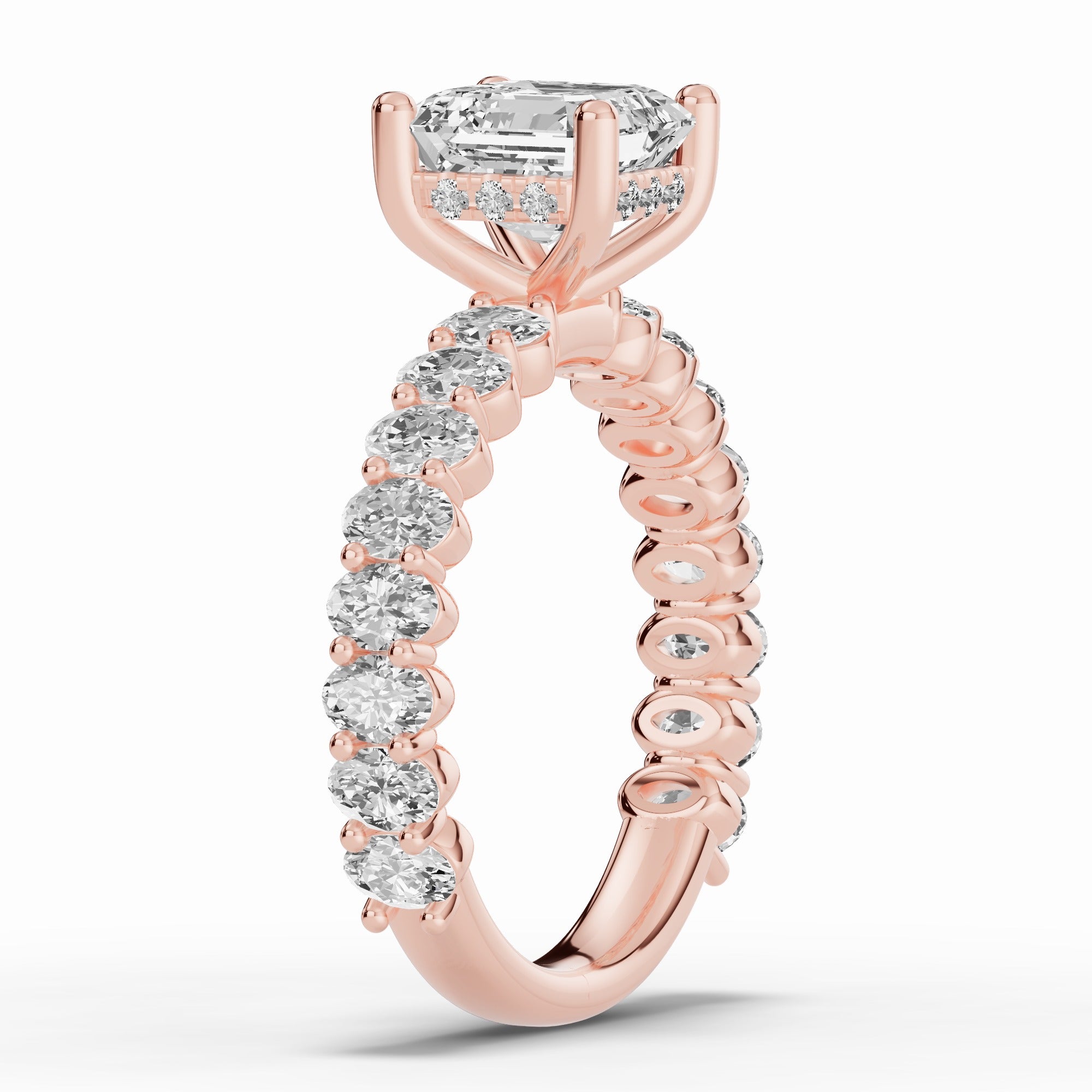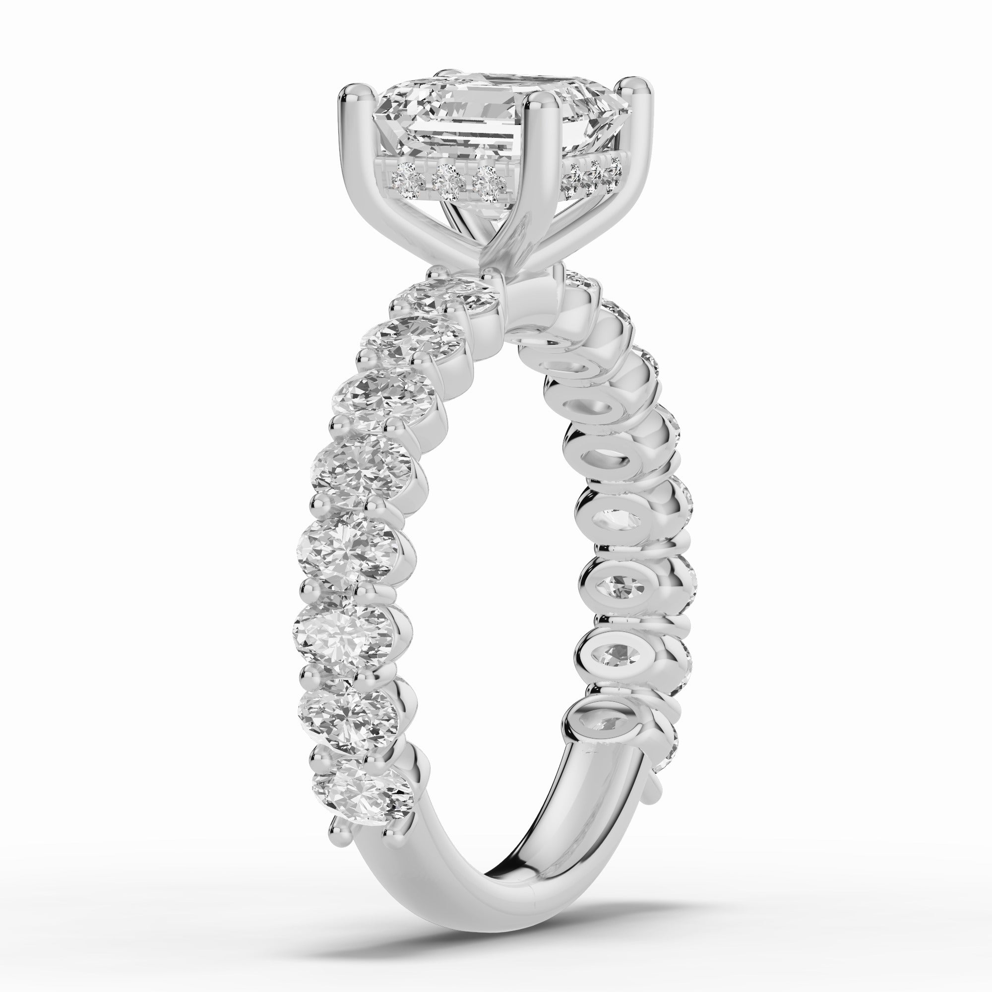 The Aurielle Crown Engagement Ring is a masterpiece of elegance and brilliance, designed for those who love a bold yet refined aesthetic. Its shank is set ¾ of the way around with 16 individually prong-set oval diamonds, creating a striking, elongated look that feels both big and elegant while allowing light to flow through every stone for maximum sparkle.