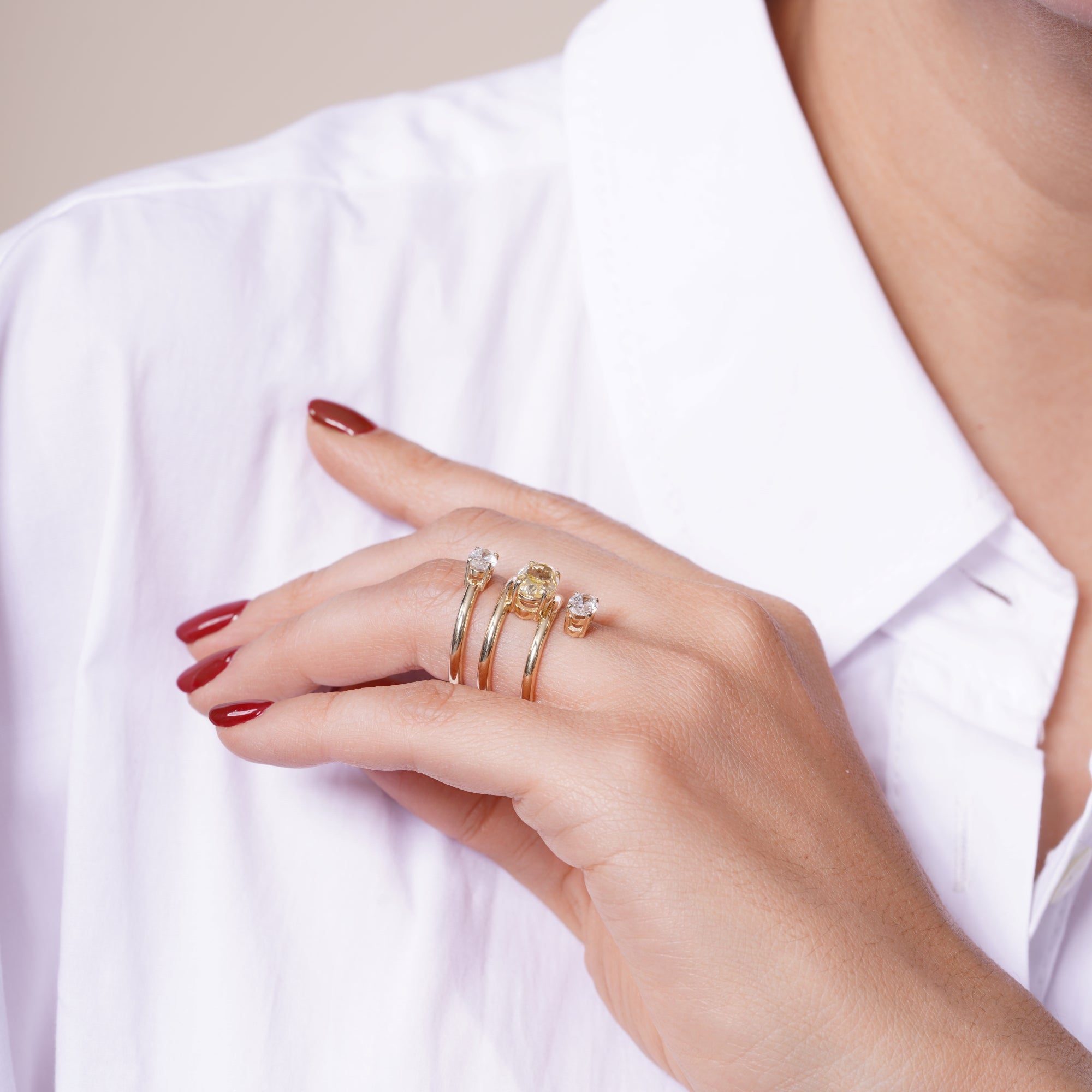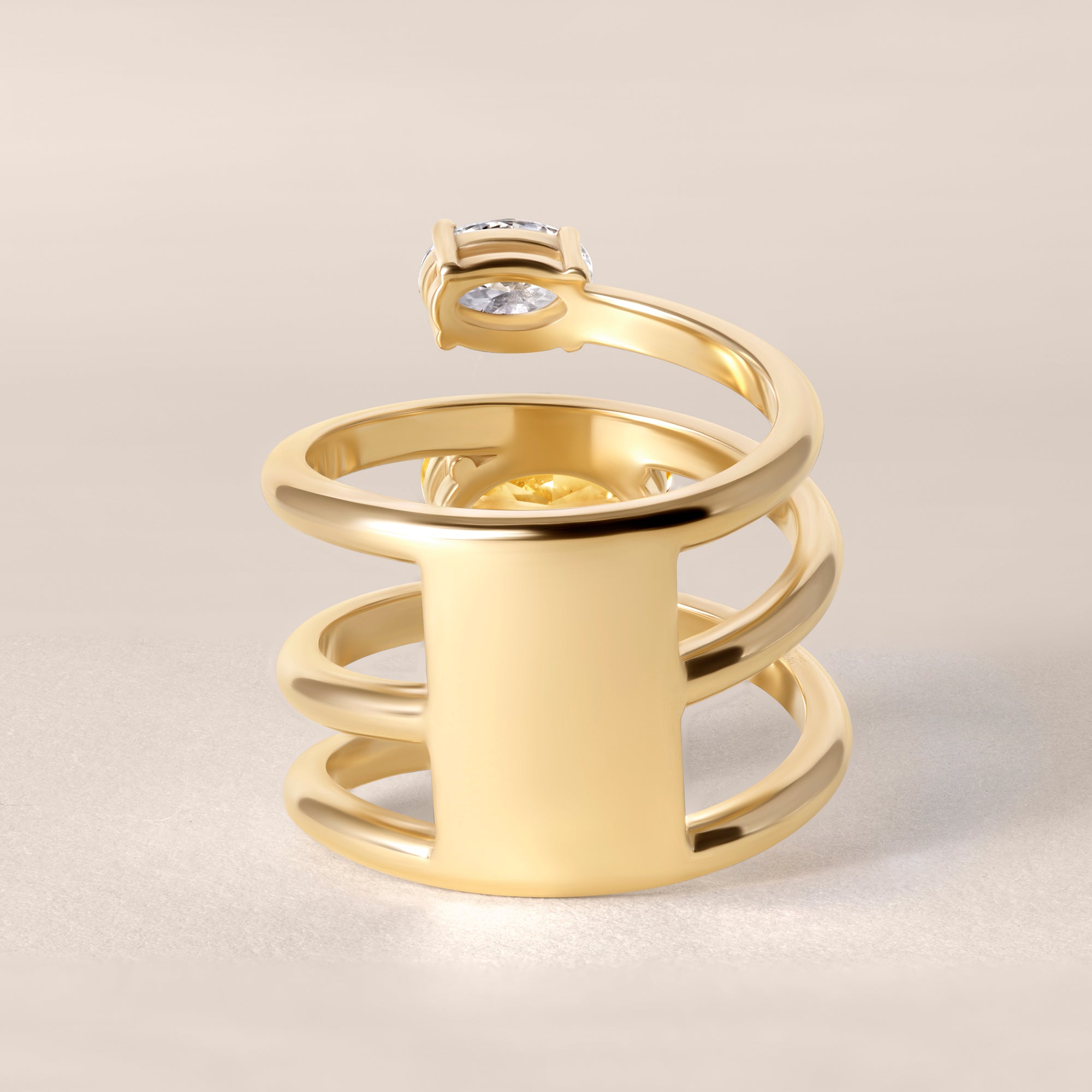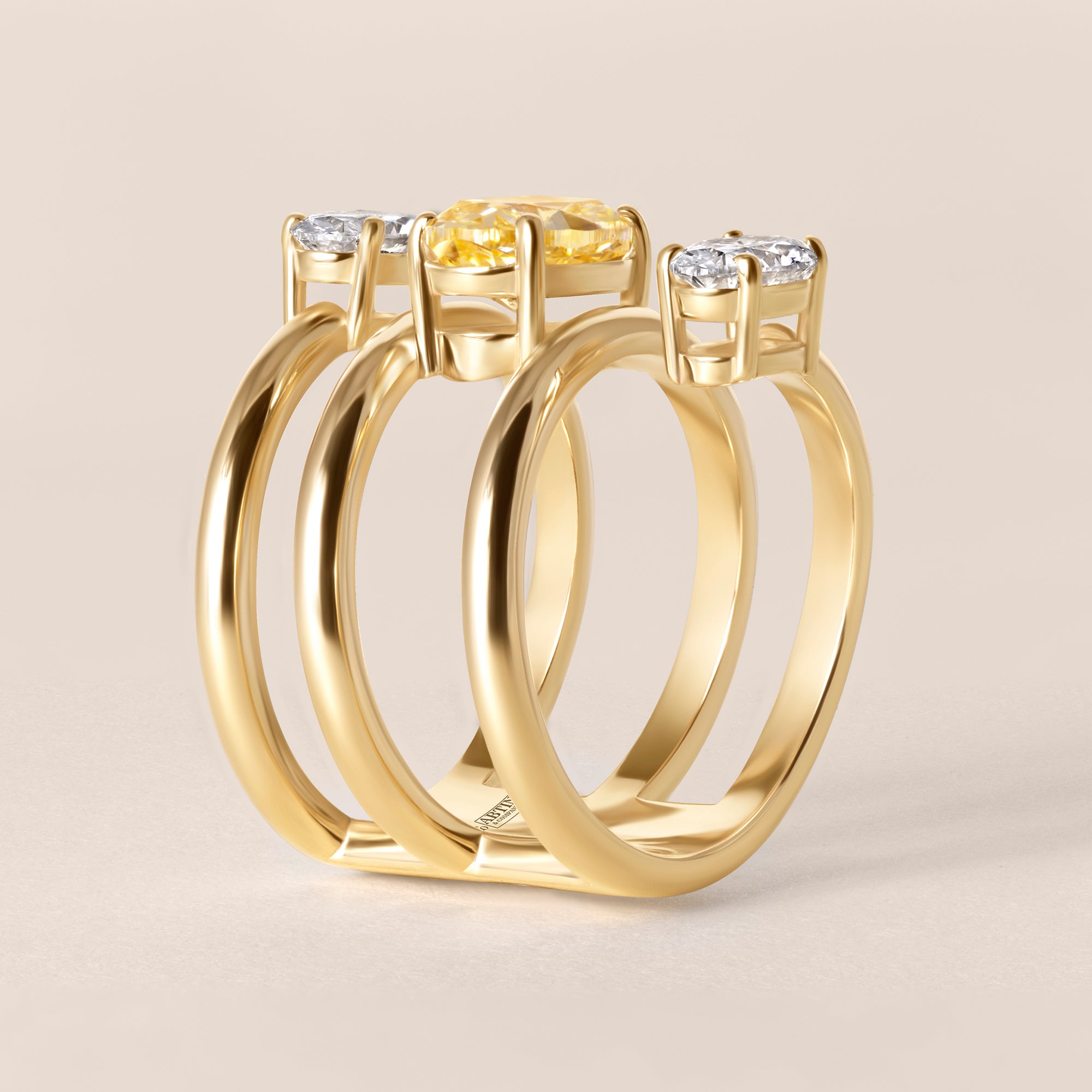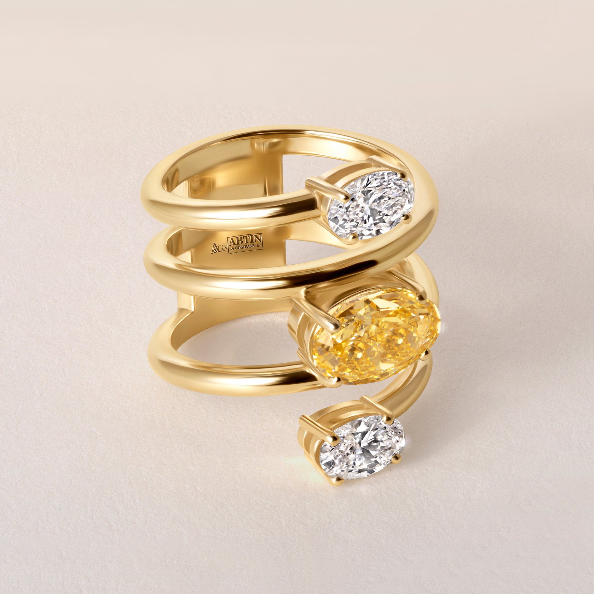 At its center rests a 2.02-carat oval-cut Fancy Intense Yellow lab-grown diamond, graded VS1 clarity, selected for its remarkable saturation and presence. Framing the centerpiece are two oval-cut lab-grown diamonds, each weighing ½ carat, graded E–F color with VS1 clarity, chosen for their brilliance and harmony. Together, the three stones establish a refined dialogue between luminosity and warmth, contrast and cohesion.