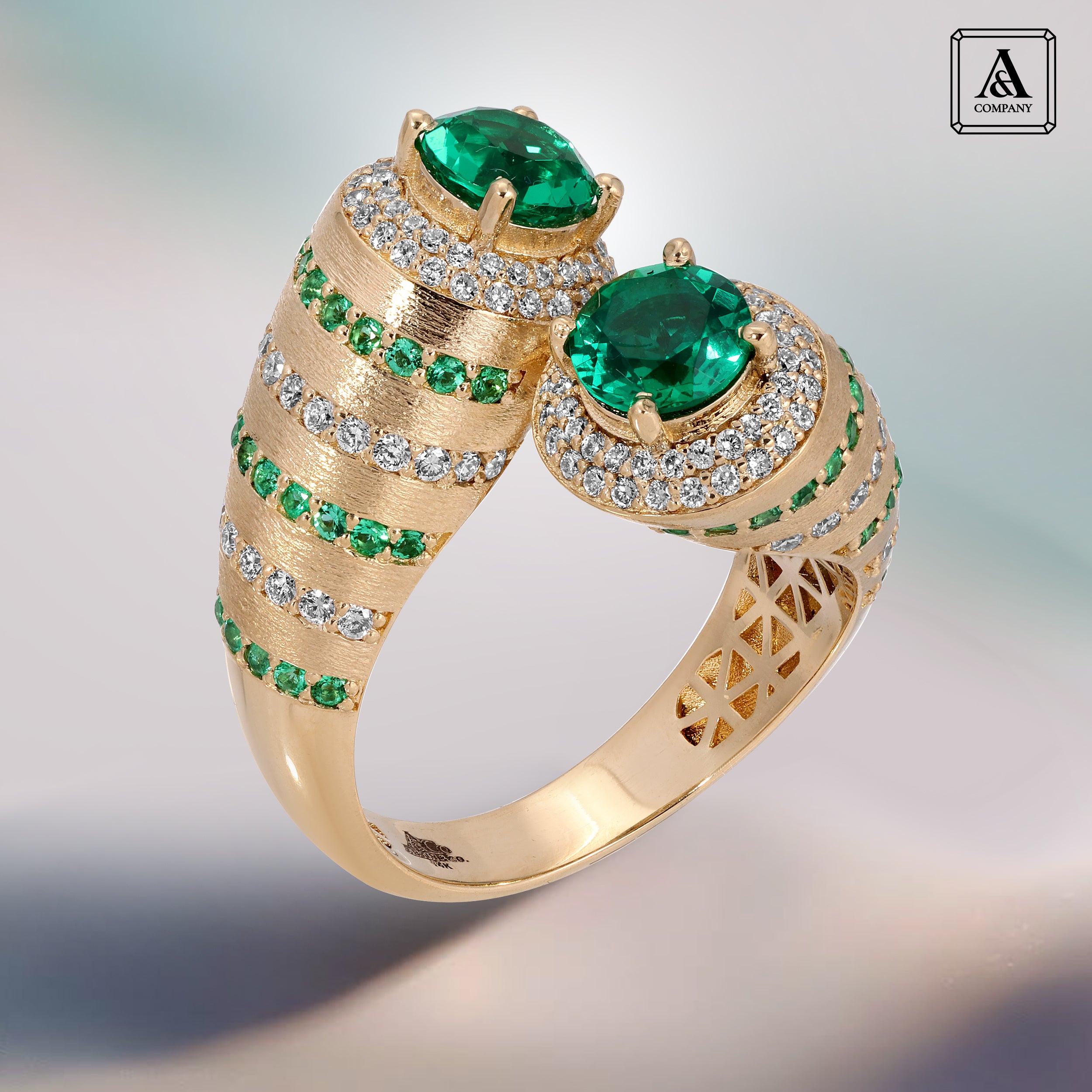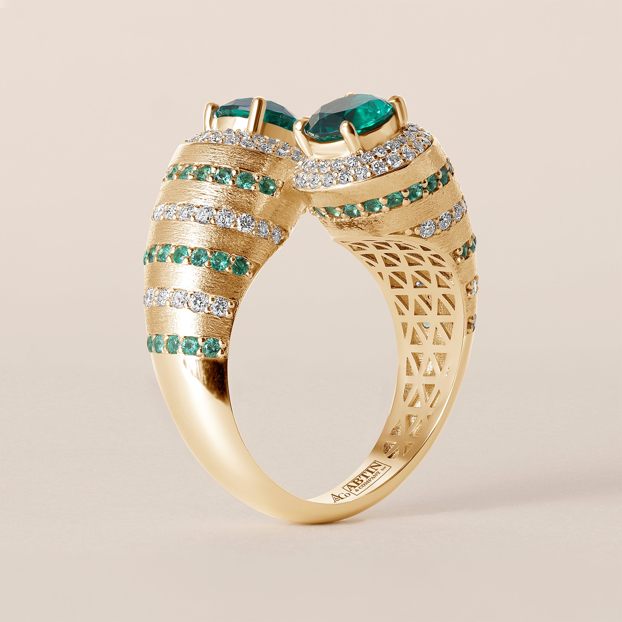 Crowning the design are two round lab-grown emeralds, selected for their vivid Colombian-color saturation and exceptional presence. With a total combined weight of 1.43 carats, the emeralds are perfectly matched in tone and brilliance, forming a balanced focal point that defines the ring’s identity. Their rich green hue brings depth and vitality, creating a dialogue of symmetry and harmony at the top of the composition.