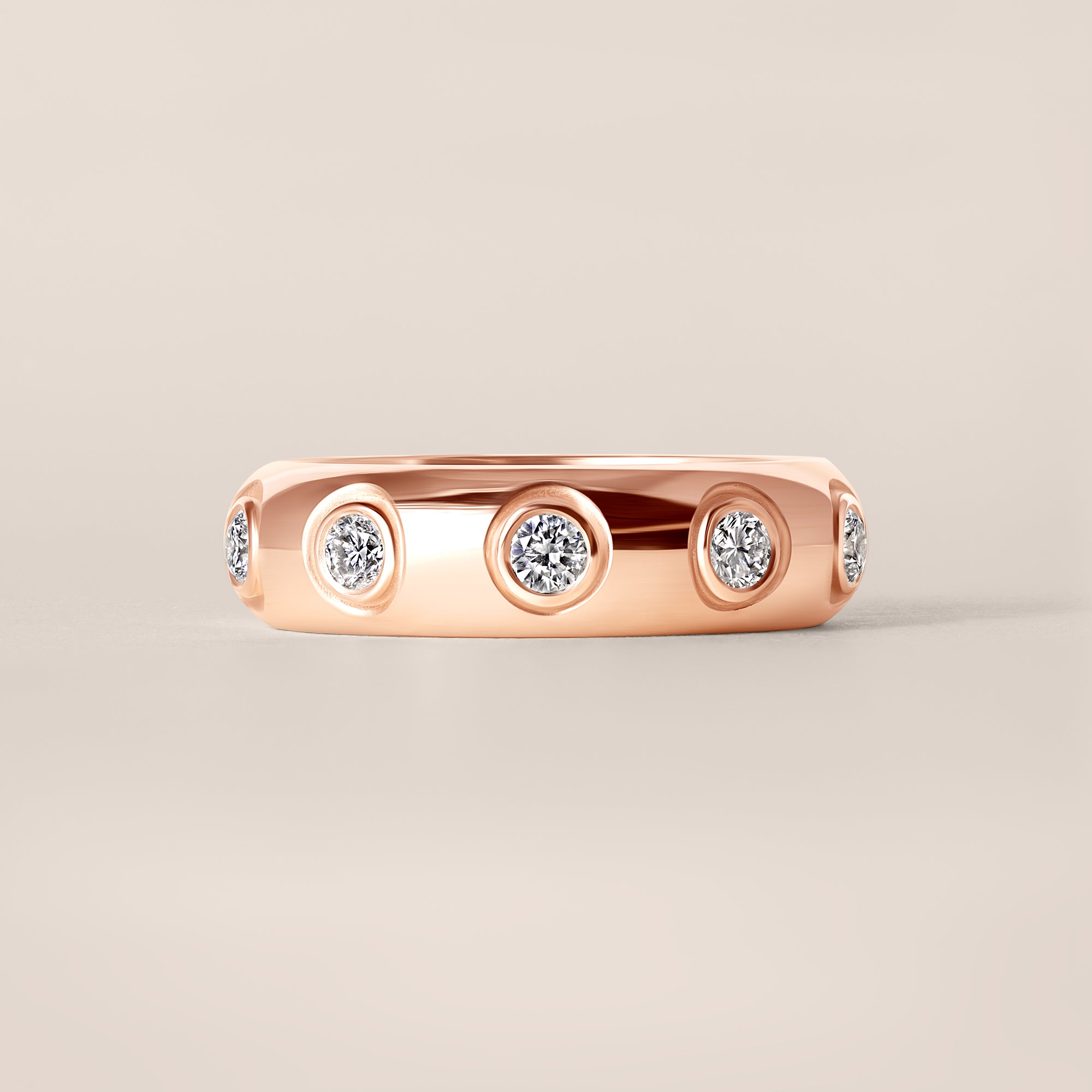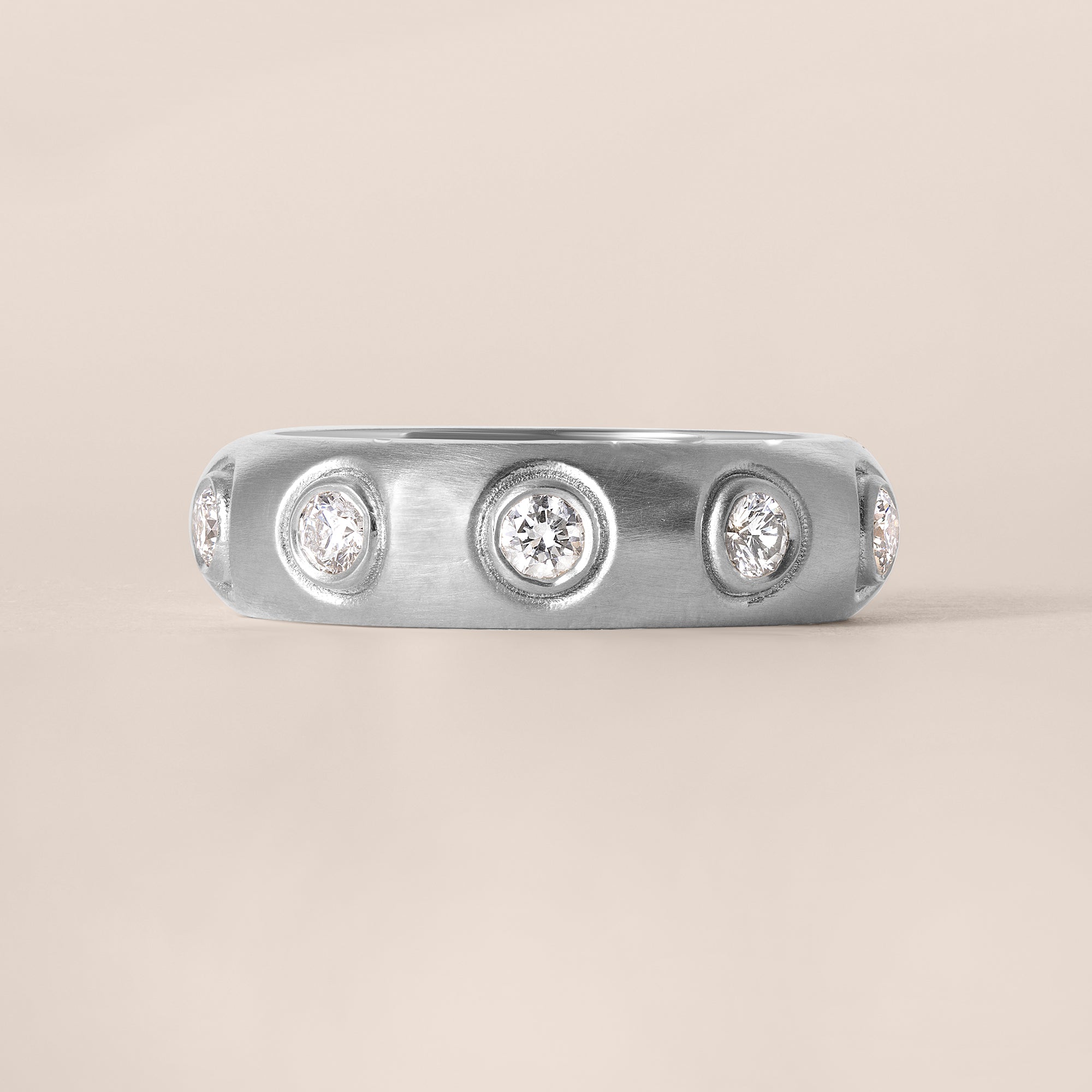The band features a series of round diamonds, individually bezel-set and evenly spaced around the ring. Each stone is placed with exacting precision, creating a balanced rhythm of light that enhances the form of the band without overpowering it. The bezel settings offer a sleek, contemporary profile while providing durability and comfort for daily wear.