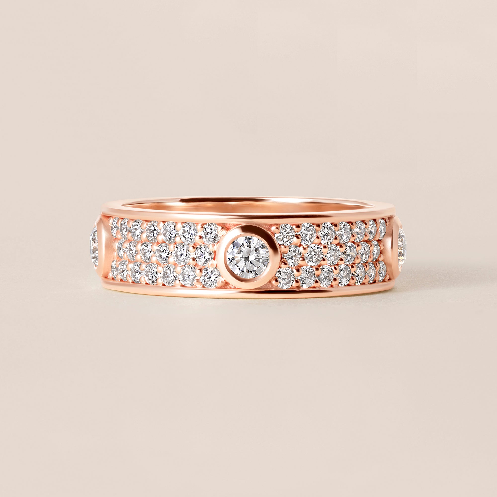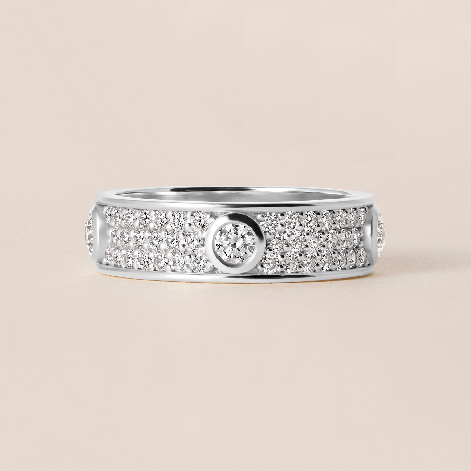The design centers around a wide, substantial band adorned with a rich field of pavé-set round diamonds, meticulously arranged to create depth, texture, and continuous sparkle across the surface. Anchoring the design are bezel-set round diamonds, strategically placed and seamlessly integrated into the band, adding rhythm and architectural definition while reinforcing the ring’s bold silhouette.