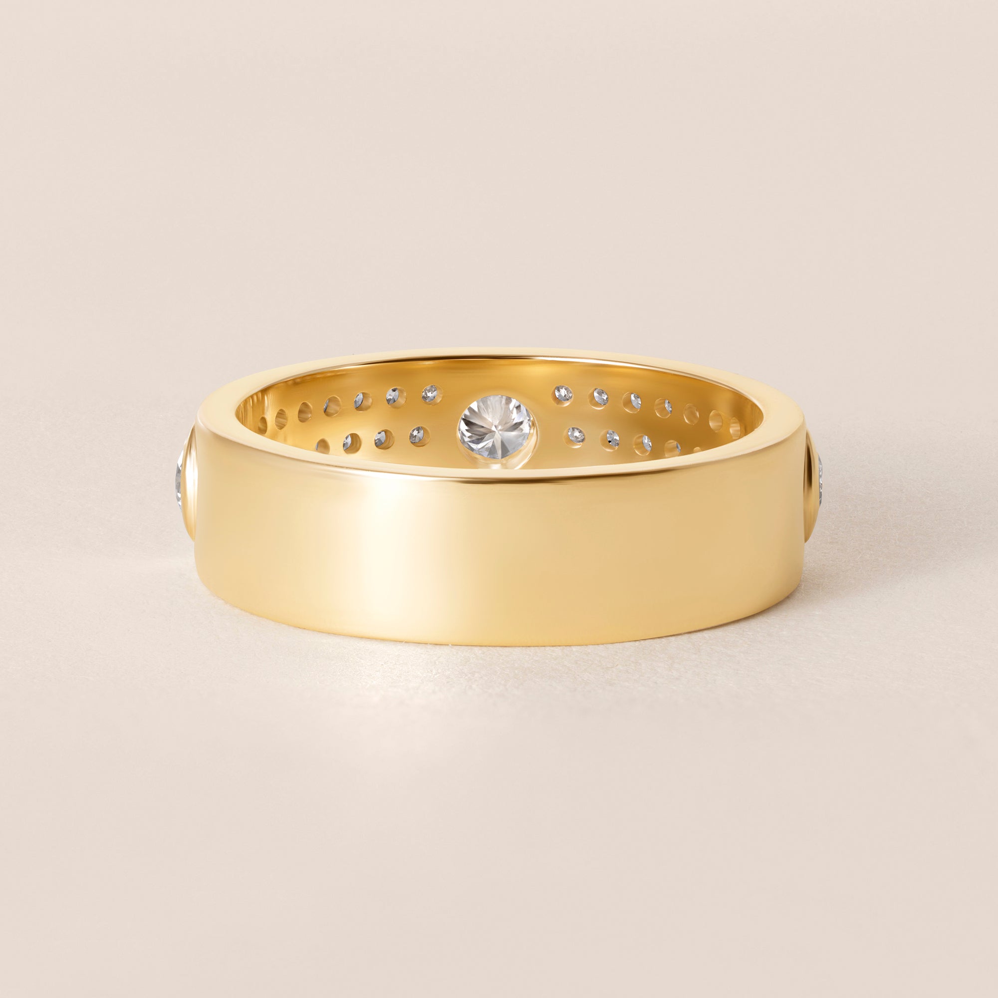The pavé work is executed with precision, allowing light to flow effortlessly across the diamonds while maintaining a clean, elevated aesthetic. The smooth, polished gold edges frame the pavé center, creating contrast and structure that enhances both brilliance and wearability. Inside the band, a thoughtfully engineered gallery with precision cut-outs ensures comfort, balance, and visual refinement from every angle.
