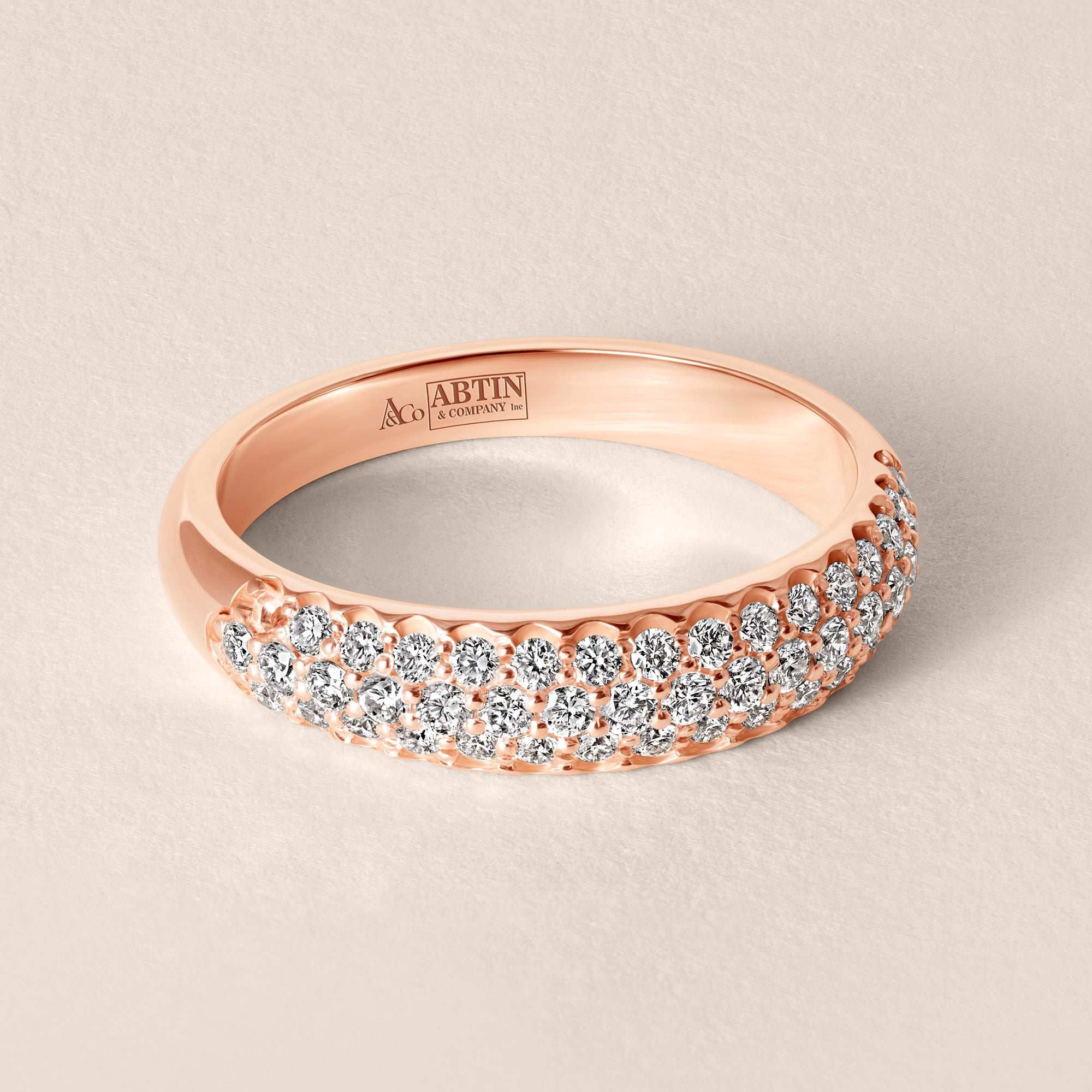 The design features a wide band adorned with multiple rows of meticulously set round diamonds across the top surface, creating a seamless field of light and sparkle. Each diamond is placed with exceptional precision to ensure uniform brilliance, allowing the pavé to flow uninterrupted while maintaining a clean, structured silhouette. Smooth, high-polish gold edges frame the diamond surface, adding contrast and emphasizing the band’s refined architectural form.