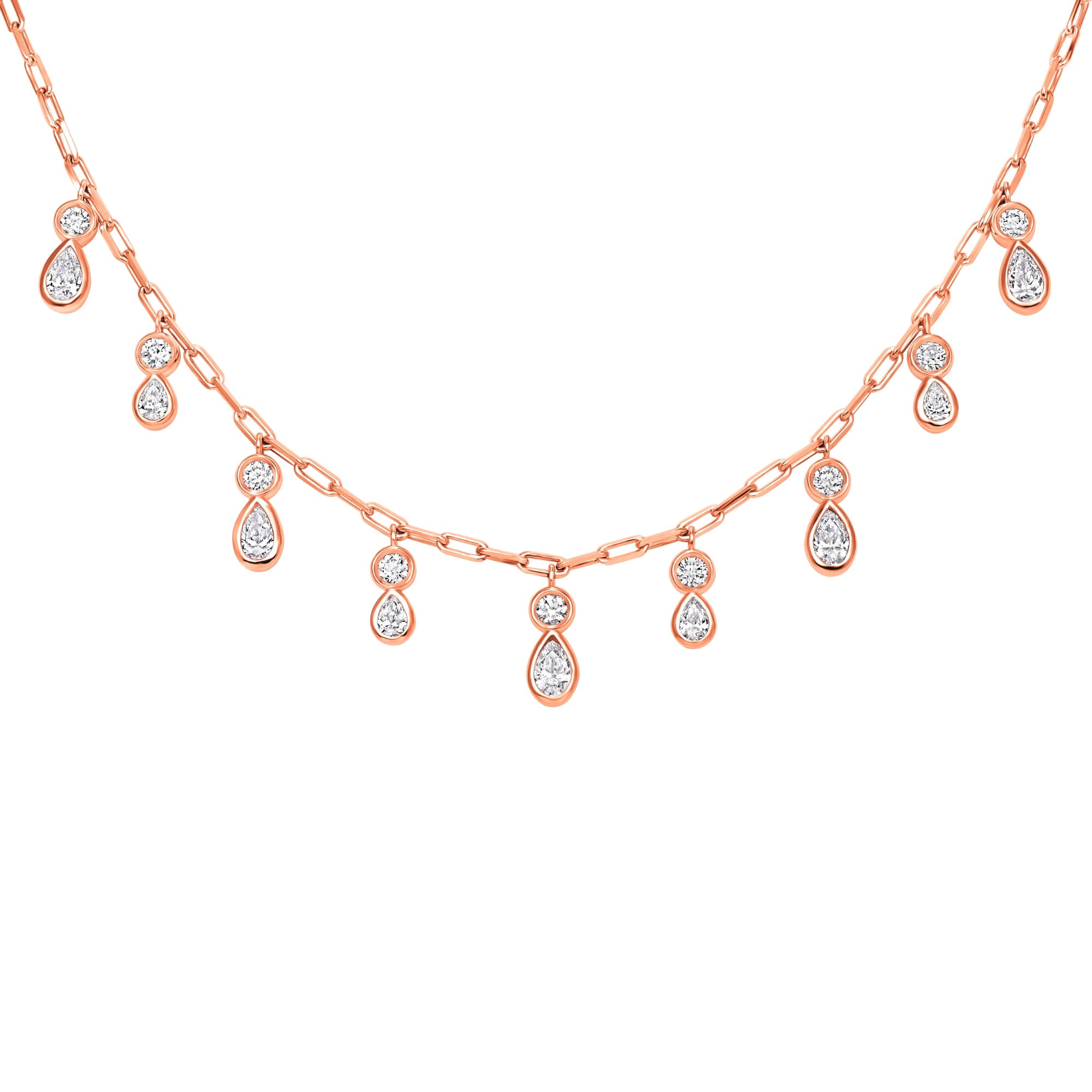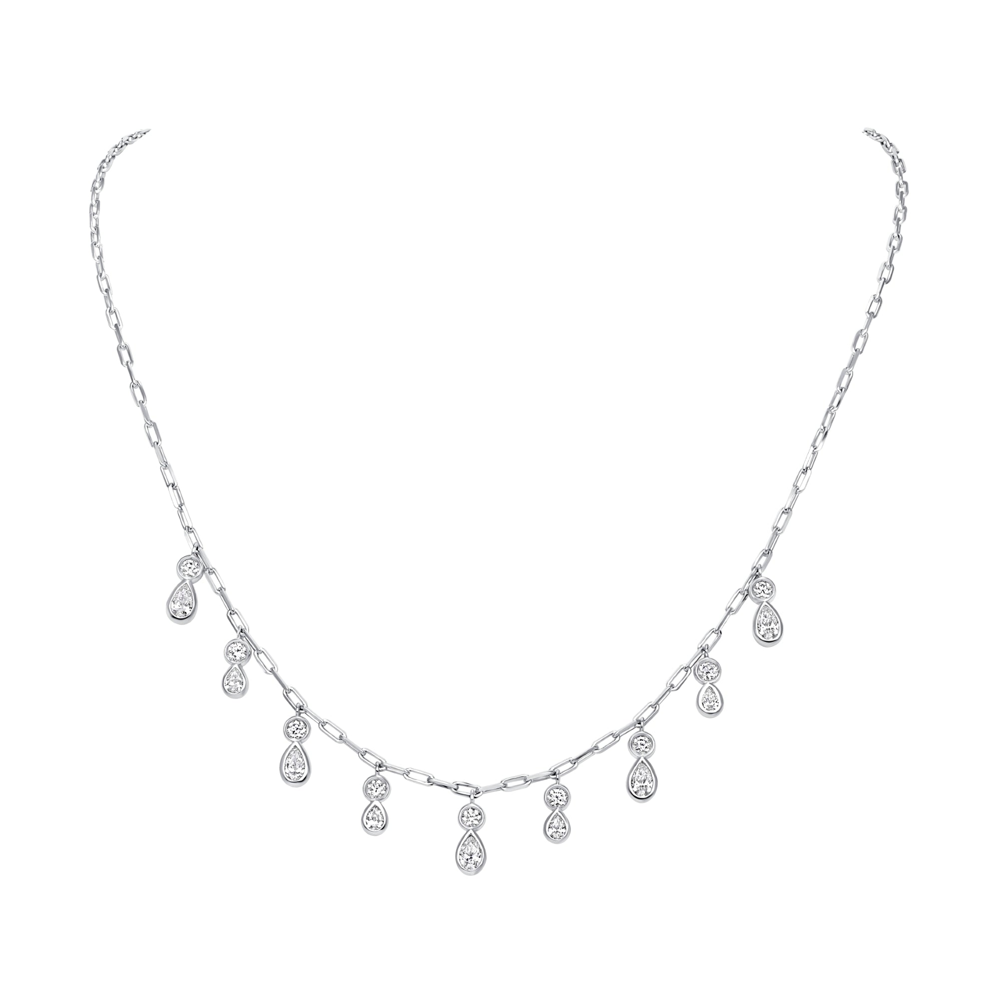Our Ondina Necklace captures the elegance of flowing drops with alternating pear-shaped and round lab-grown diamonds, each bezel-set to highlight their brilliance. Designed with a graceful rhythm, the diamonds create a luminous cascade that moves effortlessly with you, embodying refined beauty and timeless sophistication.