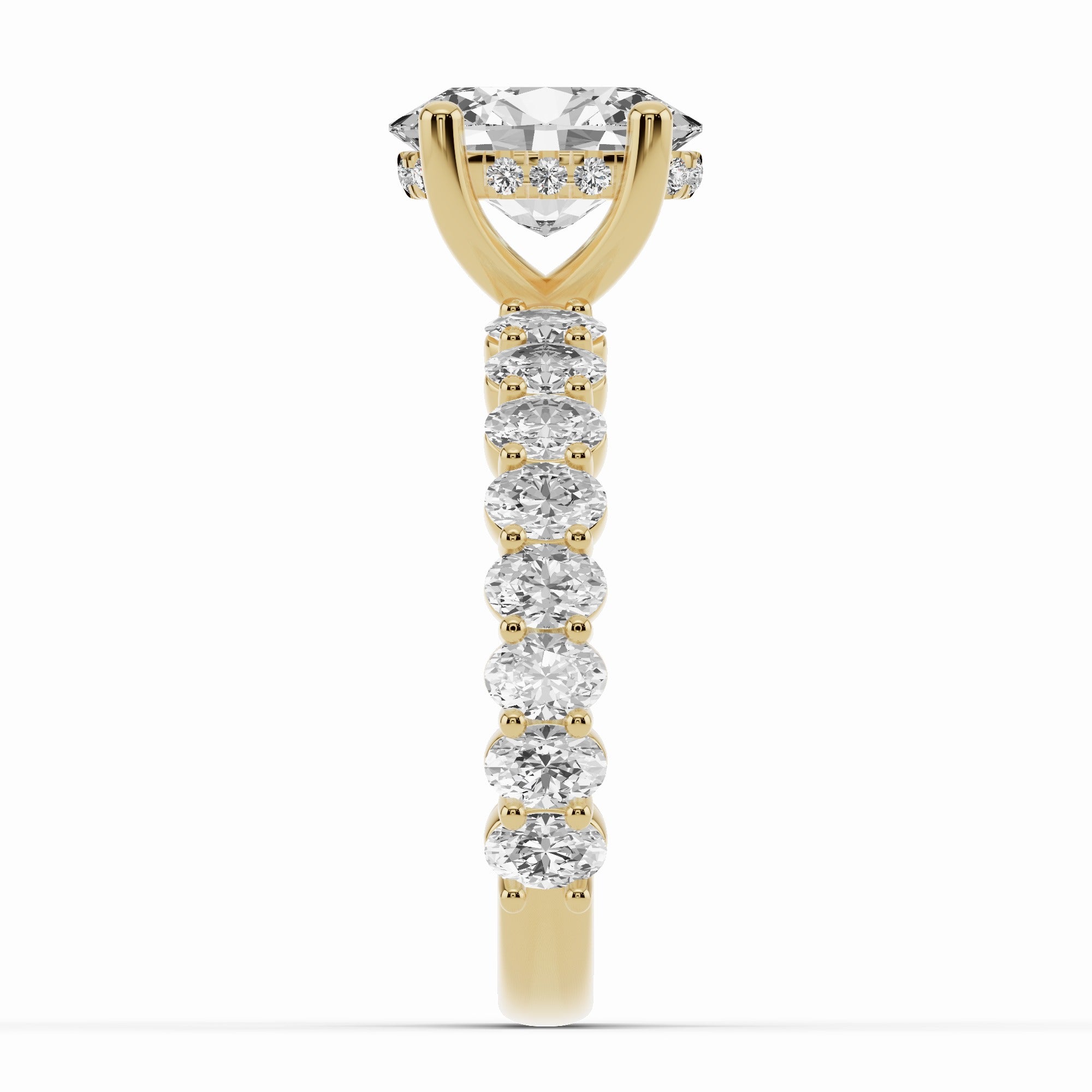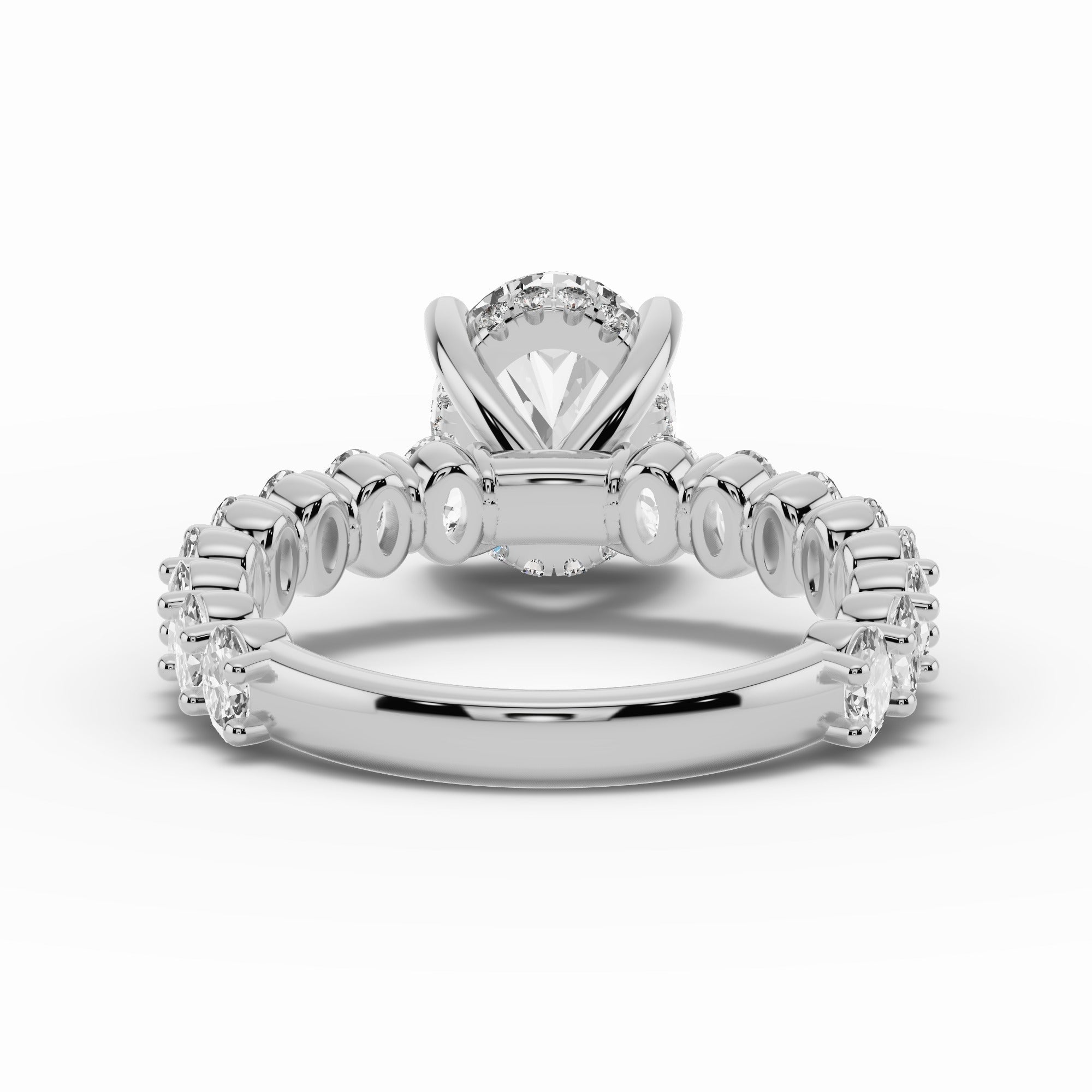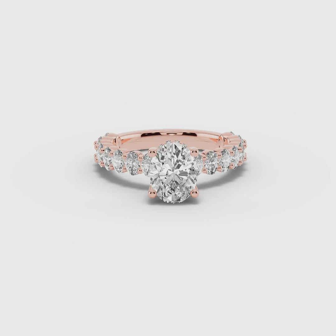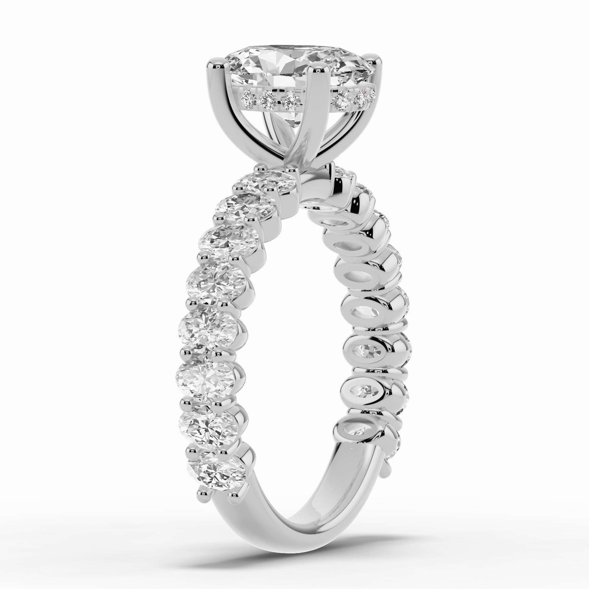 The Aurielle Crown Engagement Ring is a masterpiece of elegance and brilliance, designed for those who love a bold yet refined aesthetic. Its shank is set ¾ of the way around with 16 individually prong-set oval diamonds, creating a striking, elongated look that feels both big and elegant while allowing light to flow through every stone for maximum sparkle.