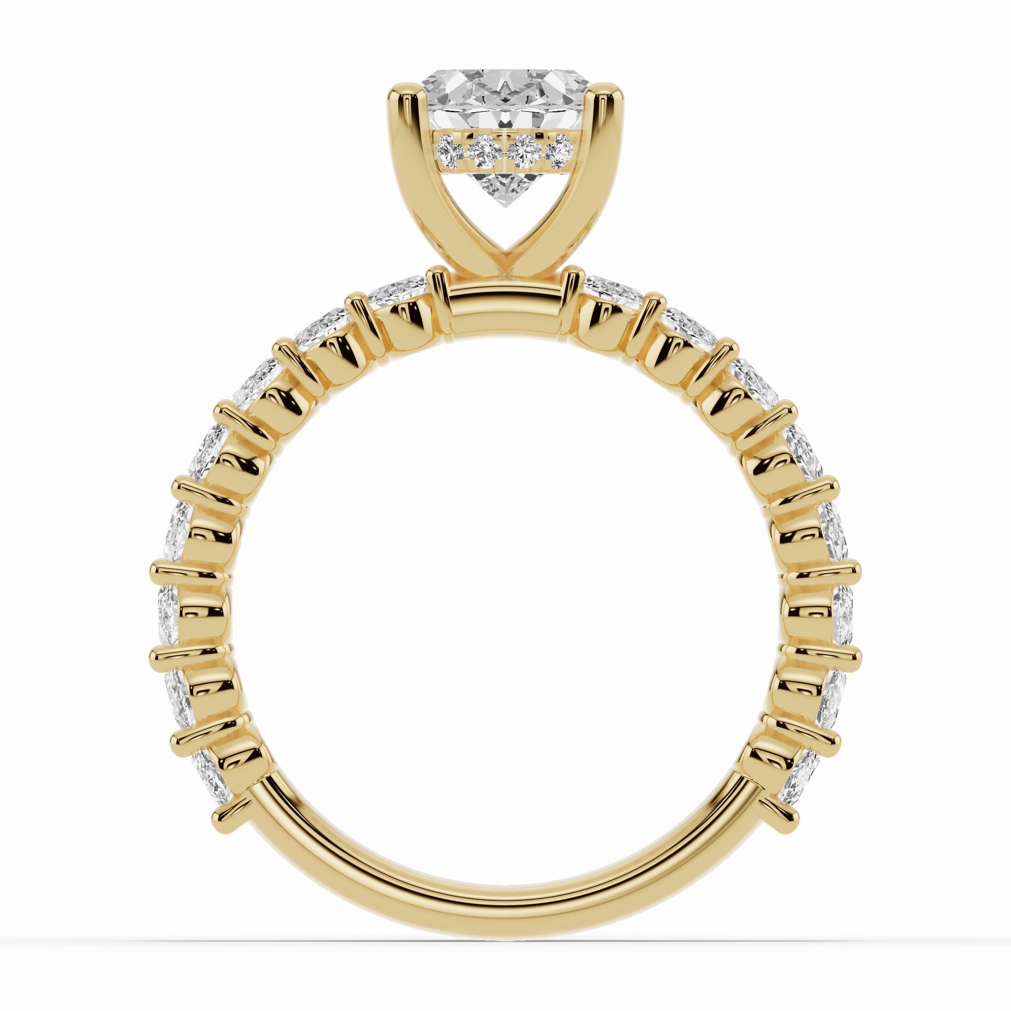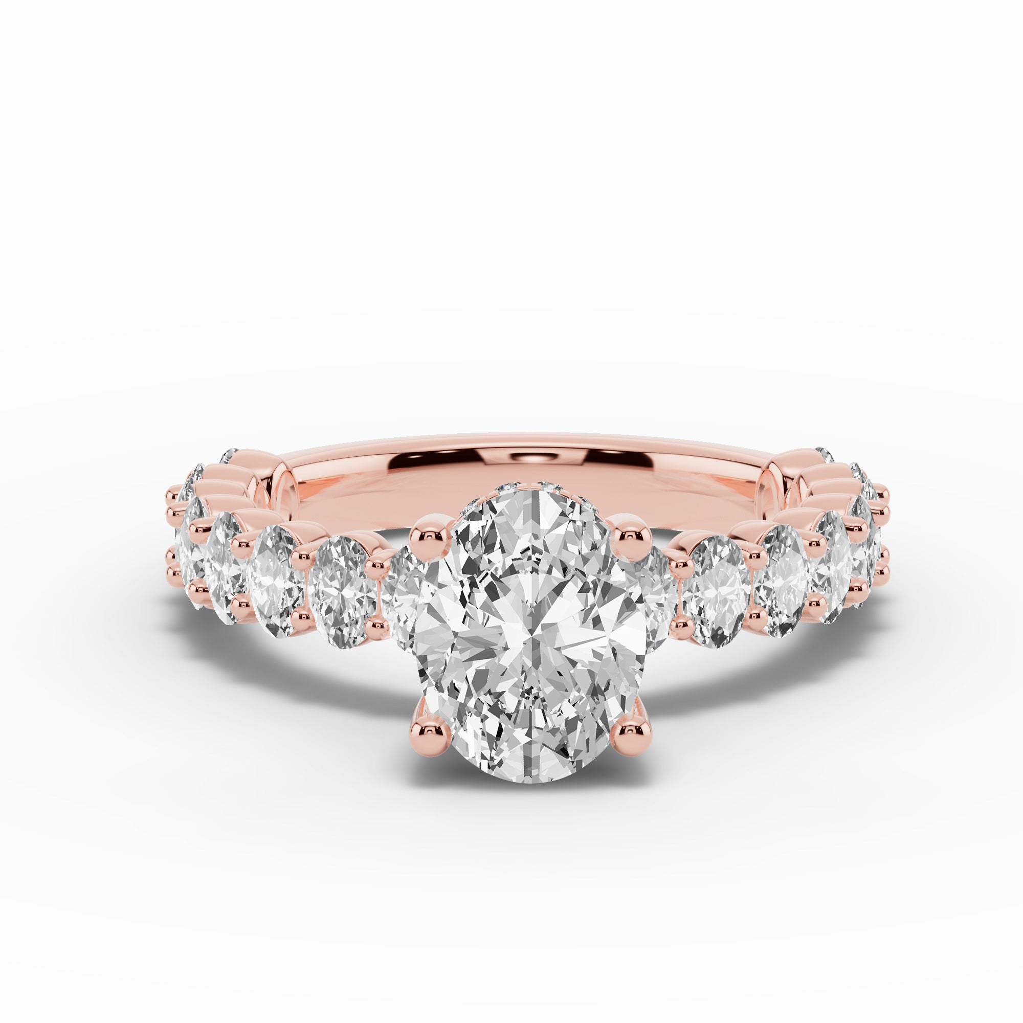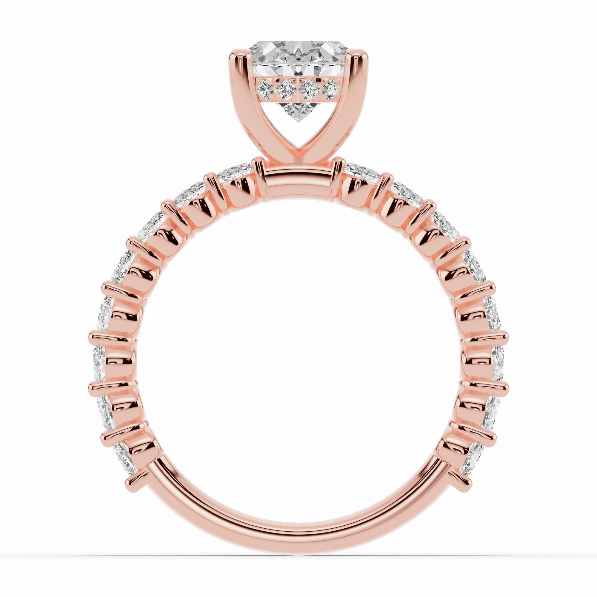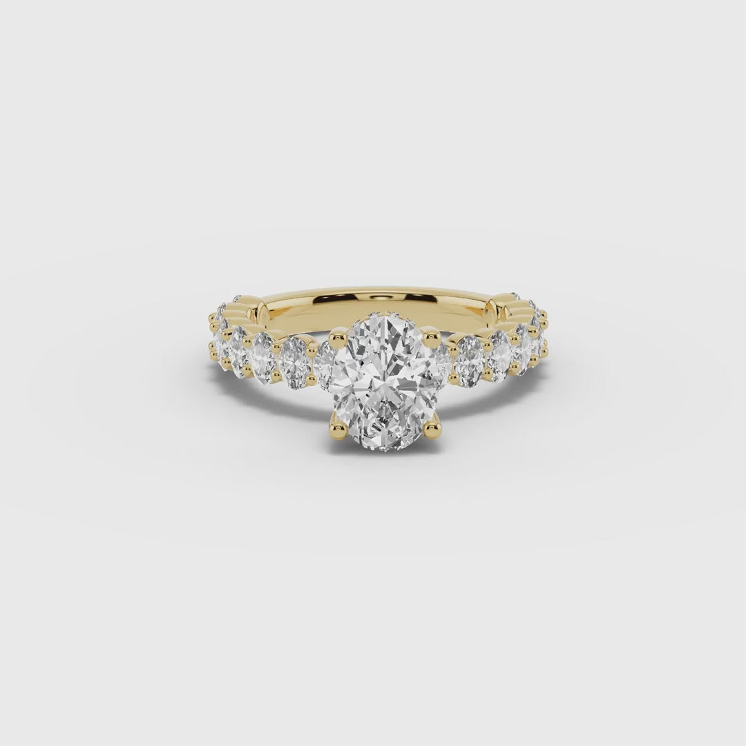 The Aurielle Crown Engagement Ring is a masterpiece of elegance and brilliance, designed for those who love a bold yet refined aesthetic. Its shank is set ¾ of the way around with 16 individually prong-set oval diamonds, creating a striking, elongated look that feels both big and elegant while allowing light to flow through every stone for maximum sparkle.