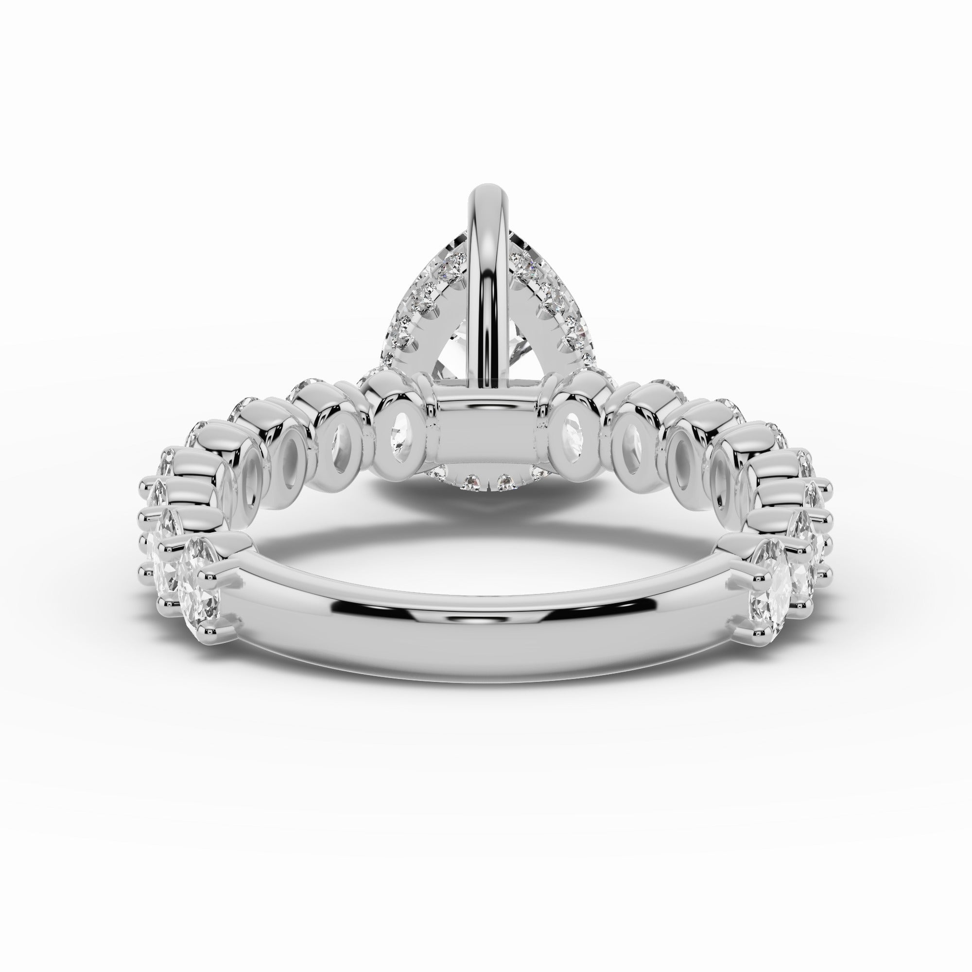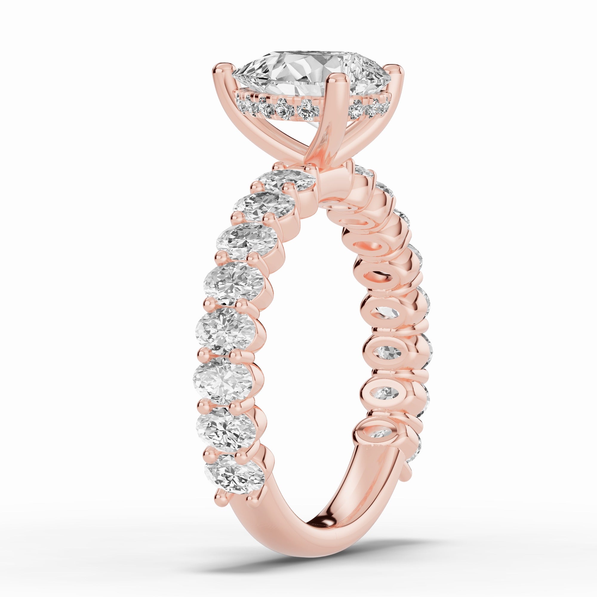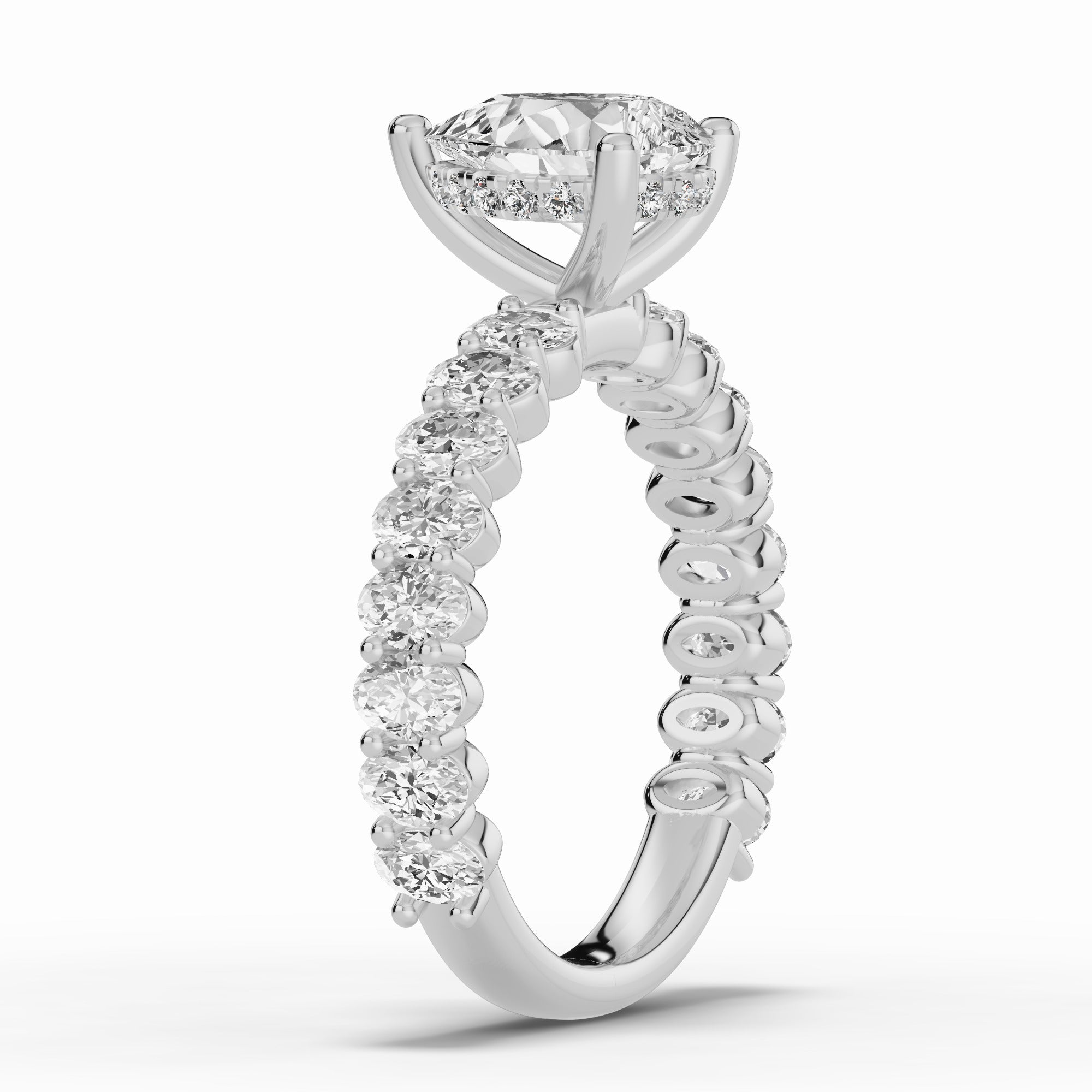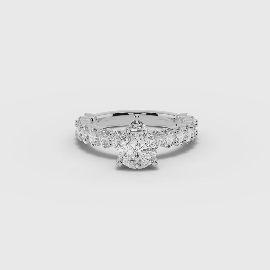 The Aurielle Crown Engagement Ring is a masterpiece of elegance and brilliance, designed for those who love a bold yet refined aesthetic. Its shank is set ¾ of the way around with 16 individually prong-set oval diamonds, creating a striking, elongated look that feels both big and elegant while allowing light to flow through every stone for maximum sparkle.