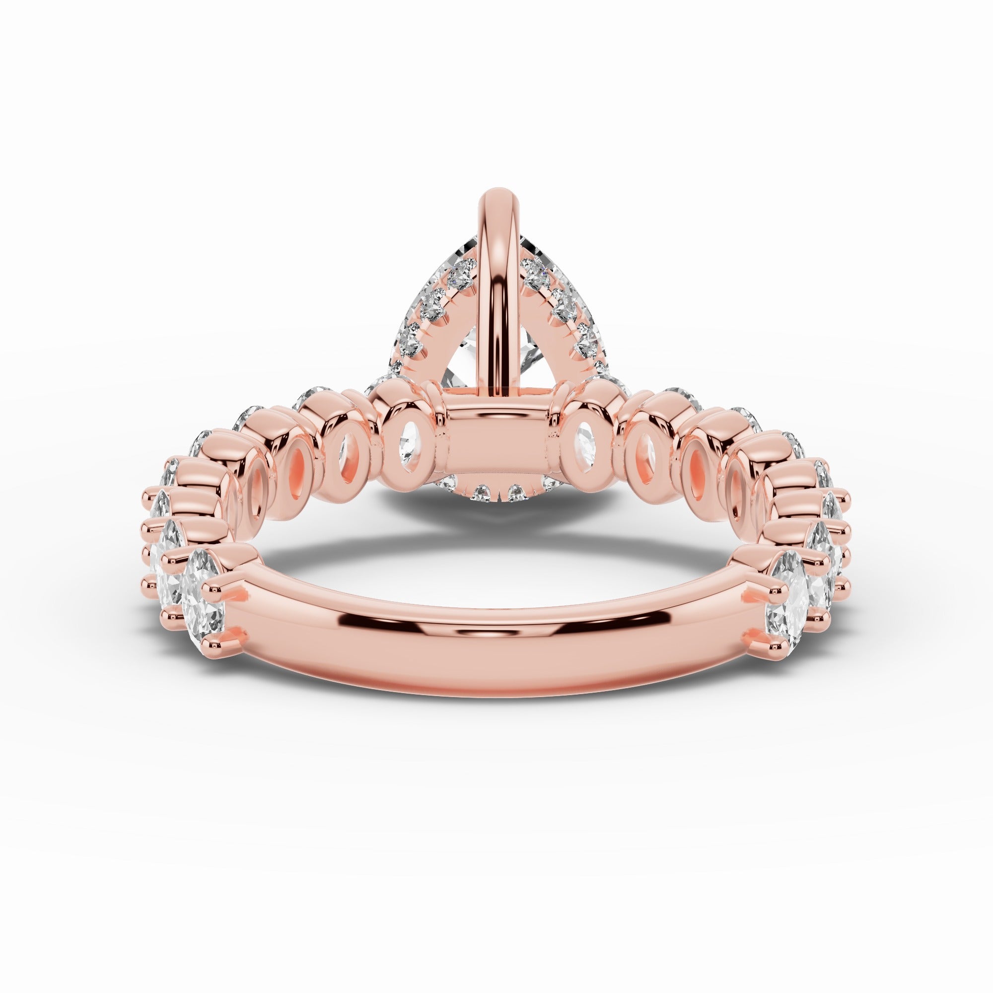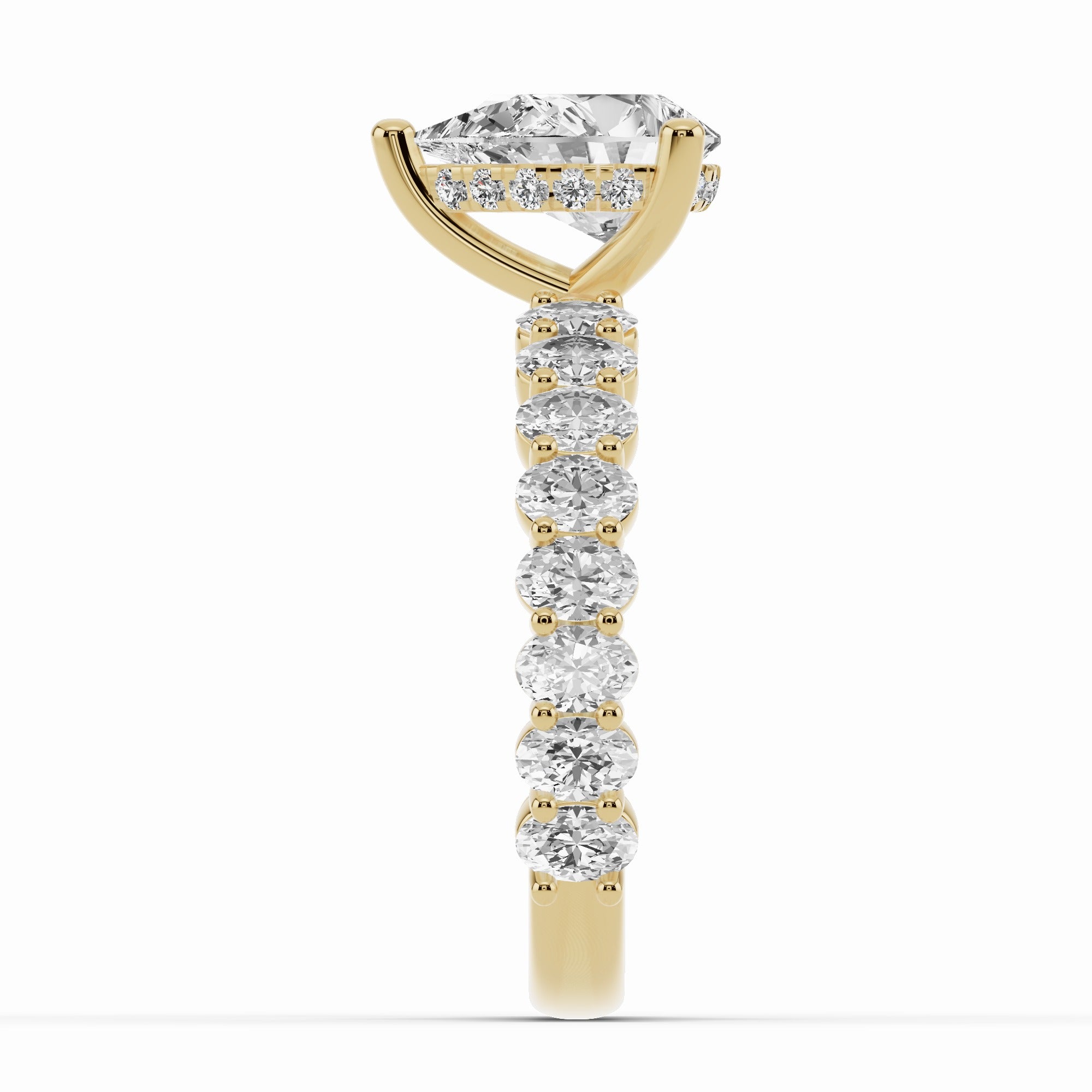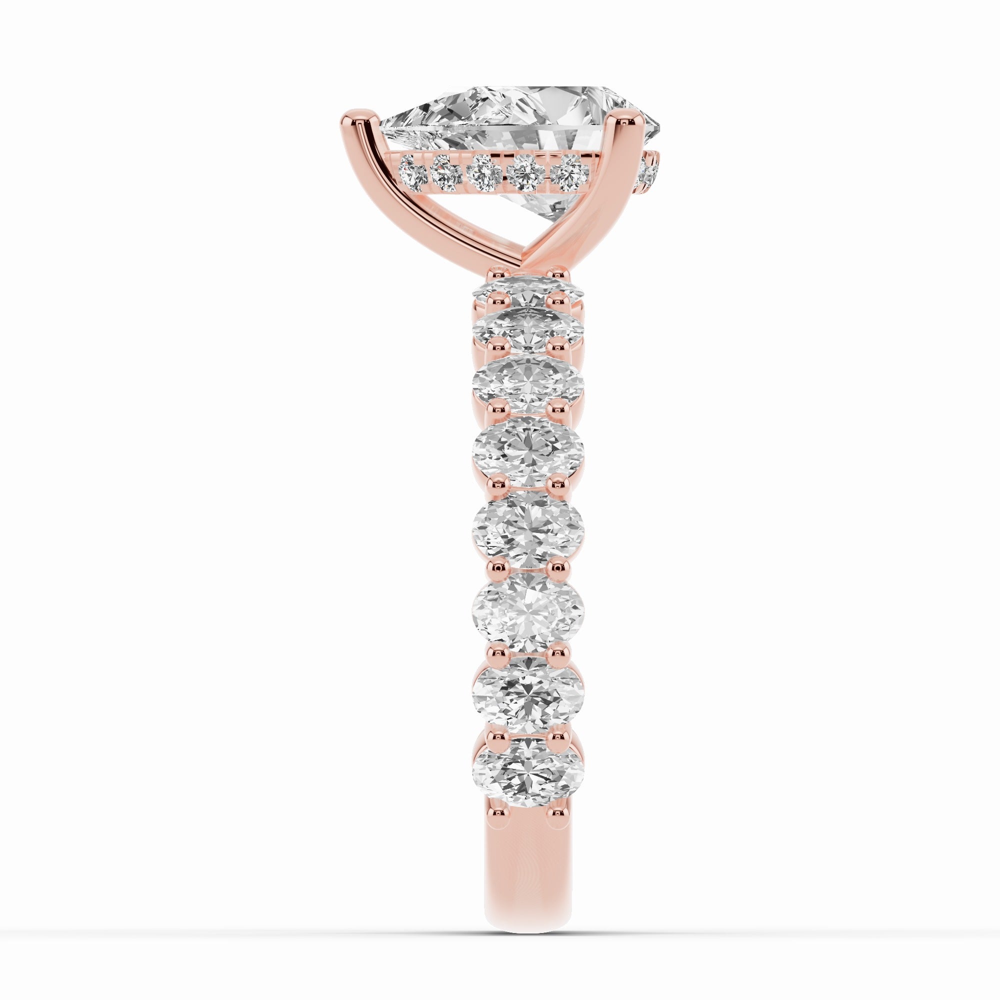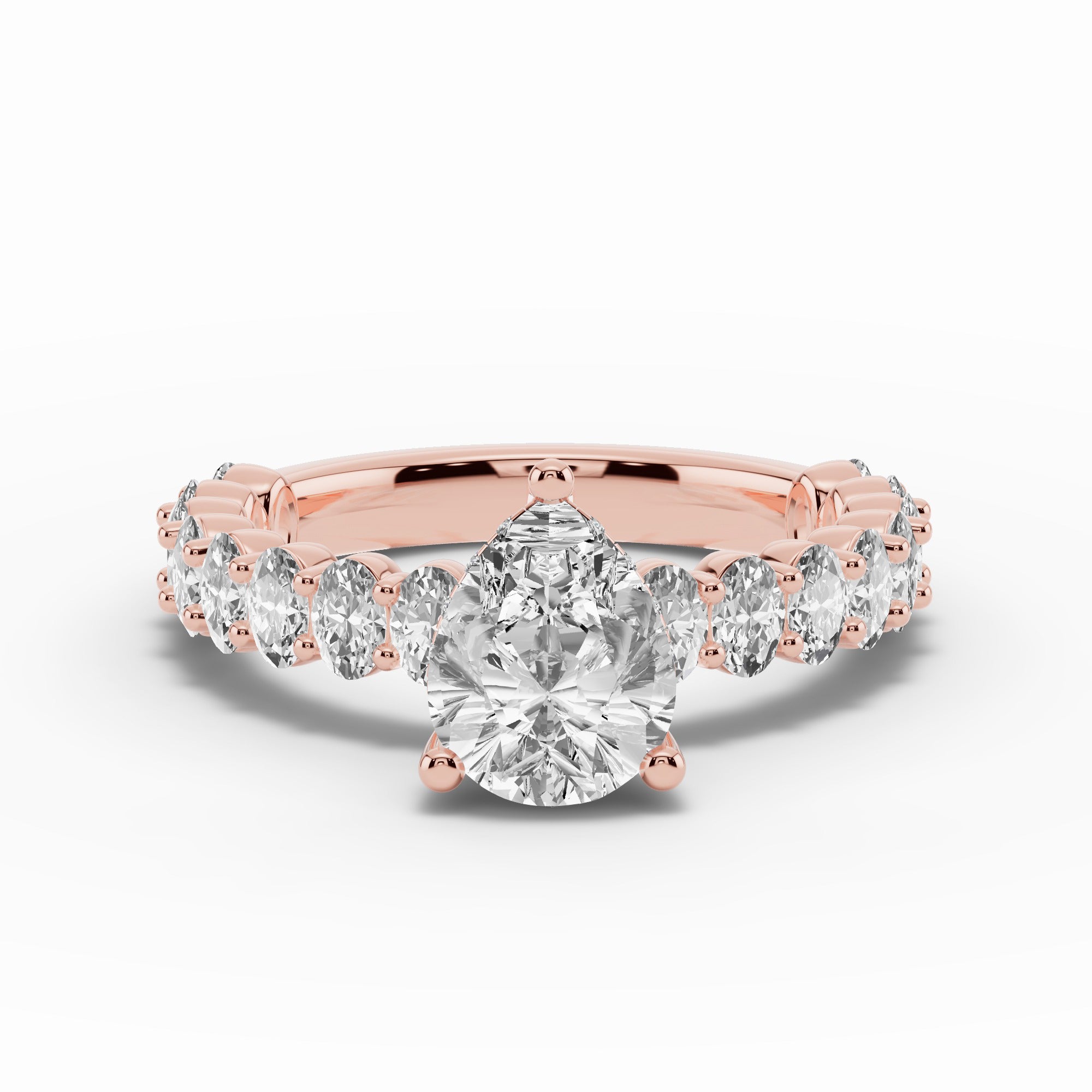 The Aurielle Crown Engagement Ring is a masterpiece of elegance and brilliance, designed for those who love a bold yet refined aesthetic. Its shank is set ¾ of the way around with 16 individually prong-set oval diamonds, creating a striking, elongated look that feels both big and elegant while allowing light to flow through every stone for maximum sparkle.