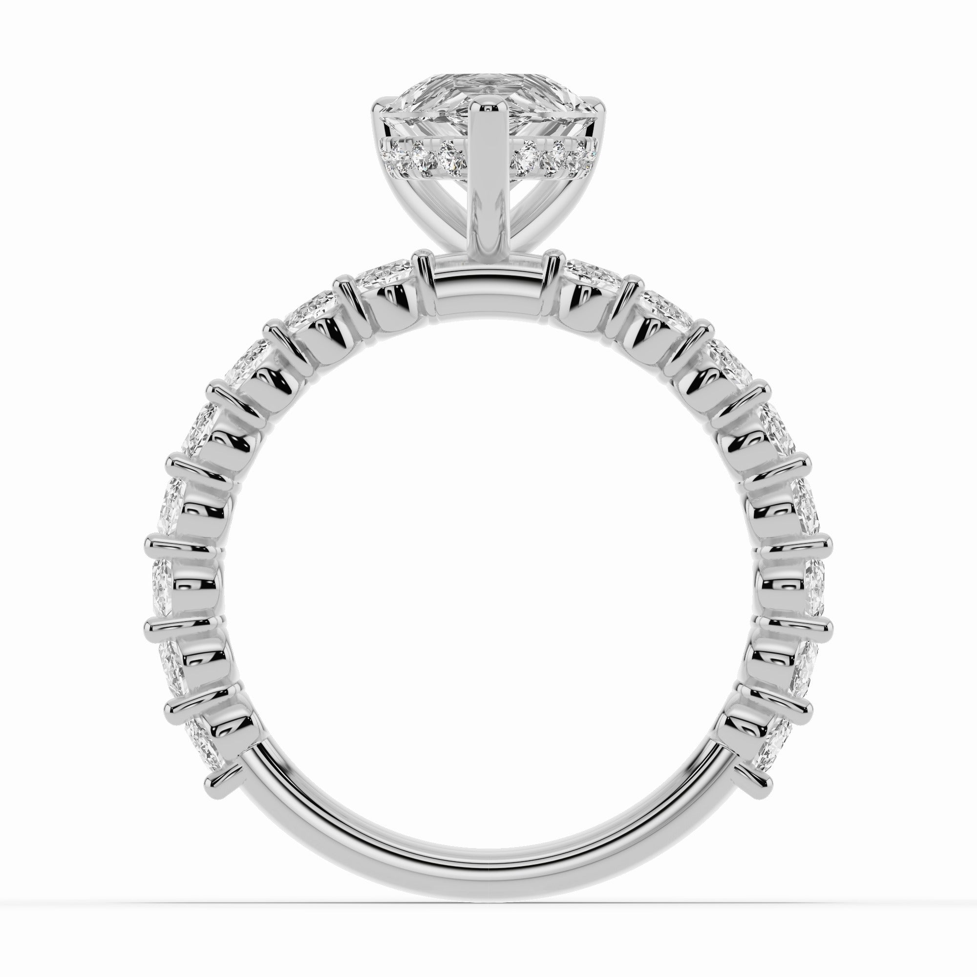 The centerpiece is elevated by a delicate diamond crown beneath the setting, adding a hidden layer of brilliance that catches the light with every movement. The head can be fully customized with any diamond shape — round, oval, emerald, pear, or marquise — allowing you to create a ring that perfectly reflects your style.