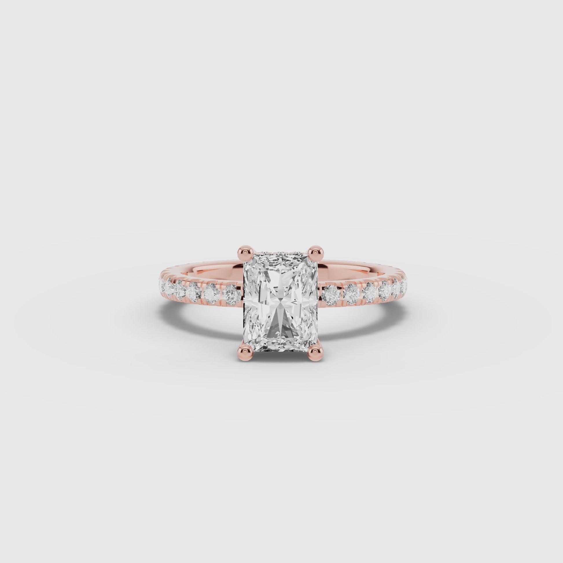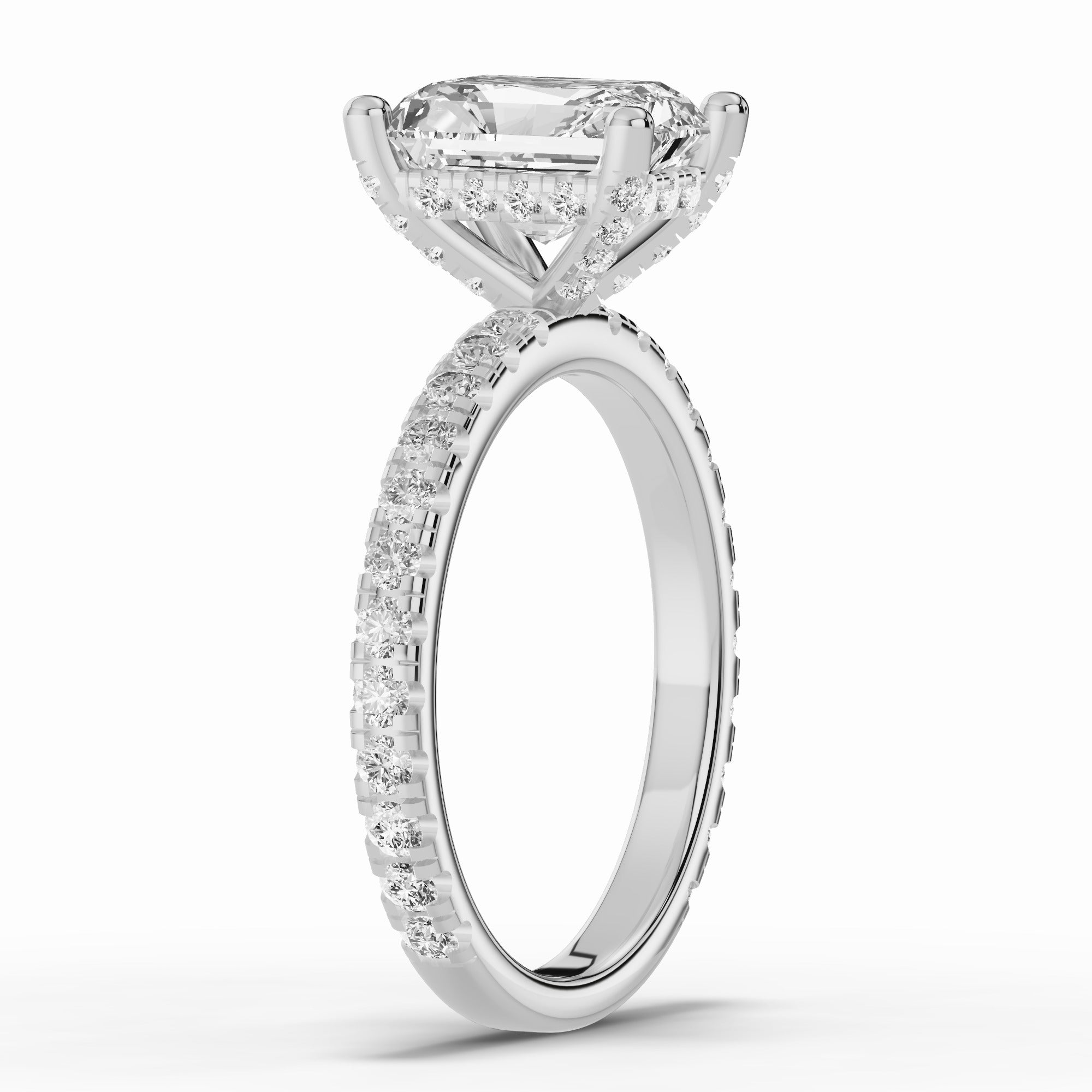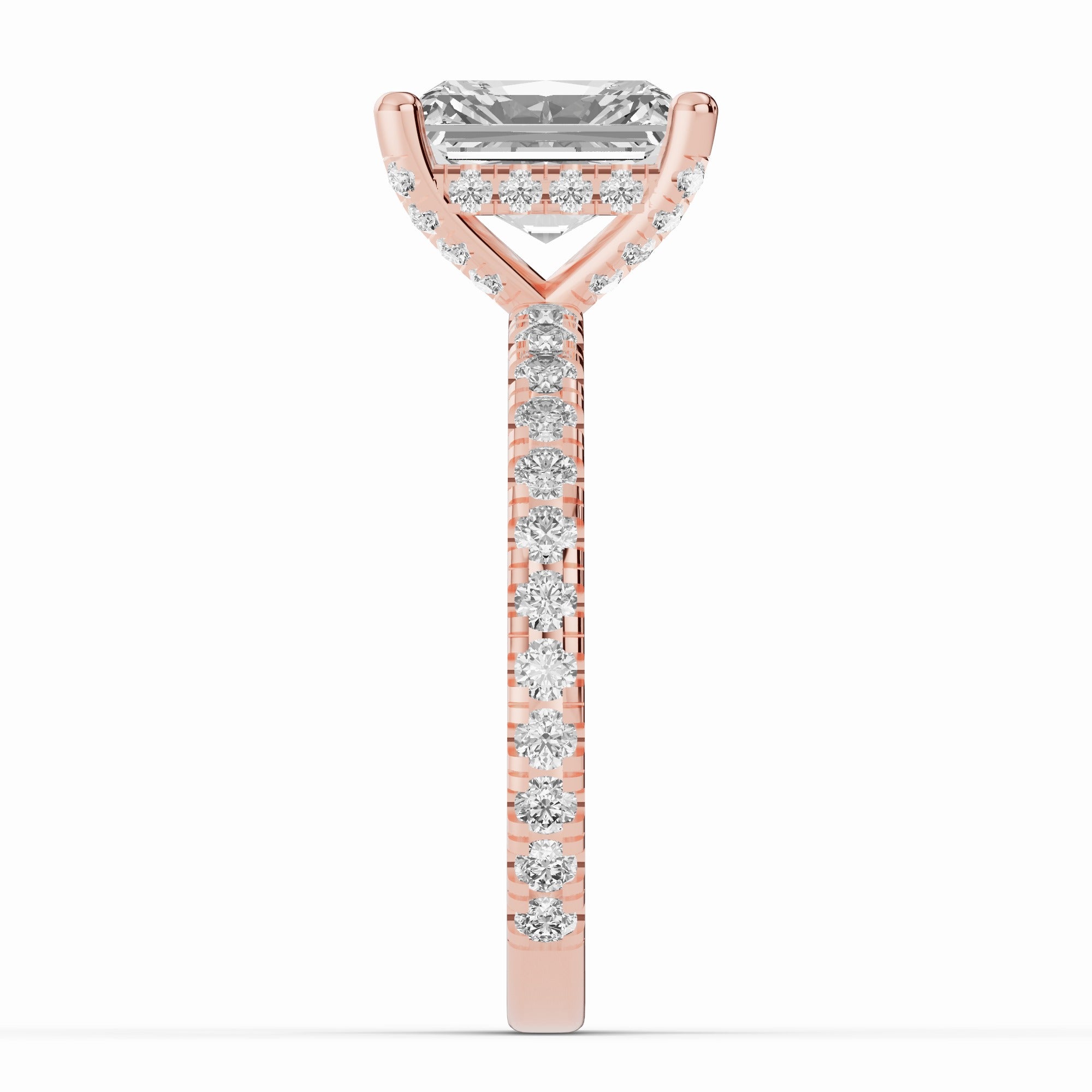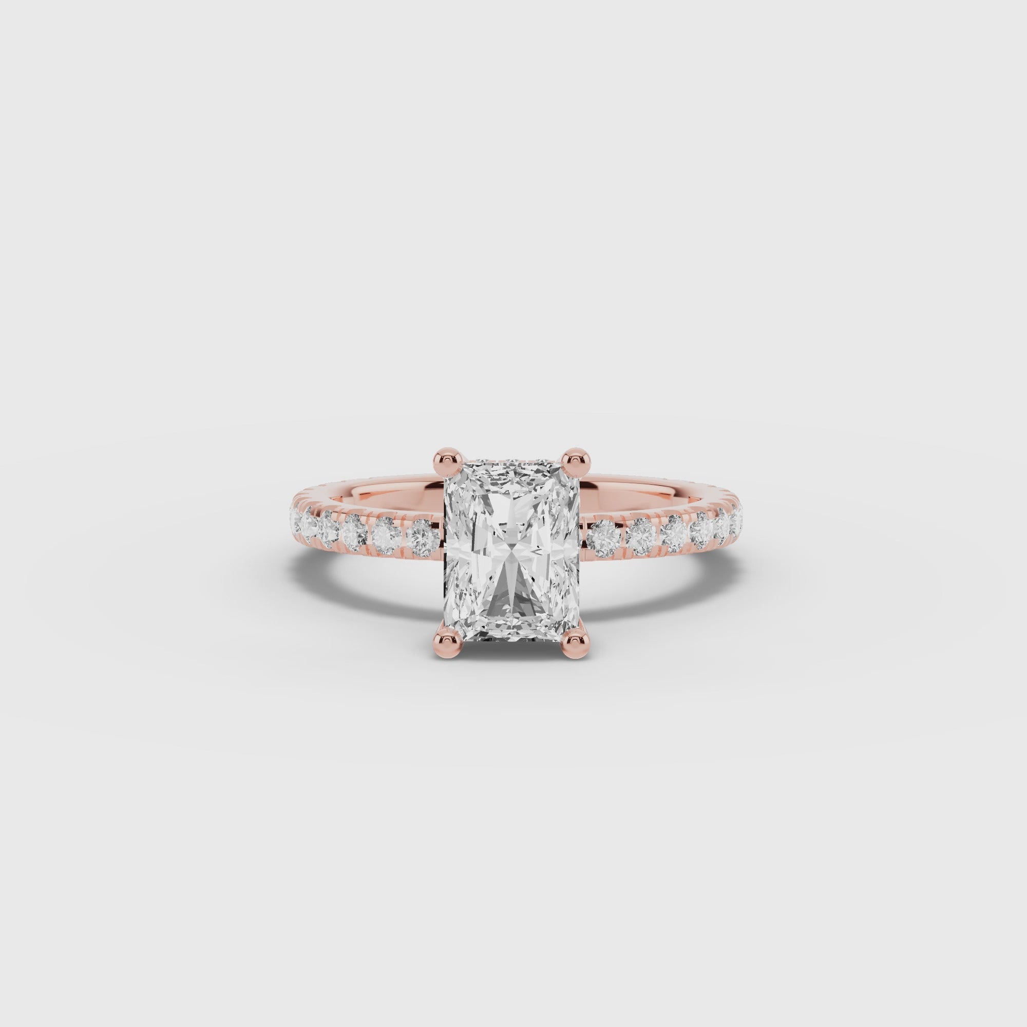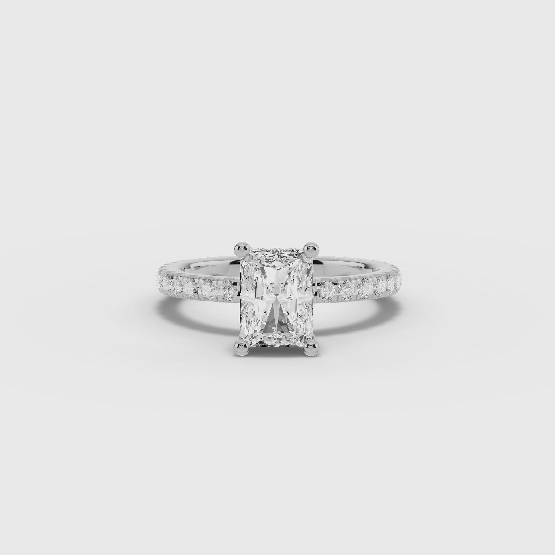 The Coronet Diamond Crown Engagement Ring is a timeless expression of brilliance and grace. Featuring a pavé diamond-adorned band with prong-set stones, this design radiates light from every angle while keeping a sleek, elegant profile. The centerpiece is elevated by a delicate crown of diamonds beneath the setting, creating a regal touch that sparkles with every movement.