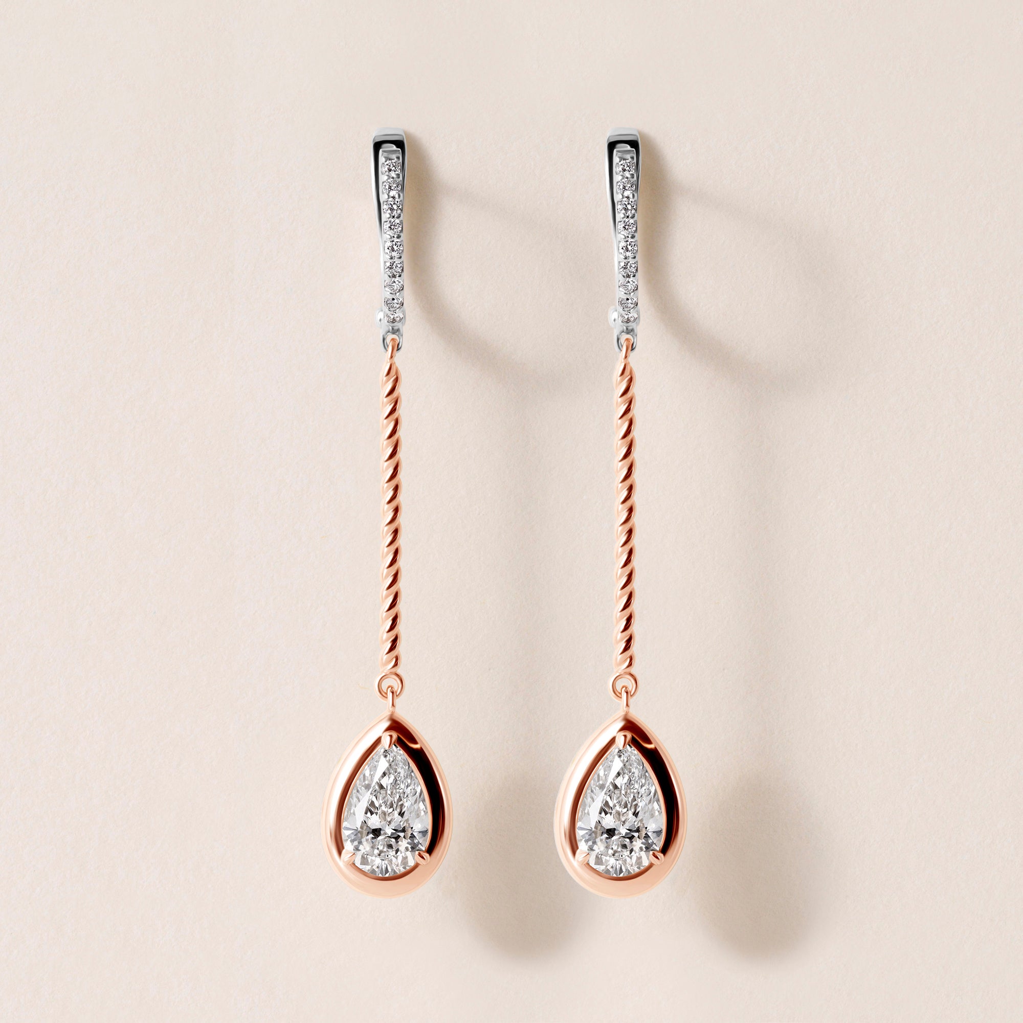 Graceful, dramatic, and endlessly elegant, the Riviera Pear Cascade Drop Earrings bring movement and brilliance to every occasion. Crafted in 14K gold with a two-tone design for maximum contrast, these earrings feature a twisted rope bar that gently sways with every step, ending in a pear-shaped lab-grown diamond embraced by a bezel-inspired frame.