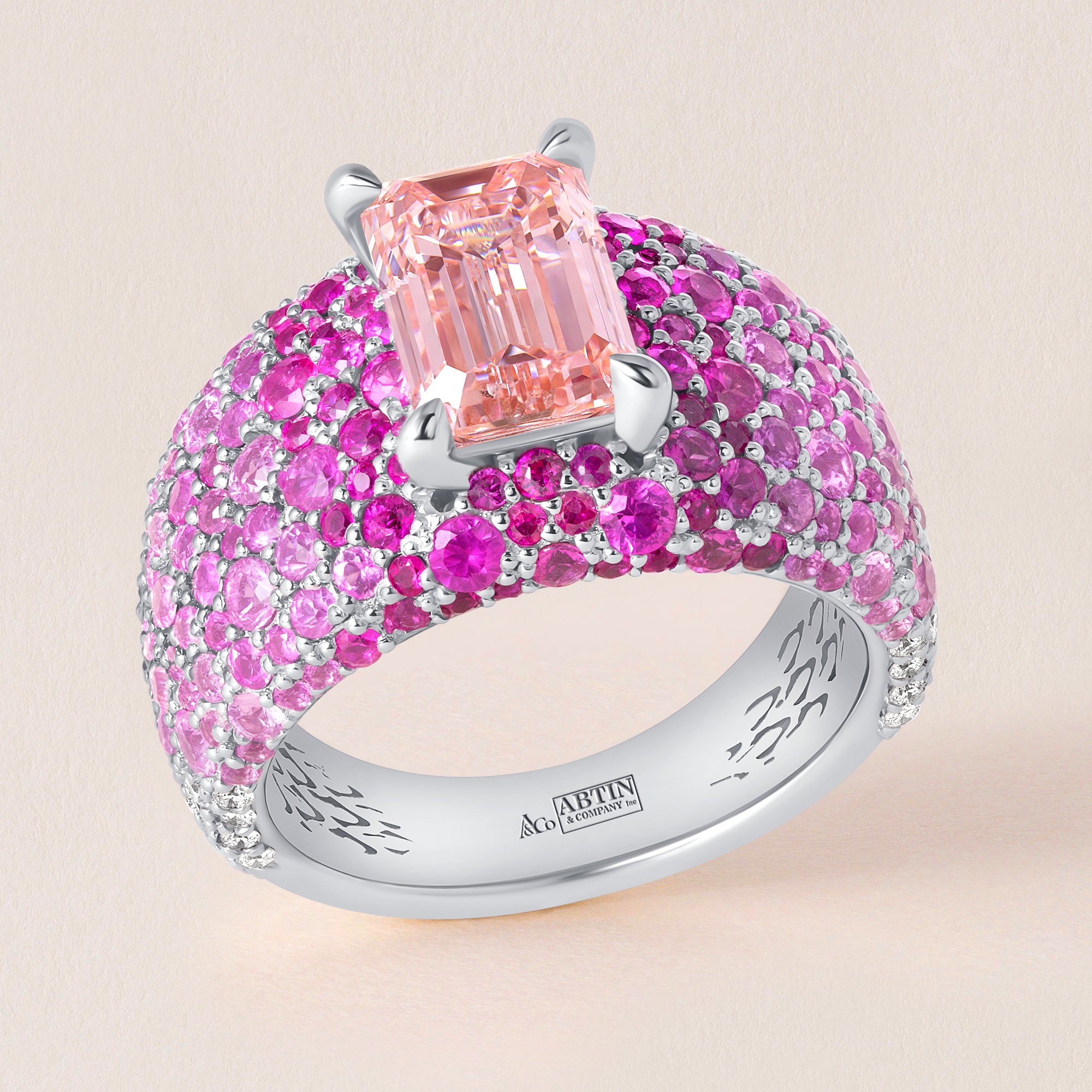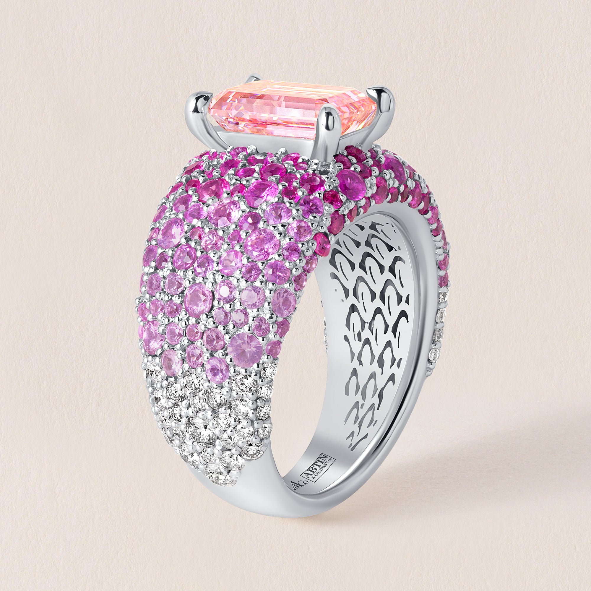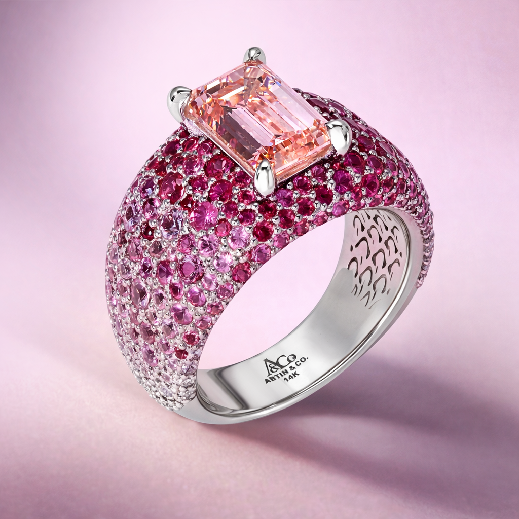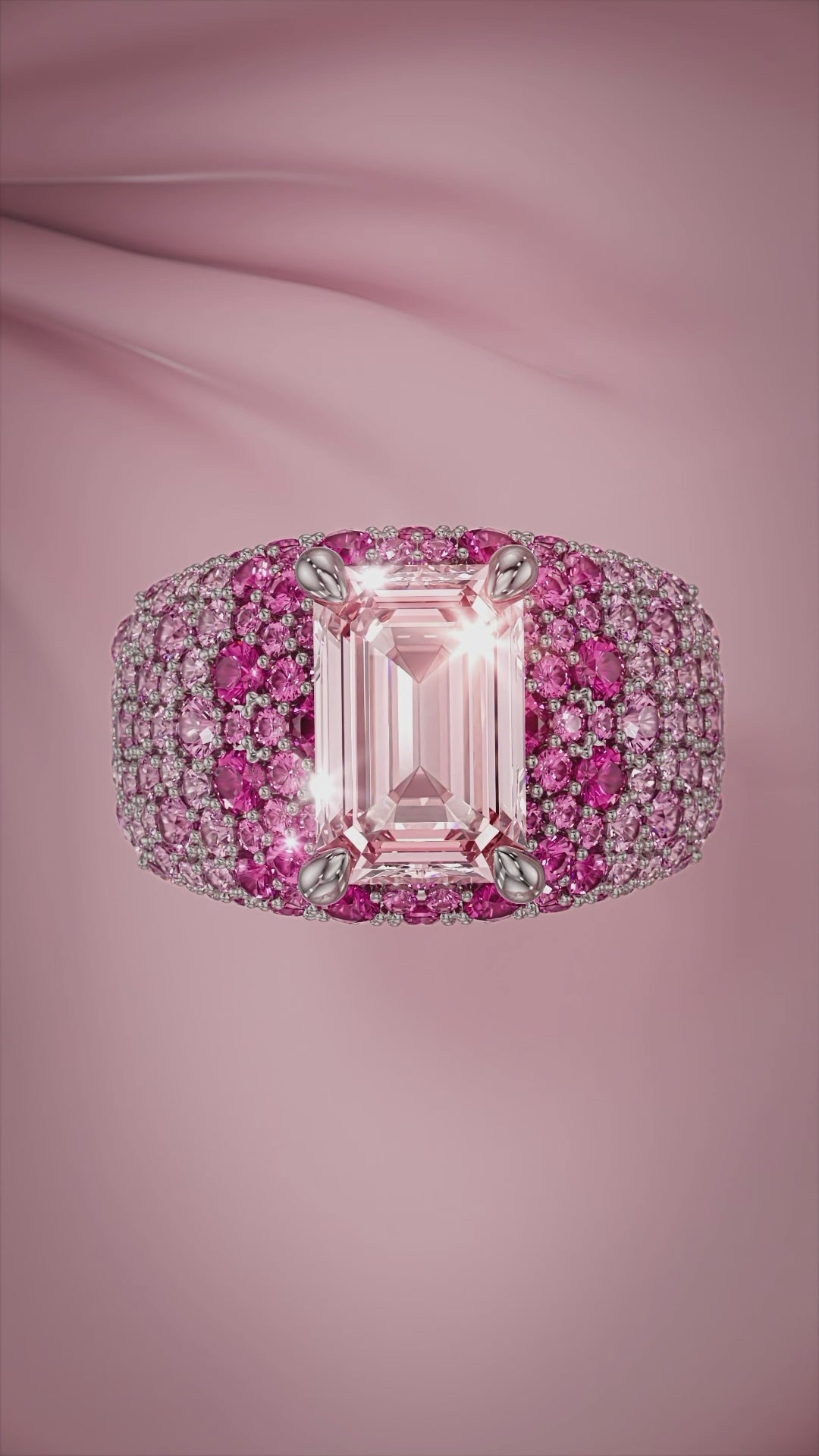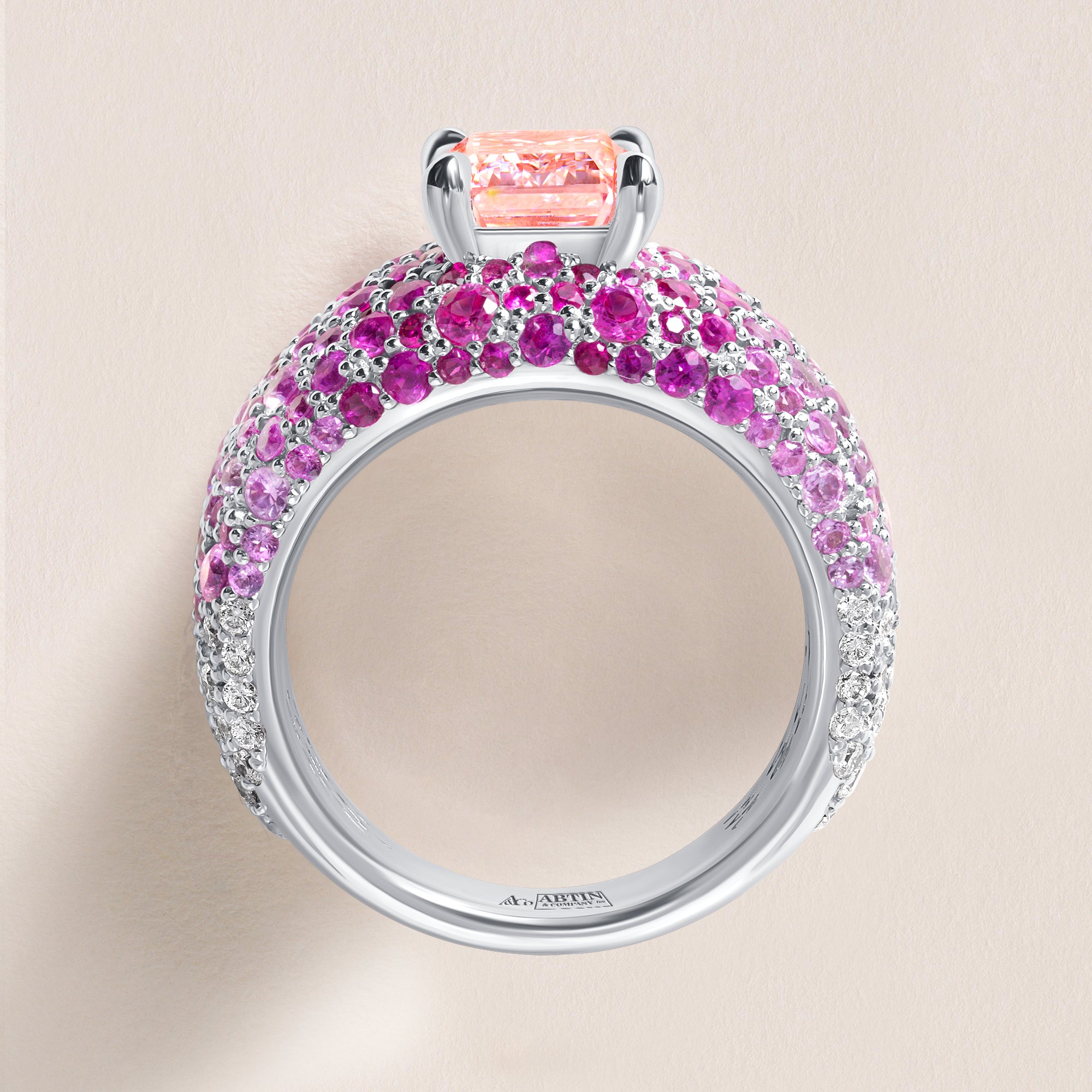 Surrounding the center is an exceptional ombré pavé composition, meticulously executed using three shades of round natural hot pink sapphires, transitioning seamlessly into D-color, VS1 round lab-grown white diamonds. The stones are set in seven different calibrated sizes, each selected and positioned like a puzzle piece. This deliberate variation allows the color to graduate naturally—from deep, saturated pink at the crown, through softer blush tones, and finally into luminous white—creating maximum contrast, dimension, and visual movement.