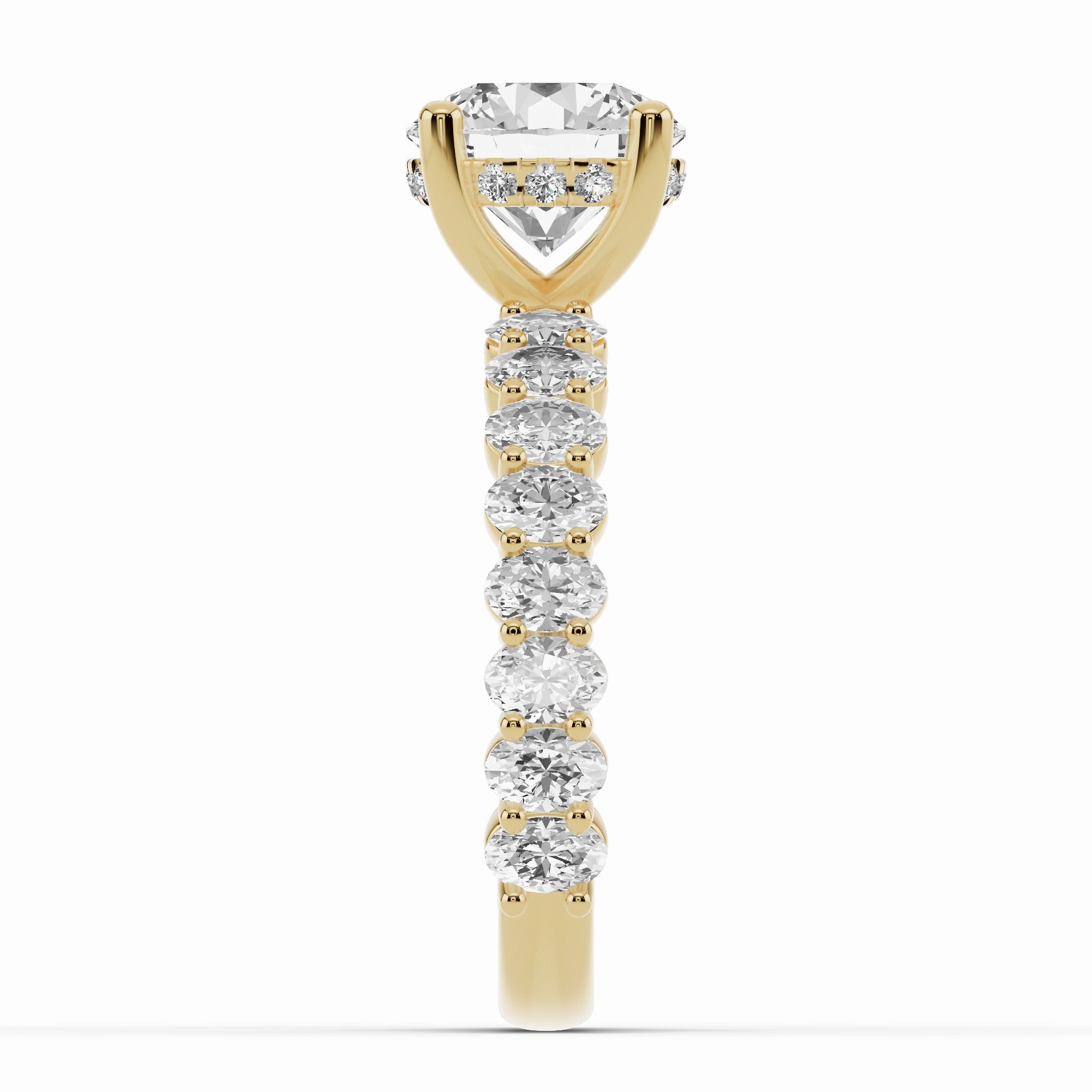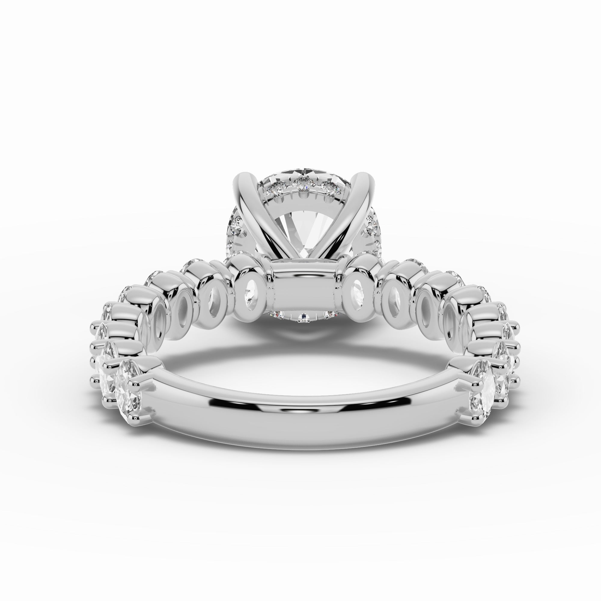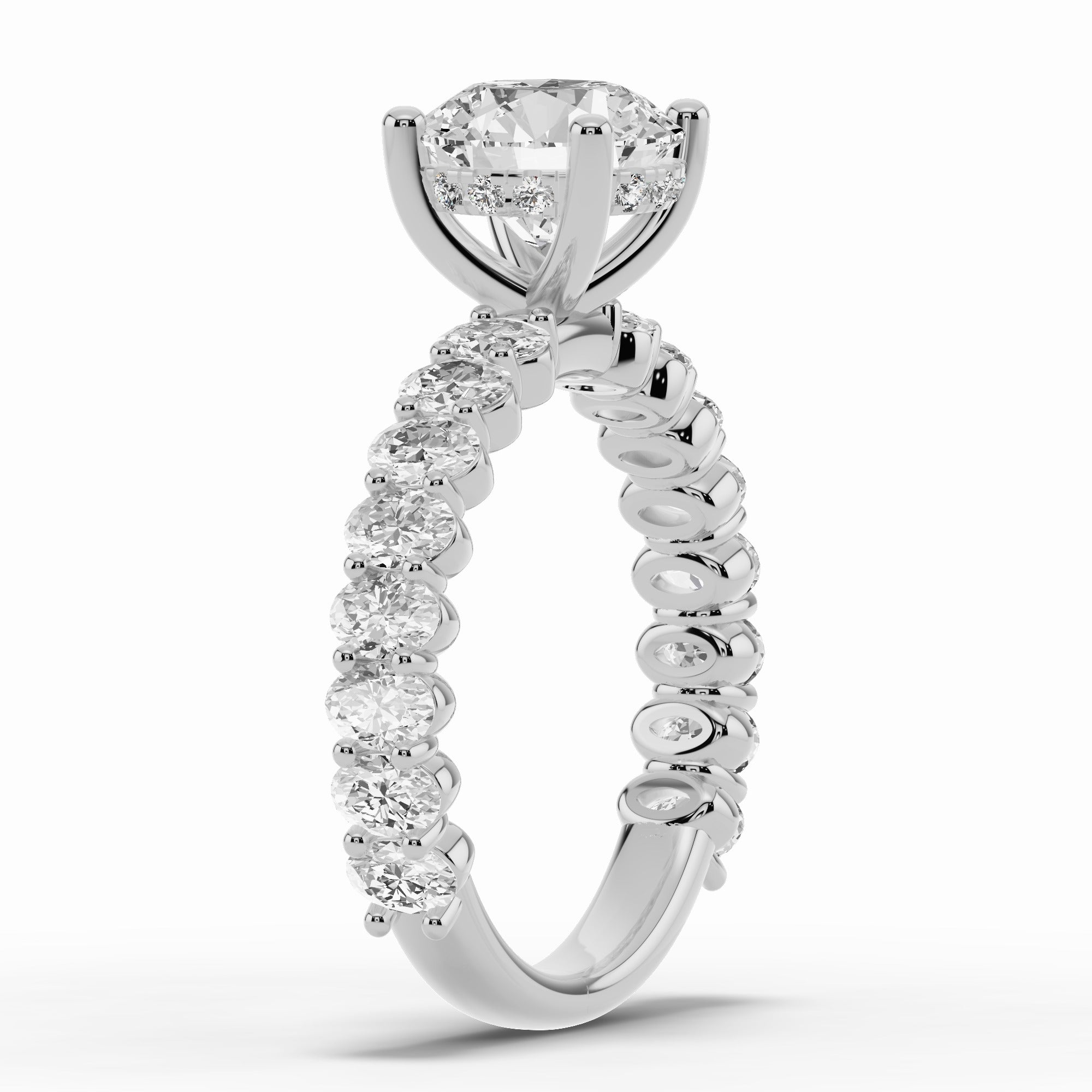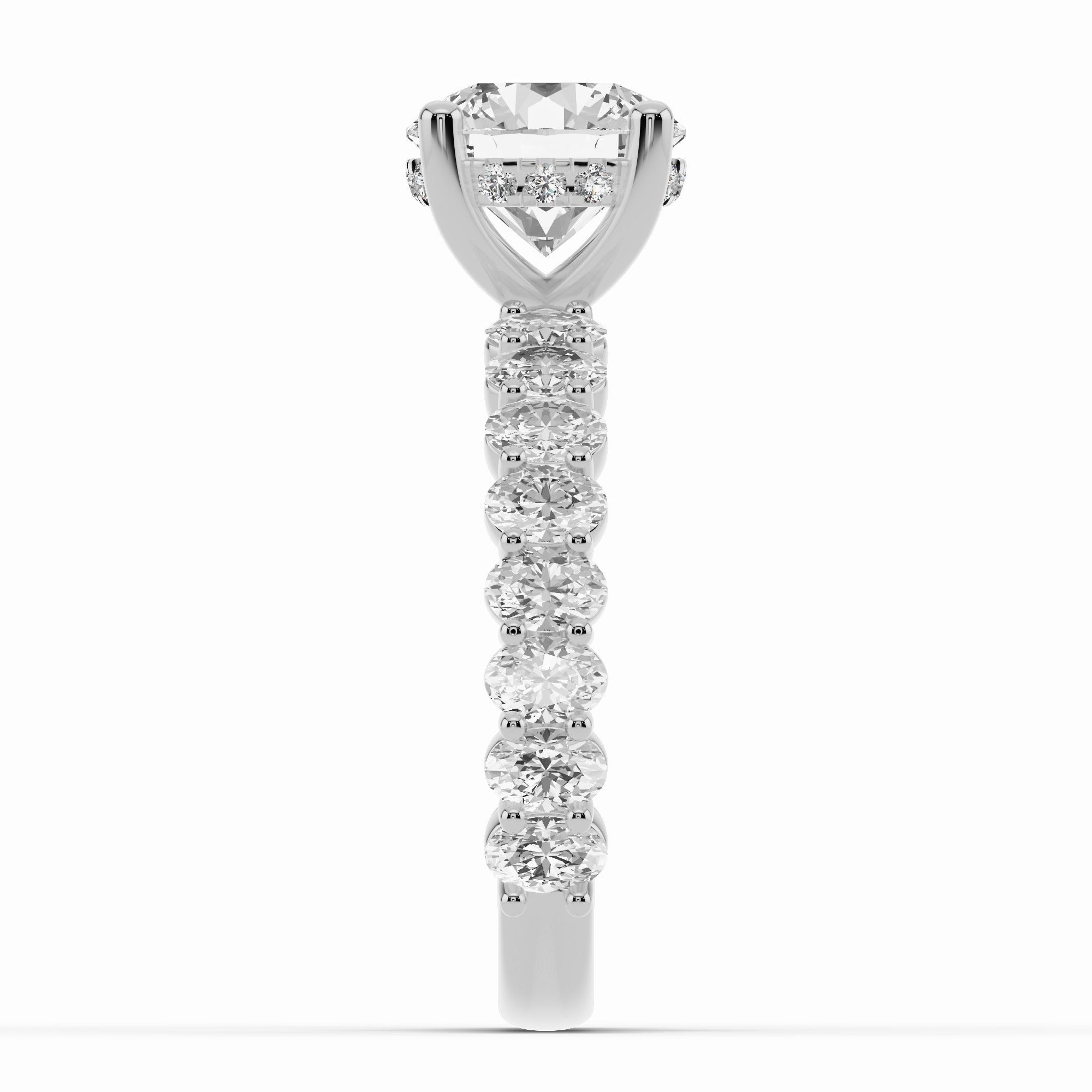 The Aurielle Crown Engagement Ring is a masterpiece of elegance and brilliance, designed for those who love a bold yet refined aesthetic. Its shank is set ¾ of the way around with 16 individually prong-set oval diamonds, creating a striking, elongated look that feels both big and elegant while allowing light to flow through every stone for maximum sparkle.