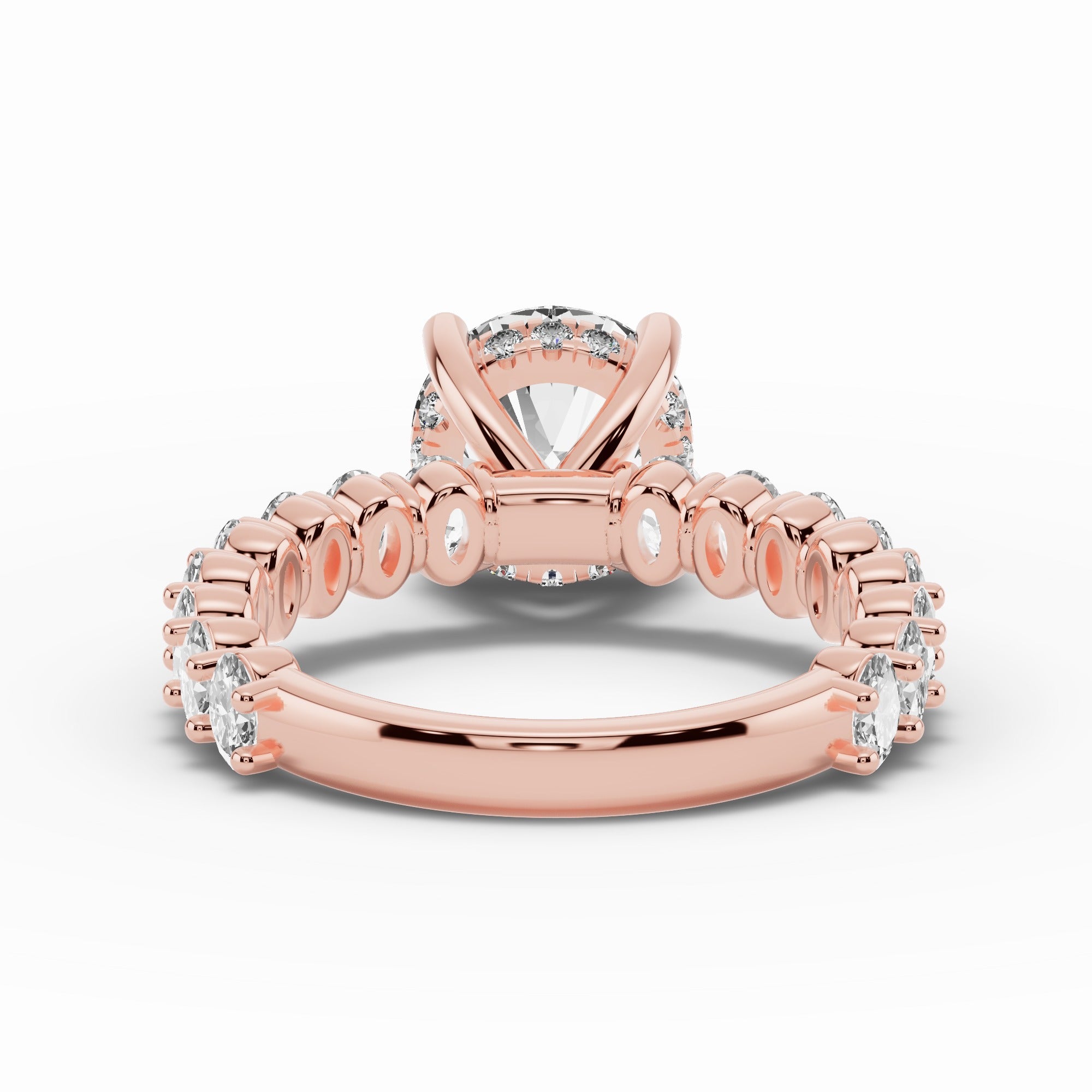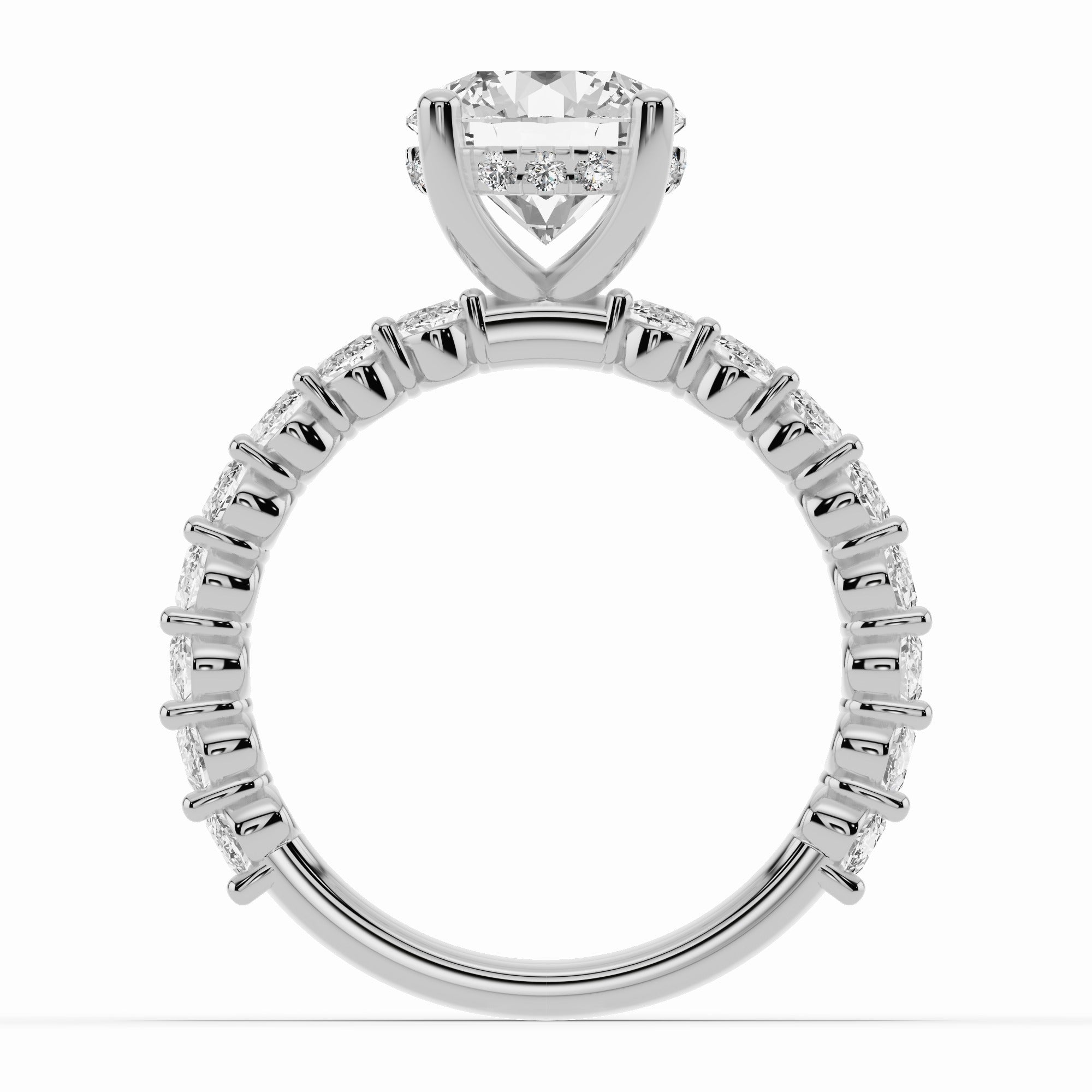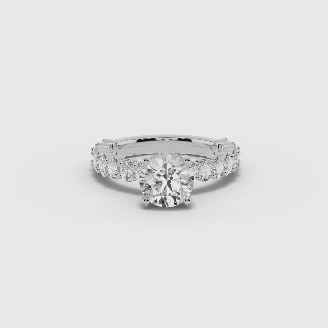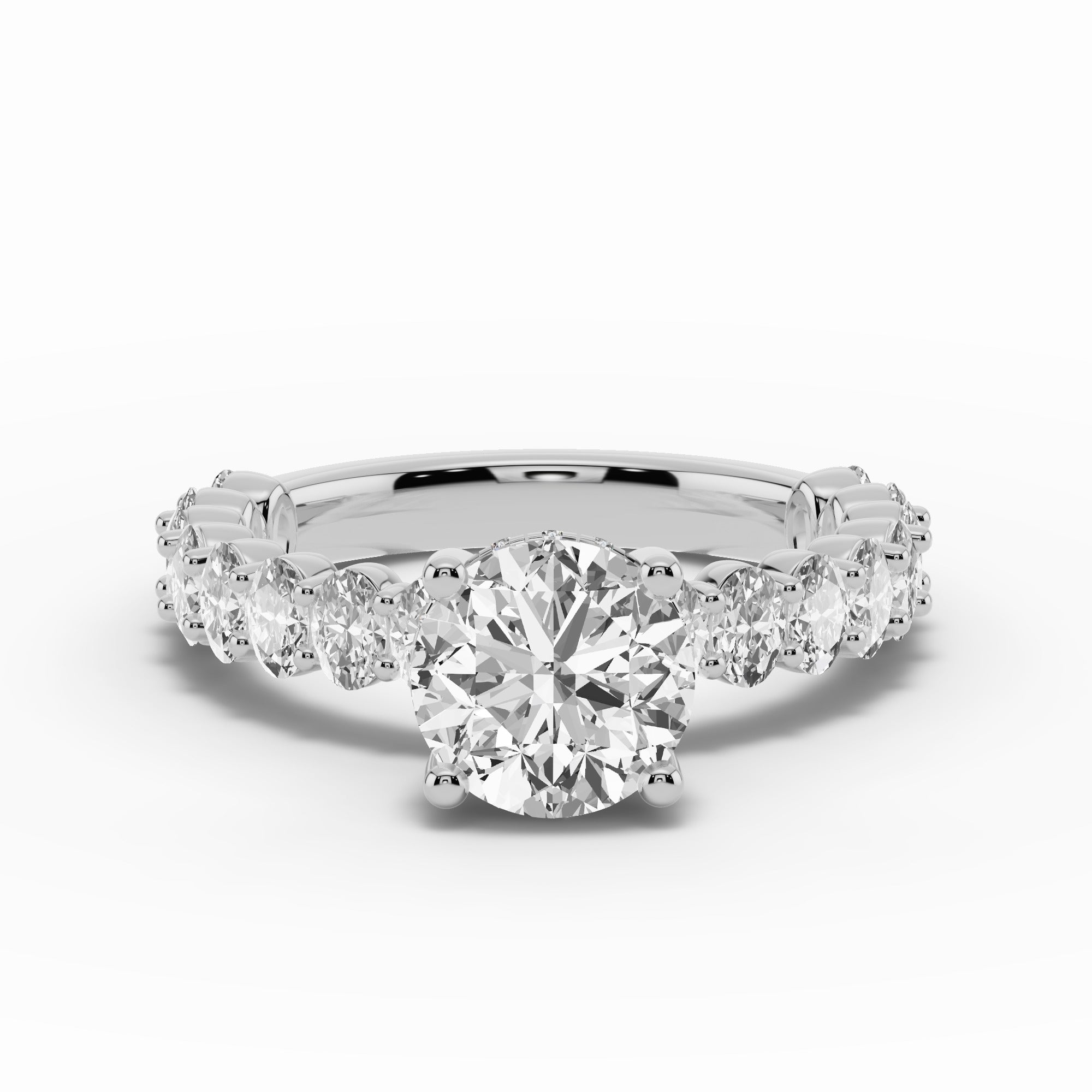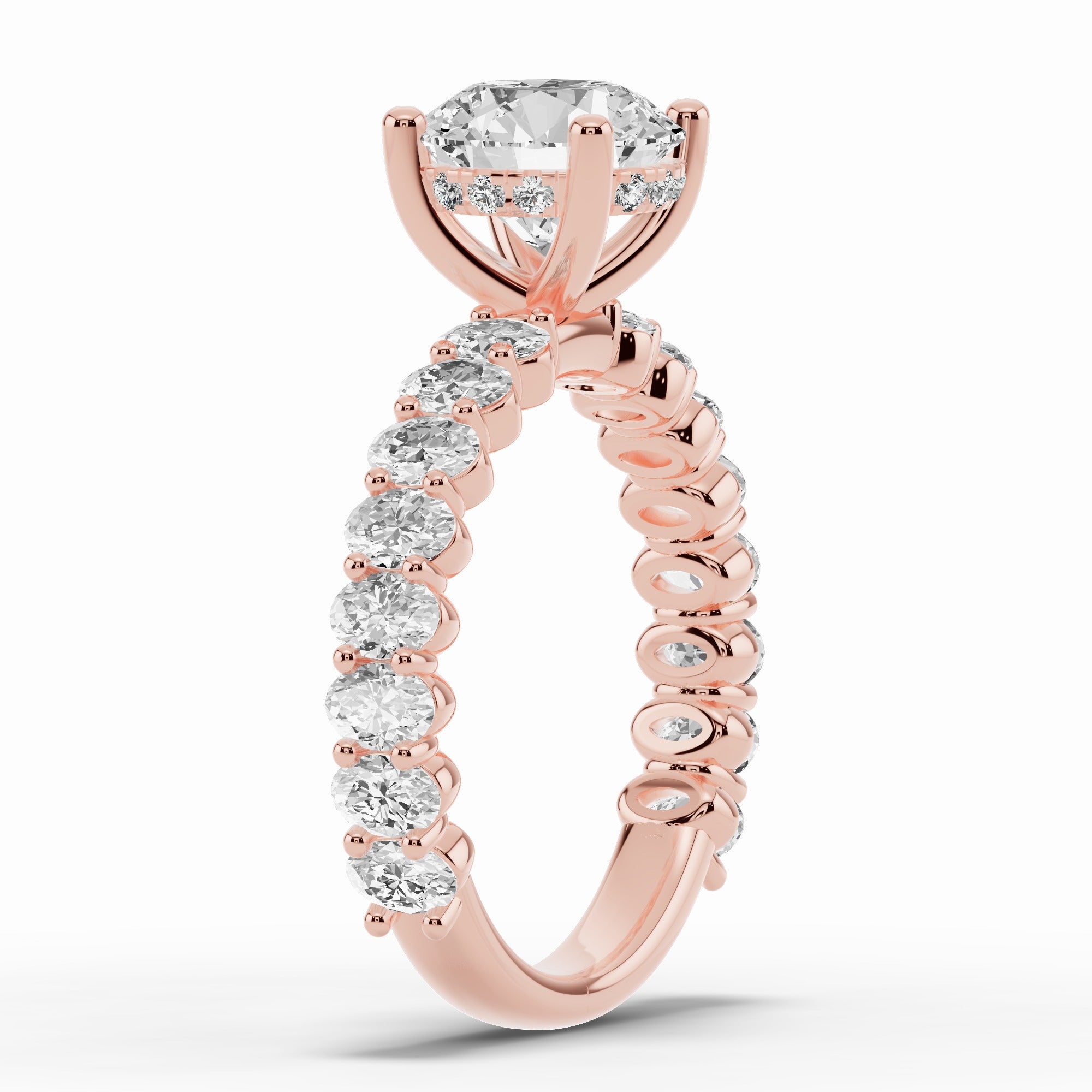 The Aurielle Crown Engagement Ring is a masterpiece of elegance and brilliance, designed for those who love a bold yet refined aesthetic. Its shank is set ¾ of the way around with 16 individually prong-set oval diamonds, creating a striking, elongated look that feels both big and elegant while allowing light to flow through every stone for maximum sparkle.