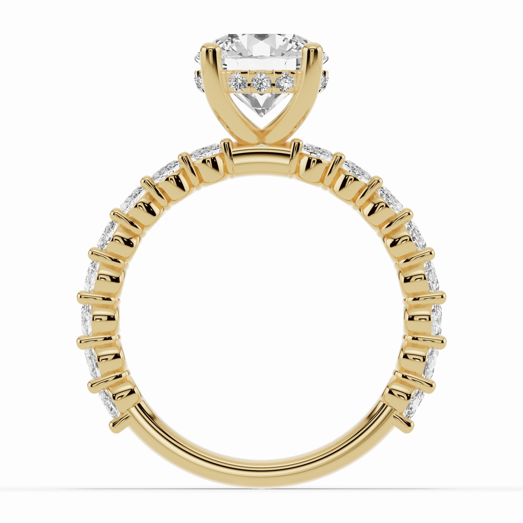 The centerpiece is elevated by a delicate diamond crown beneath the setting, adding a hidden layer of brilliance that catches the light with every movement. The head can be fully customized with any diamond shape — round, oval, emerald, pear, or marquise — allowing you to create a ring that perfectly reflects your style.