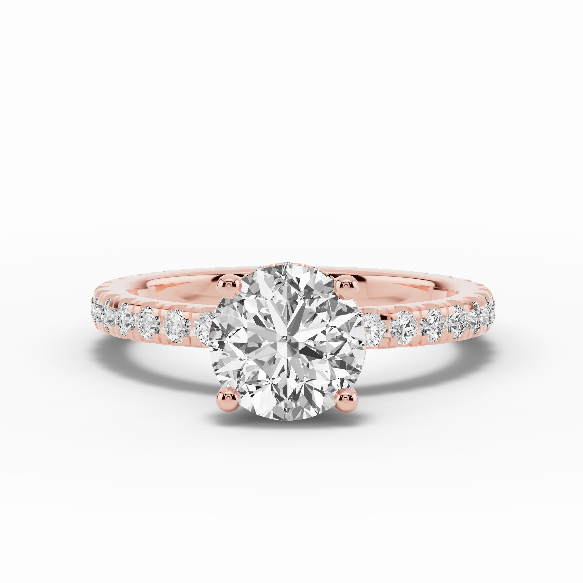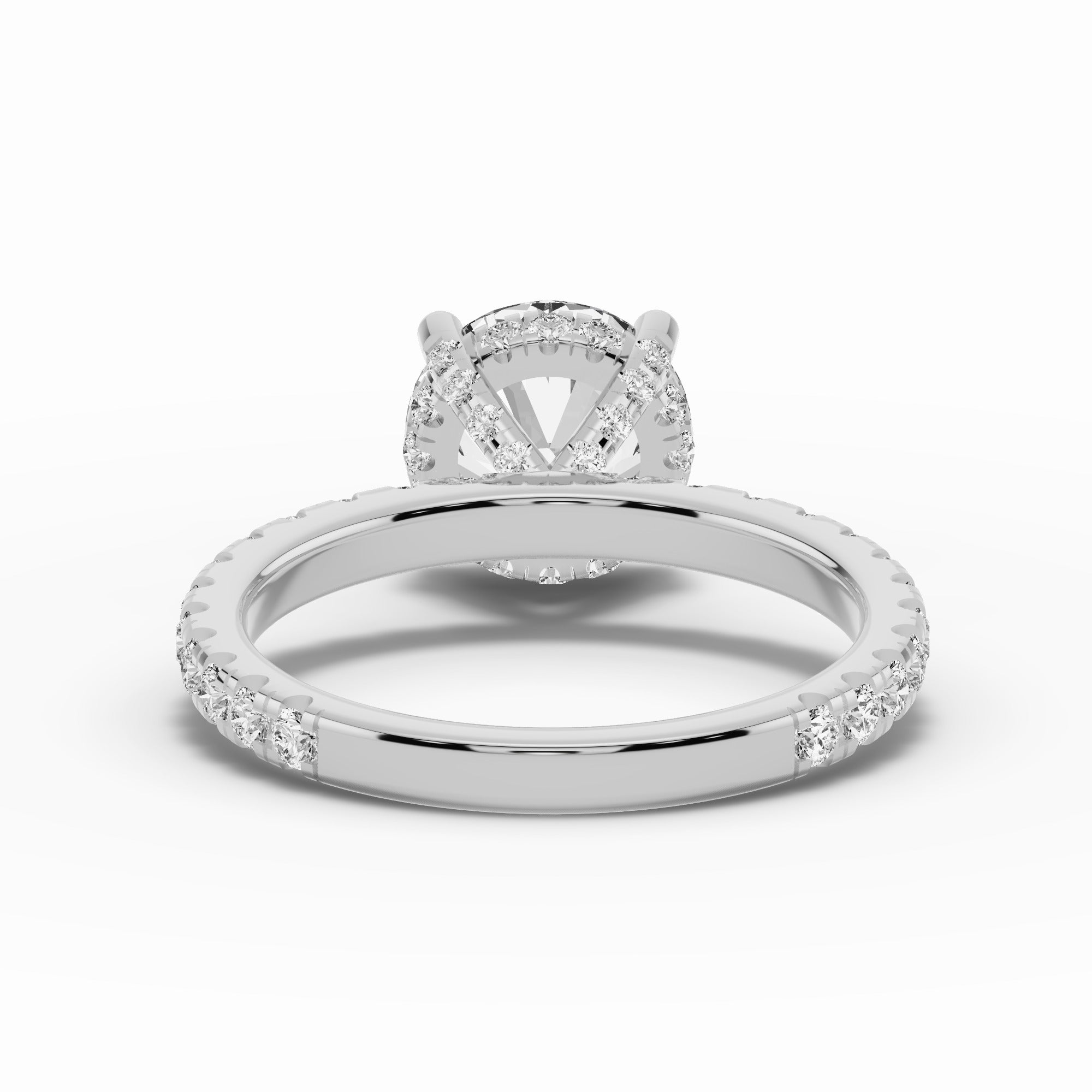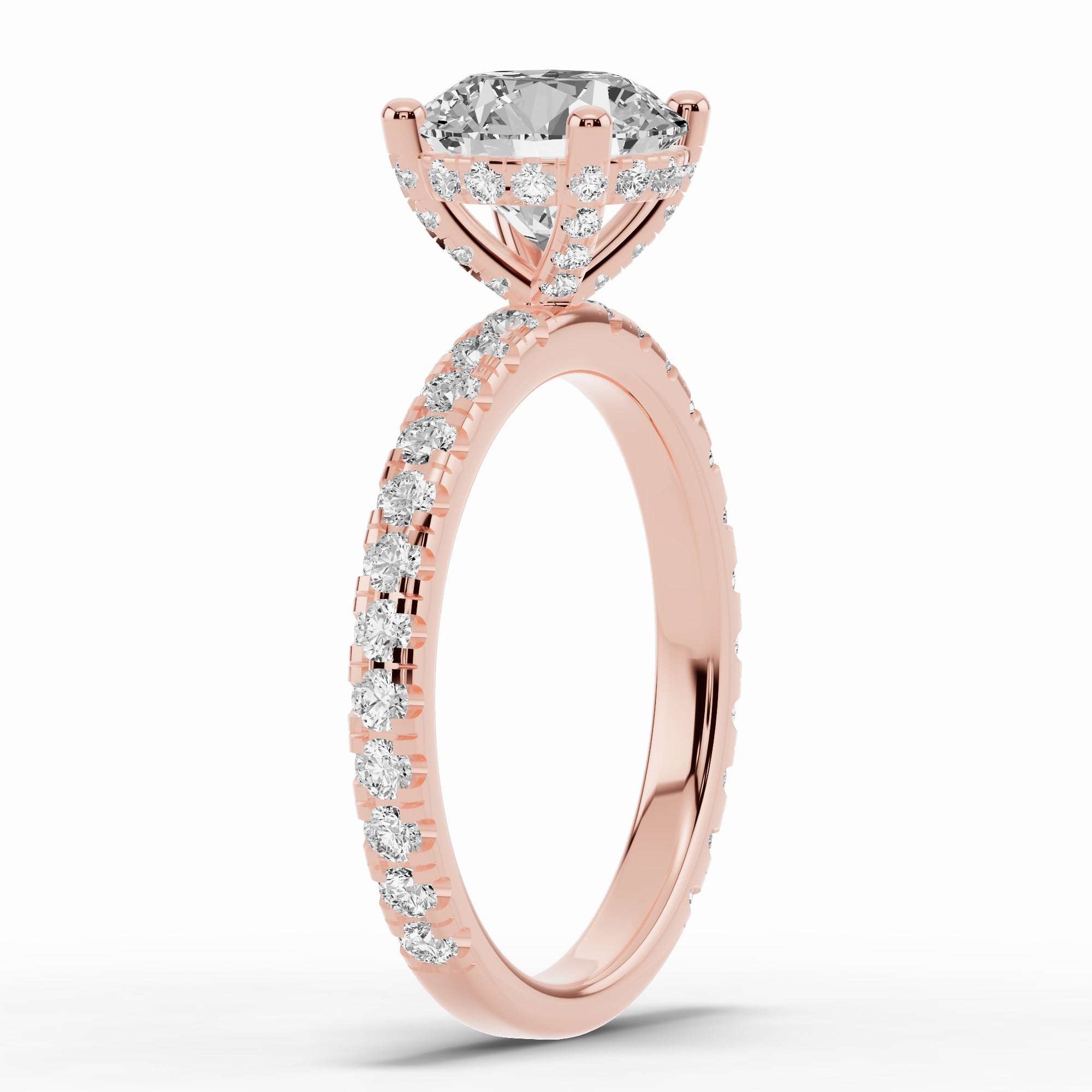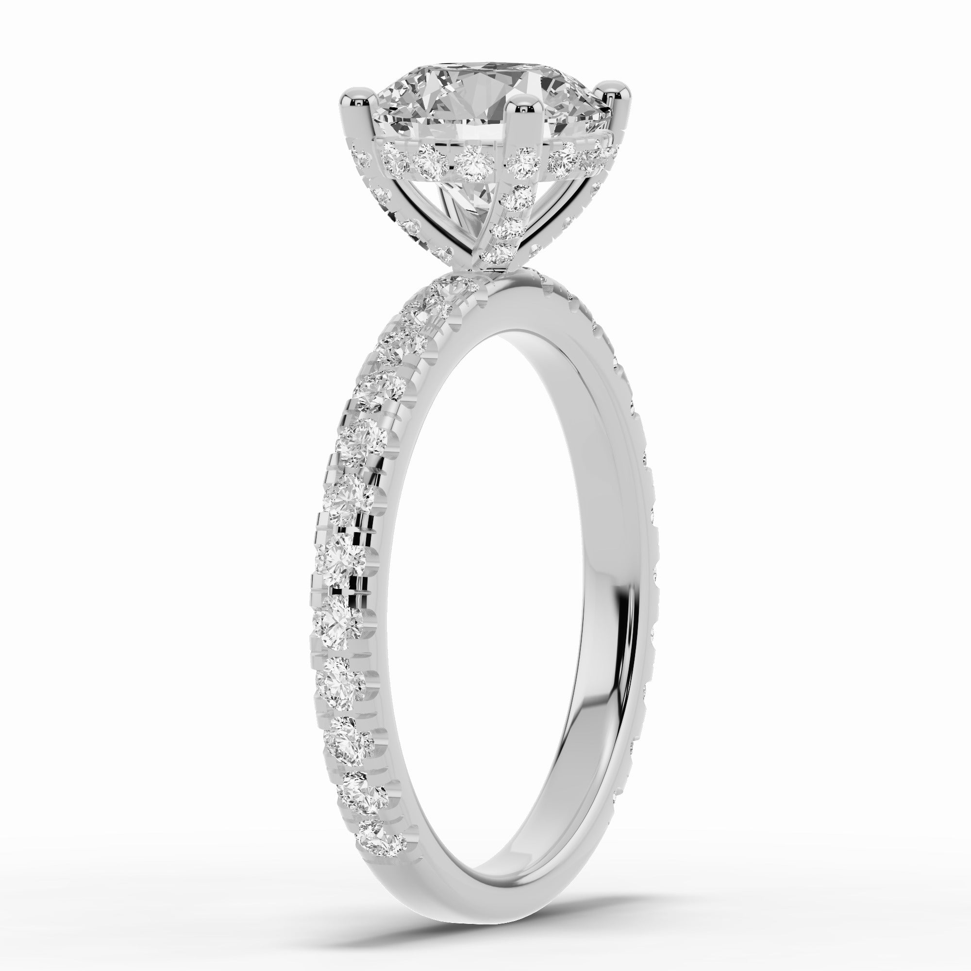 The Coronet Diamond Crown Engagement Ring is a timeless expression of brilliance and grace. Featuring a pavé diamond-adorned band with prong-set stones, this design radiates light from every angle while keeping a sleek, elegant profile. The centerpiece is elevated by a delicate crown of diamonds beneath the setting, creating a regal touch that sparkles with every movement.