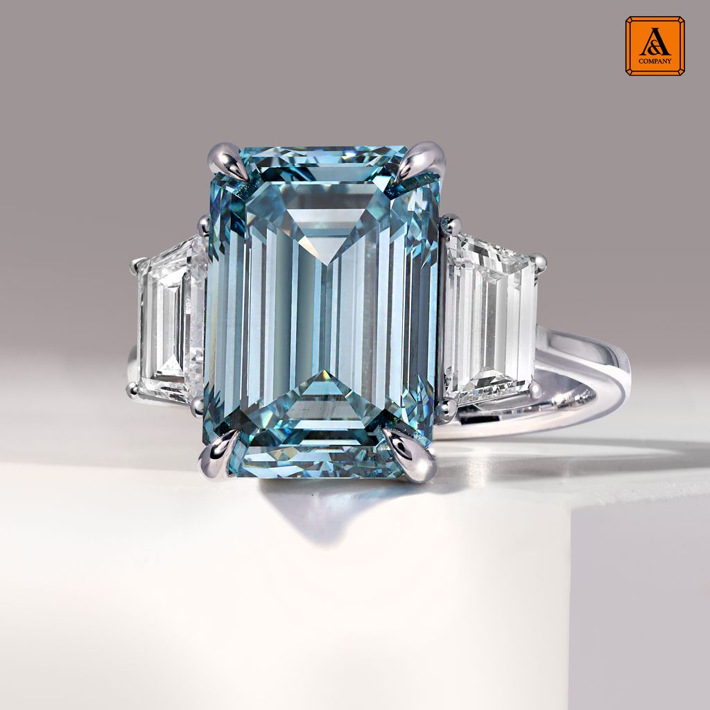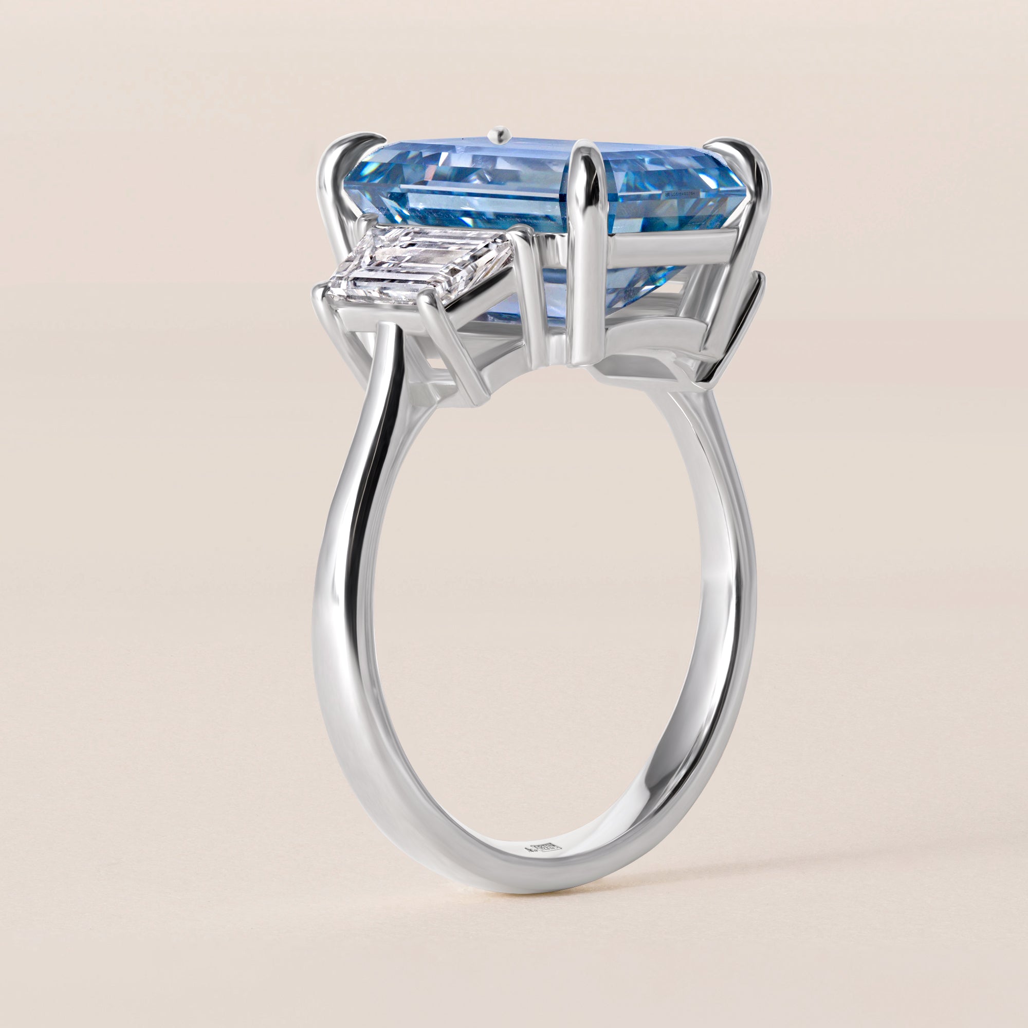 At its center is an extraordinary 7.19-carat emerald-cut lab-grown diamond, Fancy Intense in color, graded VS2 clarity and IGI certified. Chosen for its remarkable size, saturated hue, and crisp linear brilliance, the center stone defines the ring’s identity. Its elongated emerald cut delivers a sense of architectural elegance and refined power, creating a presence that immediately draws the eye and holds it—effortlessly commanding attention in both scale and sophistication.