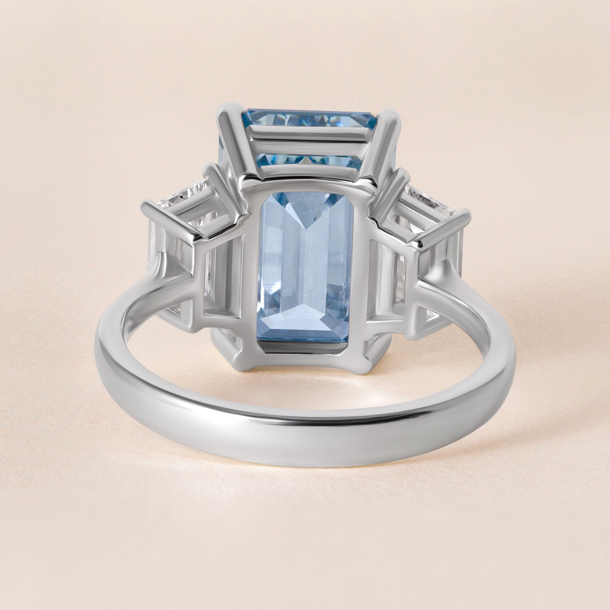 Flanking the center are two trapezoid-cut lab-grown diamonds, selected for their rarity and precision match. Each side stone weighs approximately 0.50 carats, with a combined total weight of 1.07 carats, graded E color and VVS2 clarity. Their sharp geometry and tapered silhouette frame the center diamond with balance and intention, enhancing its brilliance while reinforcing the ring’s clean, architectural symmetry.
