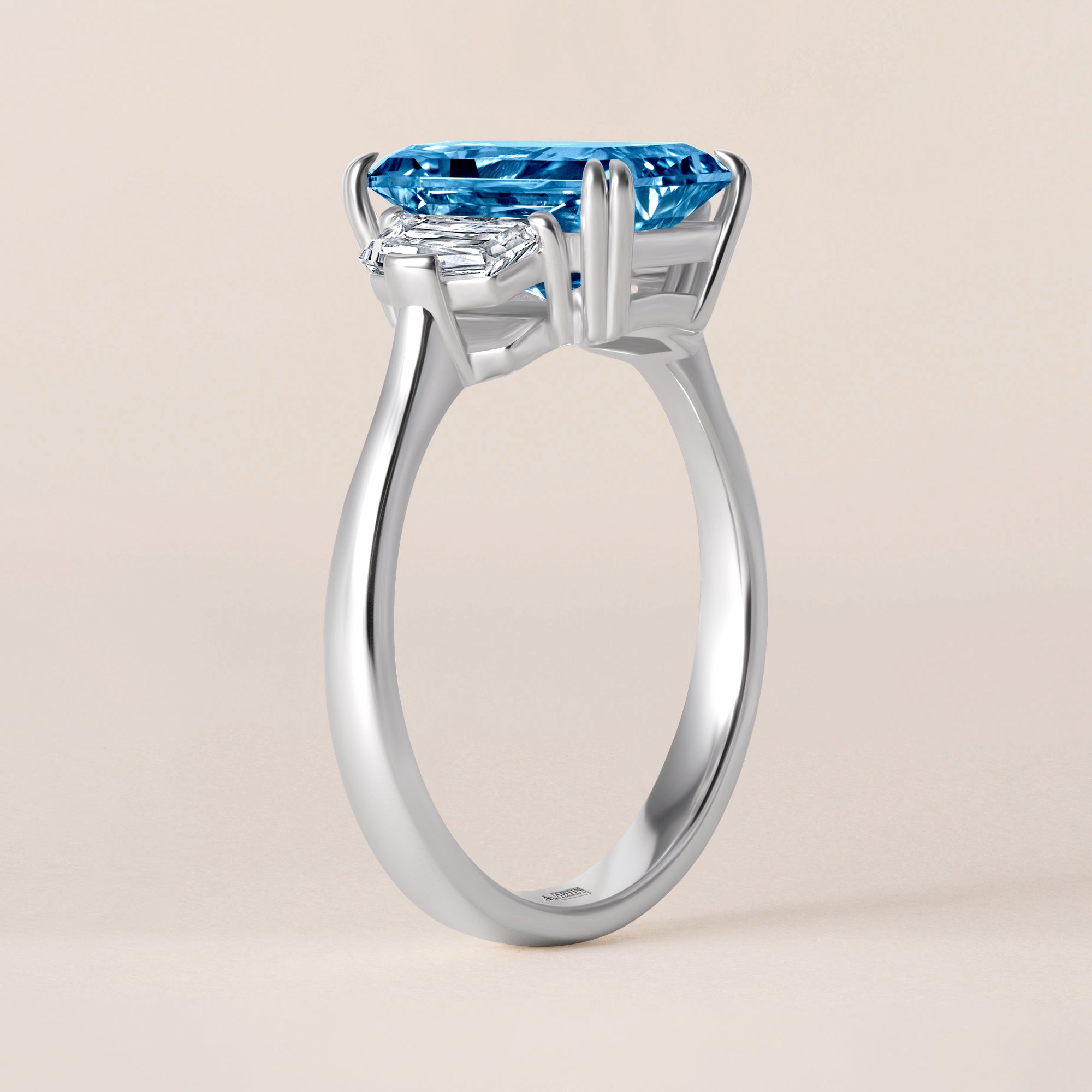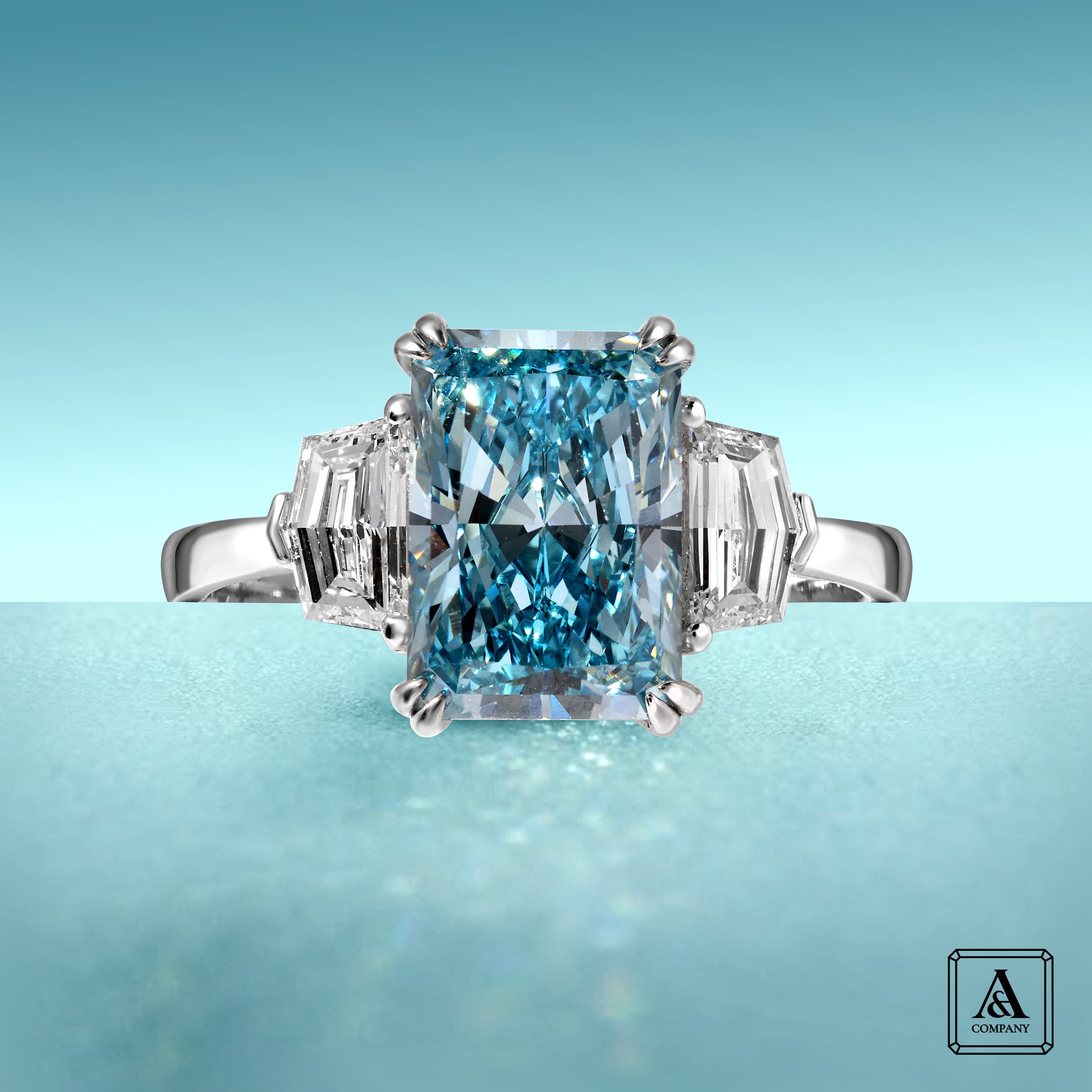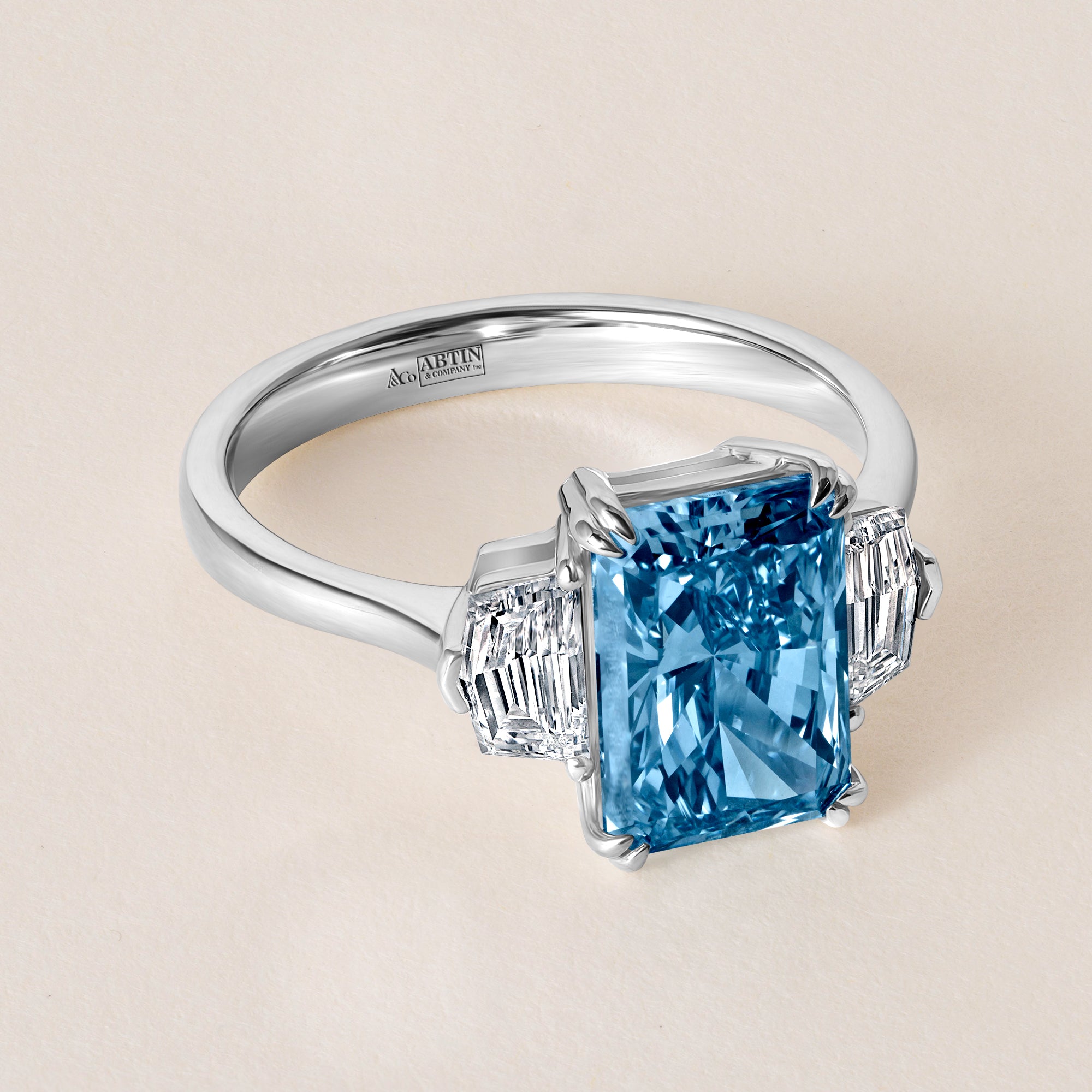 At its center is a radiant-cut fancy vivid blue lab-grown diamond, selected first for its commanding geometry and then for its exceptional chromatic intensity. Weighing 3.03 carats, graded VS1 clarity, and IGI certified, the stone’s radiant cut amplifies brilliance while preserving strong linear structure, creating a focal point that is both powerful and refined.