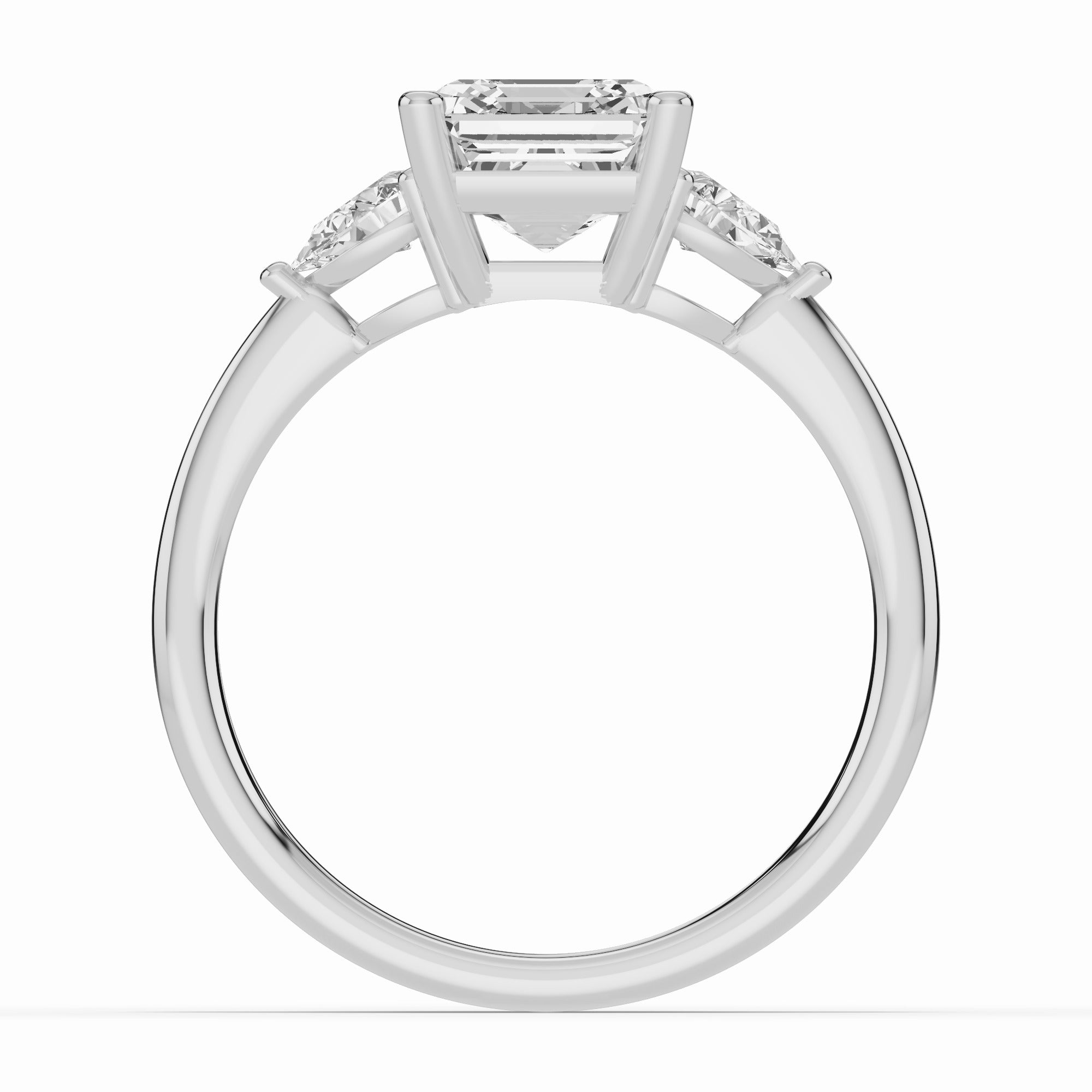 The Vionne Three-Stone Engagement Ring is a celebration of elegance and artistry, designed for those who desire a distinctive and romantic look. Featuring a center diamond flanked by two perfectly matched pear-shaped side stones, this design symbolizes the past, present, and future of your love story. The pear accents add a soft, graceful silhouette that enhances the brilliance of the center stone while elongating the finger beautifully.