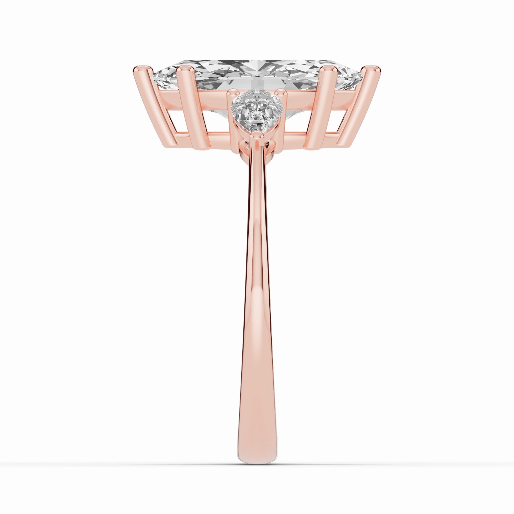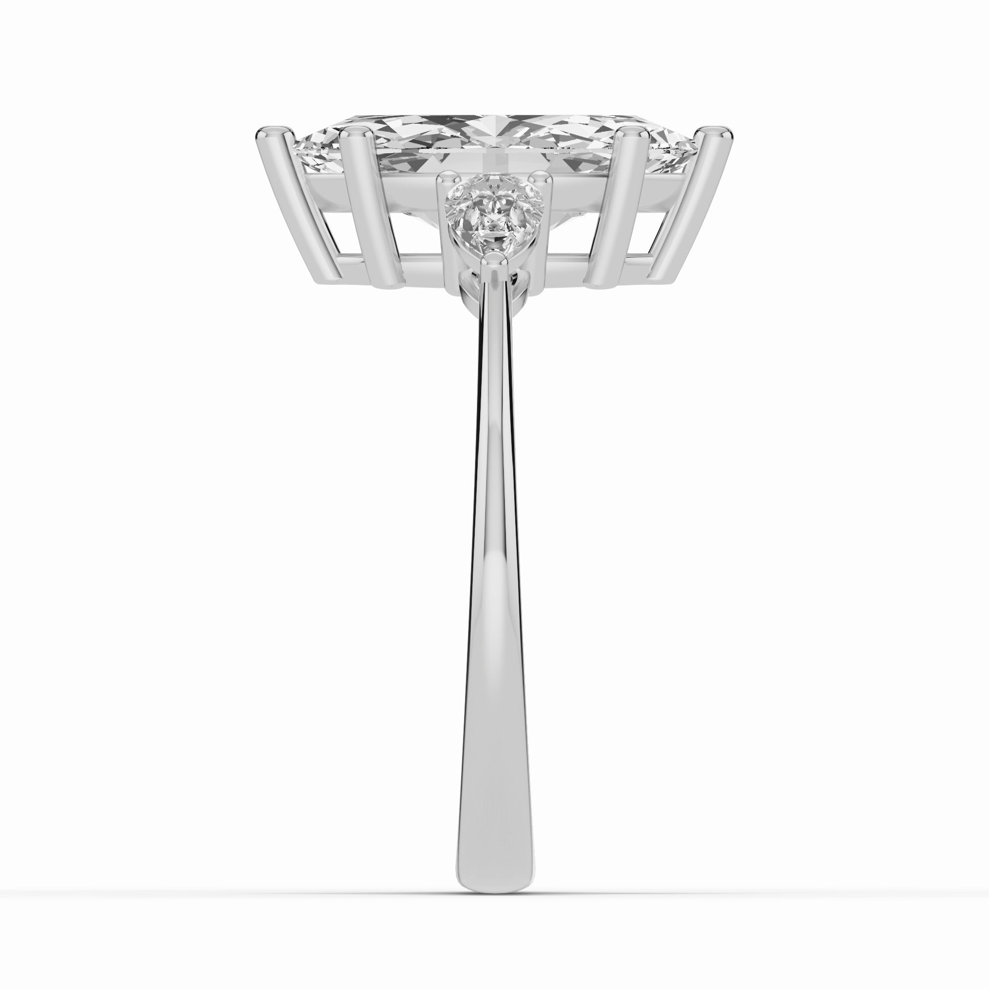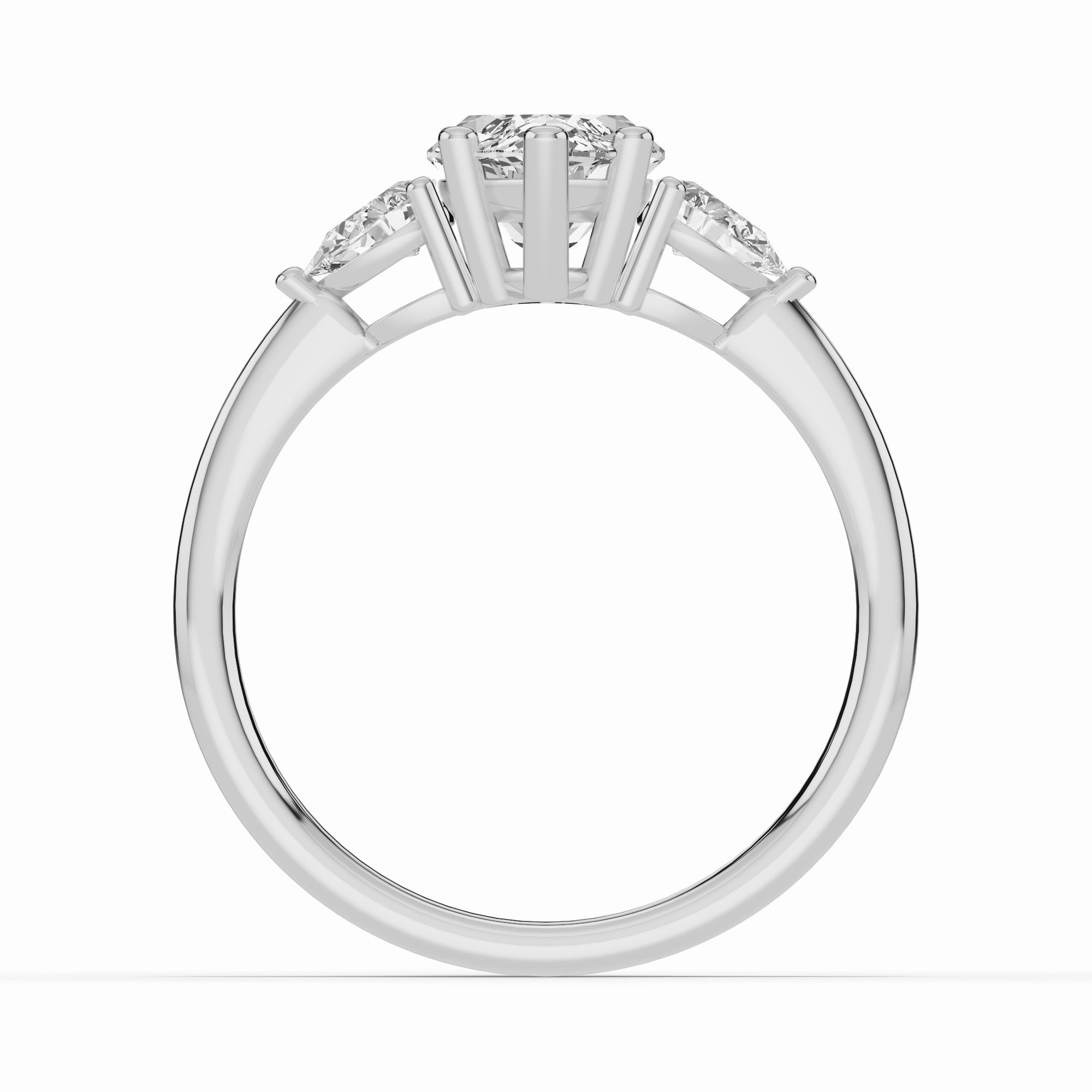 The Vionne Three-Stone Engagement Ring is a celebration of elegance and artistry, designed for those who desire a distinctive and romantic look. Featuring a center diamond flanked by two perfectly matched pear-shaped side stones, this design symbolizes the past, present, and future of your love story. The pear accents add a soft, graceful silhouette that enhances the brilliance of the center stone while elongating the finger beautifully.